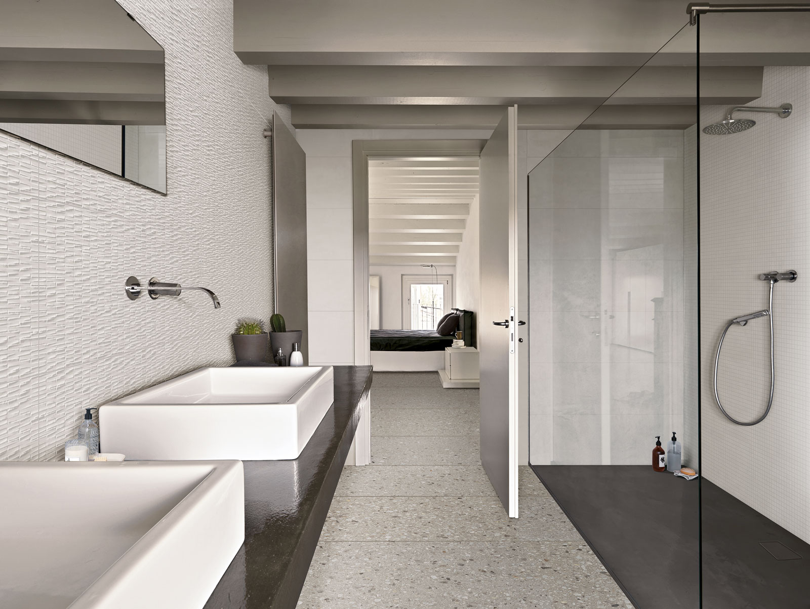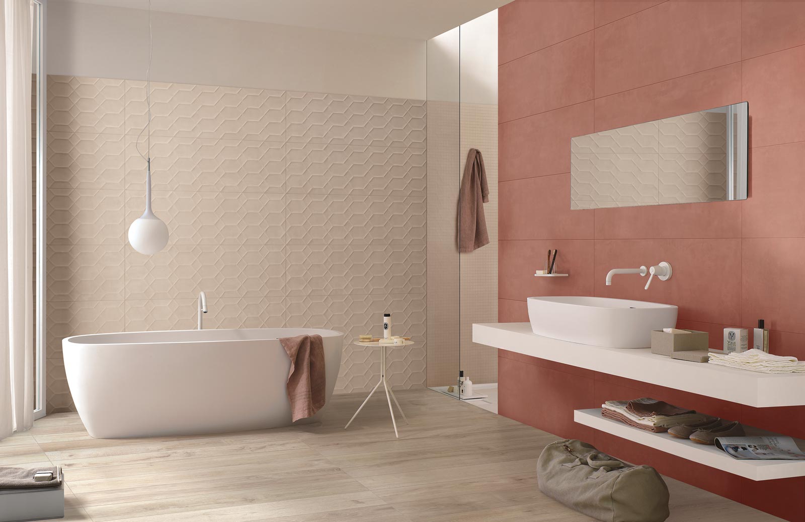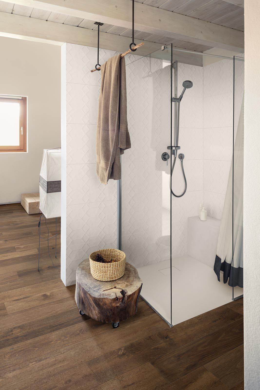 In this article we will concentrate on material looks and the 3D surfaces for bathroom wall tiles, but you can also use the solutions we suggest in the kitchen, living-room and bedroom.