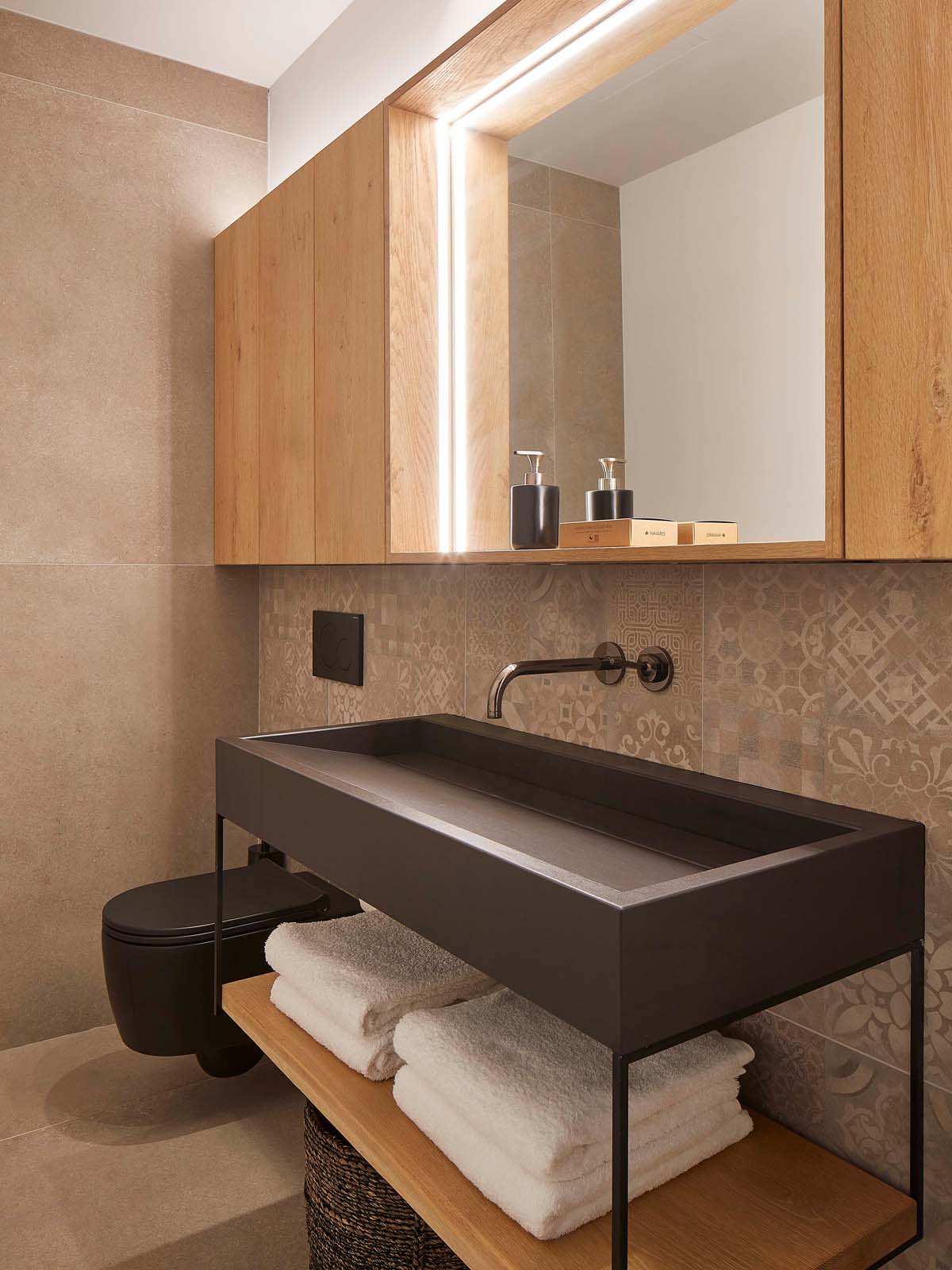 The only break in this uniformity is one of the house’s bathrooms, where a cement tile-effect Decor from the concrete-effect stoneware Studio collection was used in 60×120 cm size to cover the wall behind the washbasin, perfectly matched with the slabs – from the same collection – in solid-color beige finish used on the floor and the other walls.