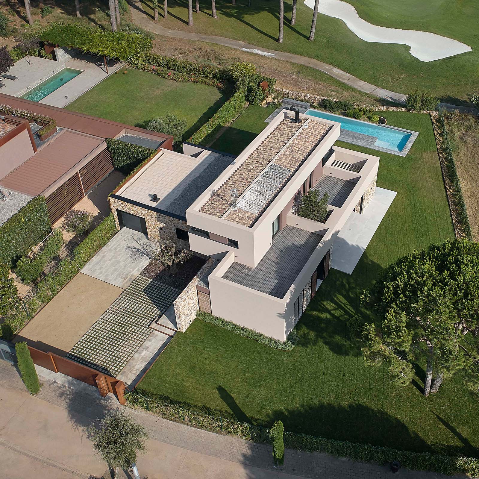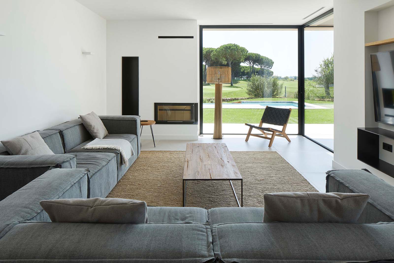 A continuous interplay between outdoor and indoor in which the golf course is never out of sight, not even from the living area surrounded by large modern windows that flood the entire house with light.
