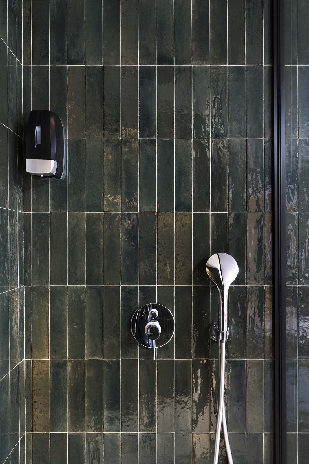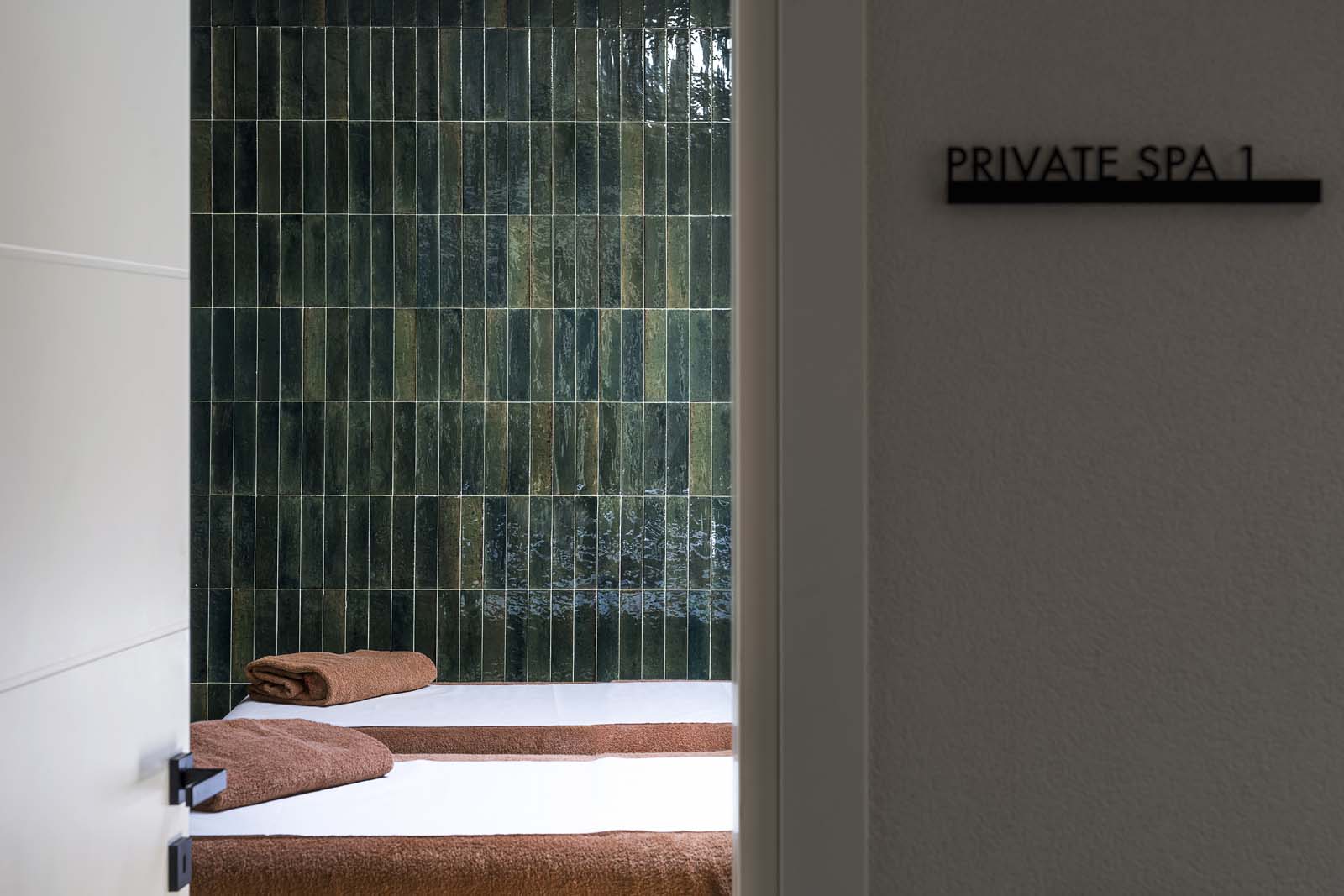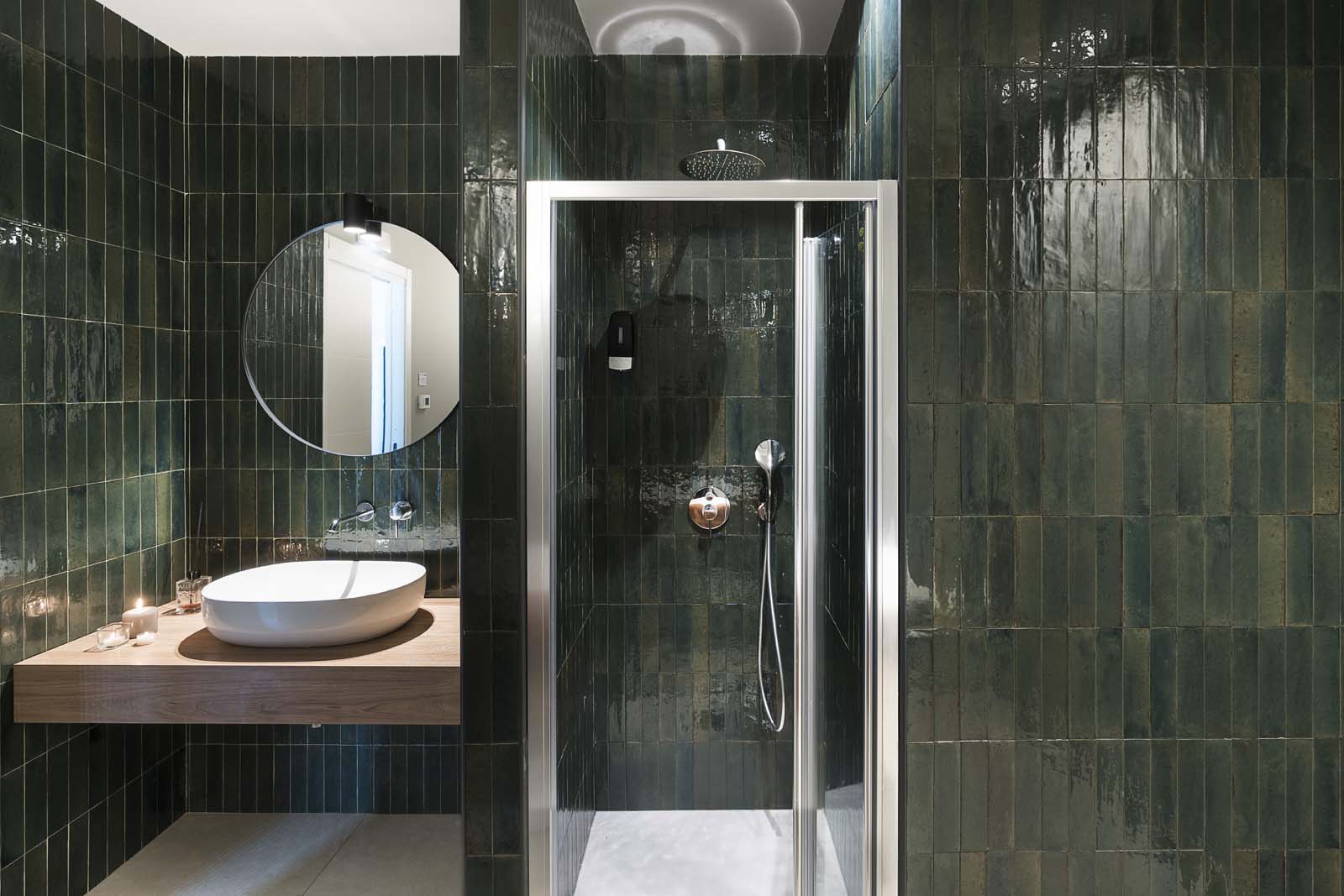 “Bright colors that reference nature provide the background for massages and treatments in the cabins and private spas, in the alternating green and blue shades of the Look series.” In 6×24 cm size, these tiles have an ultra-glossy, “flawed” surface that beautifully expresses the elusive mix of elegance and intimacy associated with wellness. The walls of the bathrooms of the hotel bedrooms, on the other hand, were covered with the vibrant resin-look colors of the Resina collection (40×120 cm) in Terracotta and Ardesia colors.