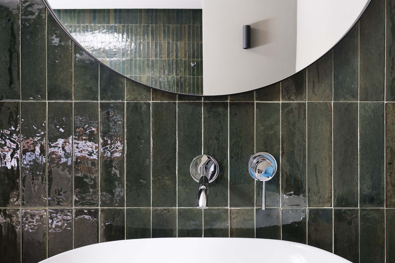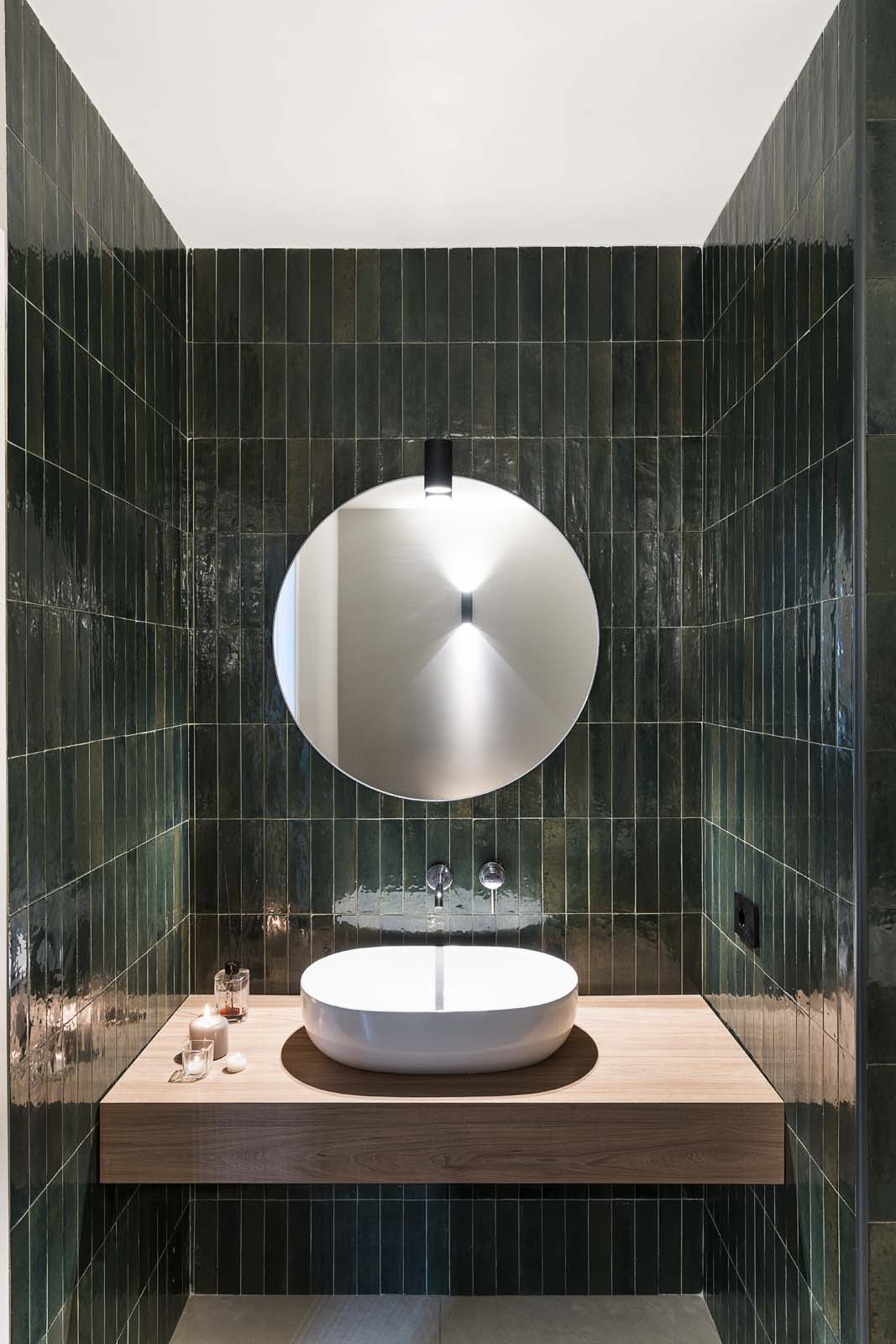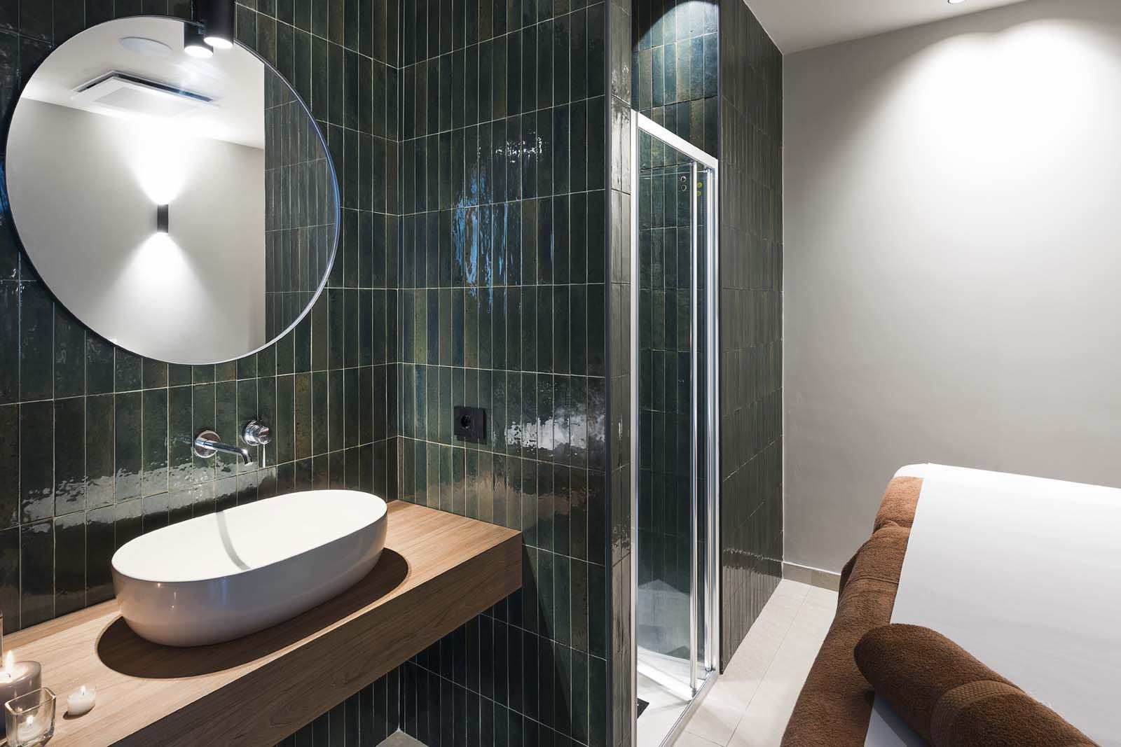 “Bright colors that reference nature provide the background for massages and treatments in the cabins and private spas, in the alternating green and blue shades of the Look series.” In 6×24 cm size, these tiles have an ultra-glossy, “flawed” surface that beautifully expresses the elusive mix of elegance and intimacy associated with wellness. The walls of the bathrooms of the hotel bedrooms, on the other hand, were covered with the vibrant resin-look colors of the Resina collection (40×120 cm) in Terracotta and Ardesia colors.