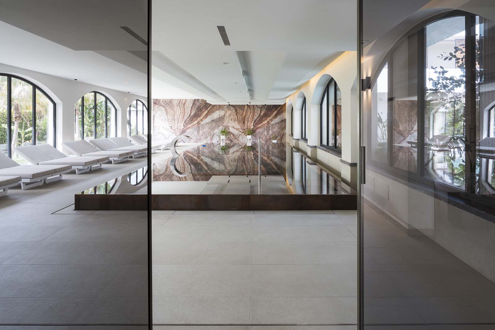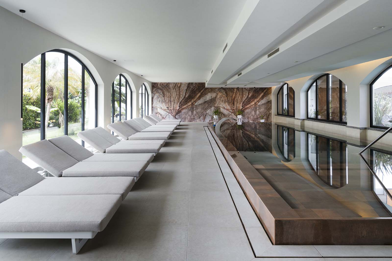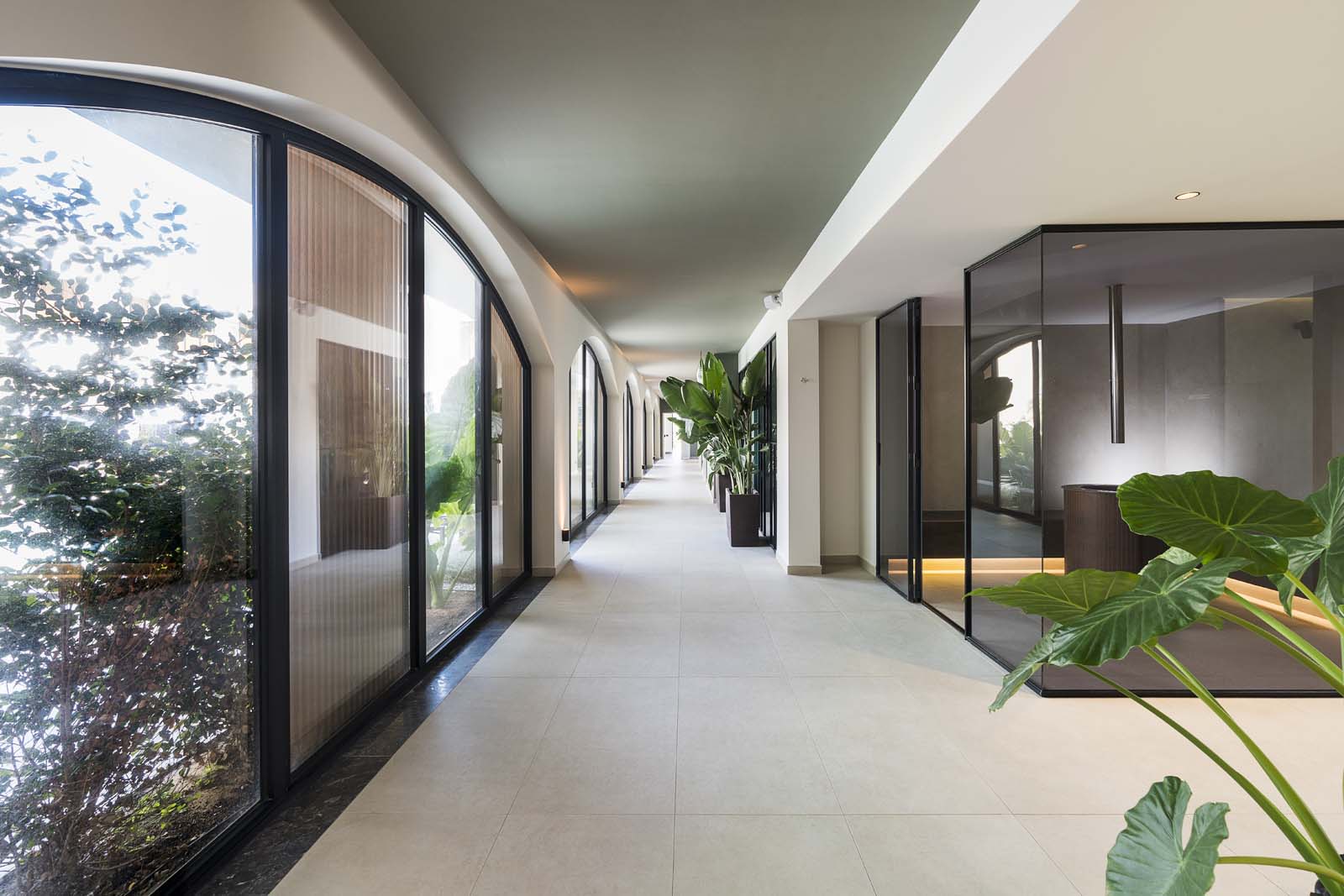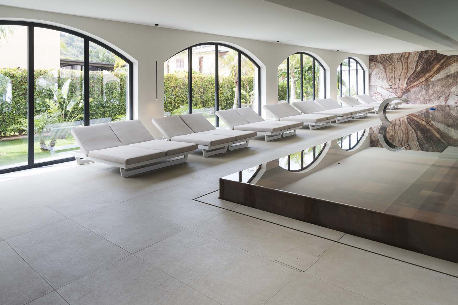 So water in all its forms – sea, swimming-pool or spa – and the concept of wellness that derives from it are core features in the project, and the central courtyard, a large portion of the ground floor and the 400 m² spa are devoted to them. The building has an L-shaped ground plan, enabling users to follow their path of choice through an outstandingly complete offering: indoor and outdoor pools, Finnish sauna, cold room, quiet room, emotional showers, hammam and private spas. A system of full-height arched windows marks the boundary between indoors and outdoors without interrupting the continuity of the lines or the fluidity of the spaces.