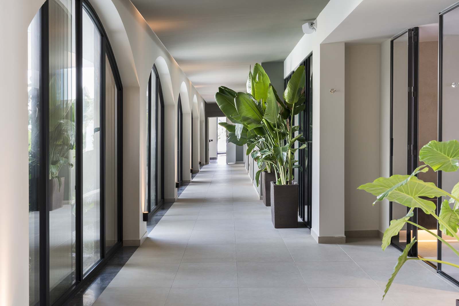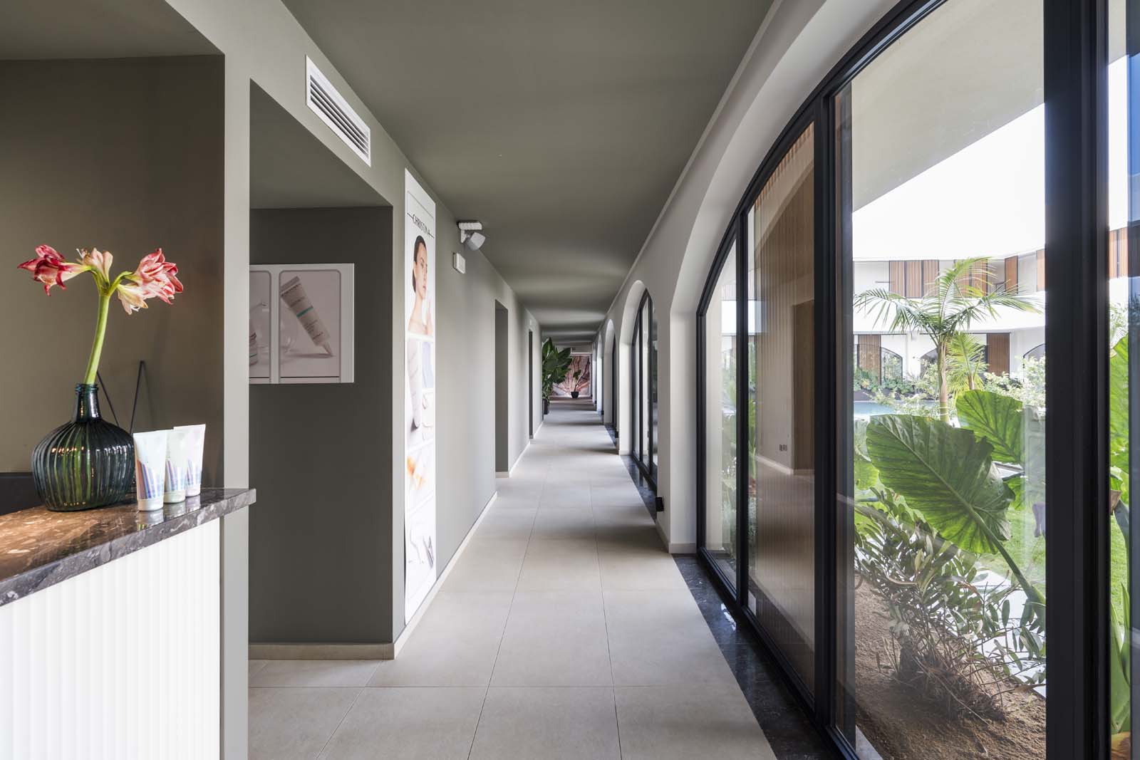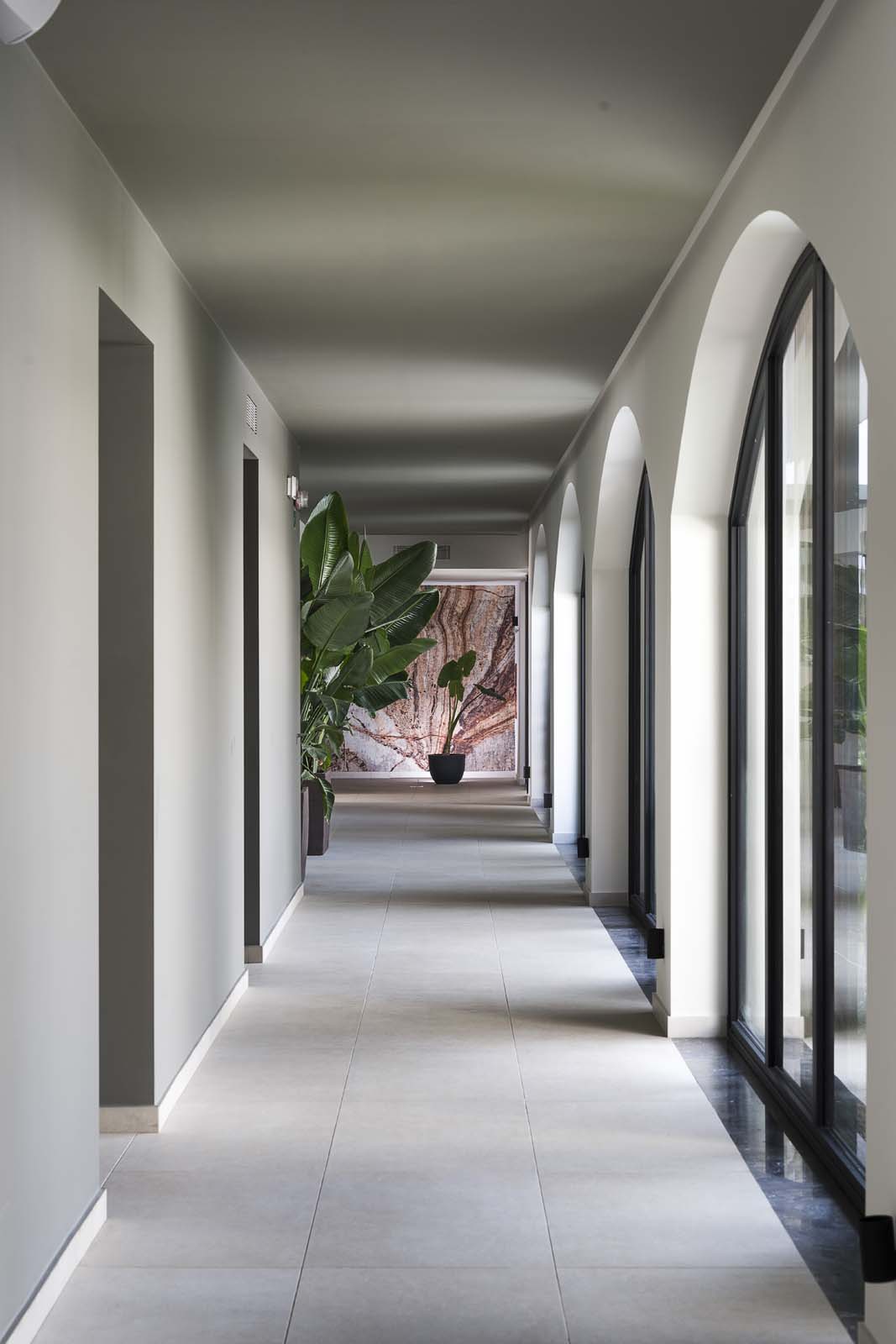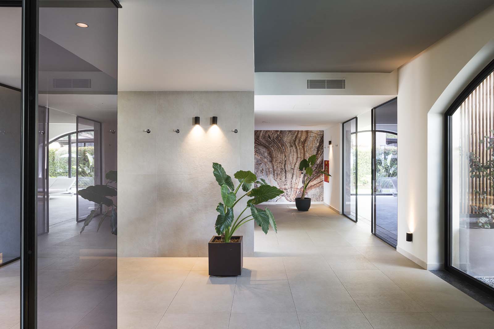So water in all its forms – sea, swimming-pool or spa – and the concept of wellness that derives from it are core features in the project, and the central courtyard, a large portion of the ground floor and the 400 m² spa are devoted to them. The building has an L-shaped ground plan, enabling users to follow their path of choice through an outstandingly complete offering: indoor and outdoor pools, Finnish sauna, cold room, quiet room, emotional showers, hammam and private spas. A system of full-height arched windows marks the boundary between indoors and outdoors without interrupting the continuity of the lines or the fluidity of the spaces.