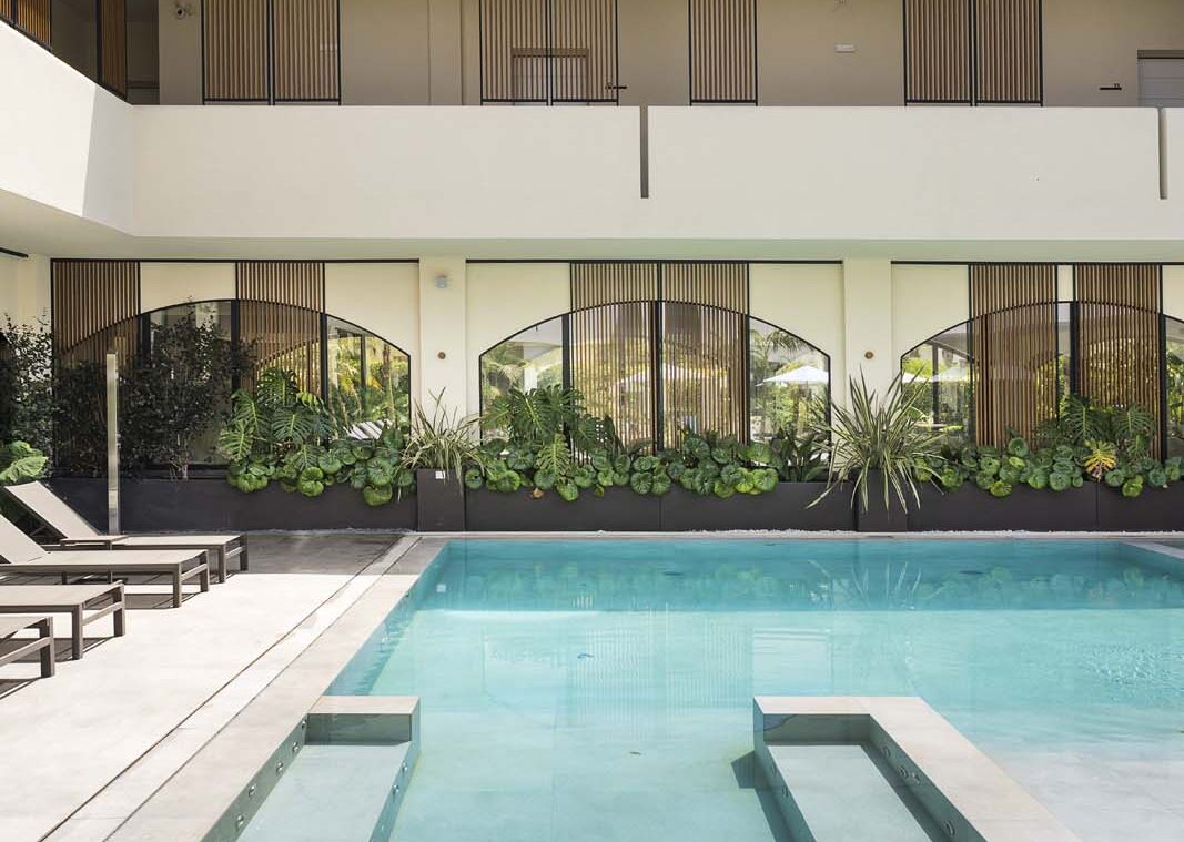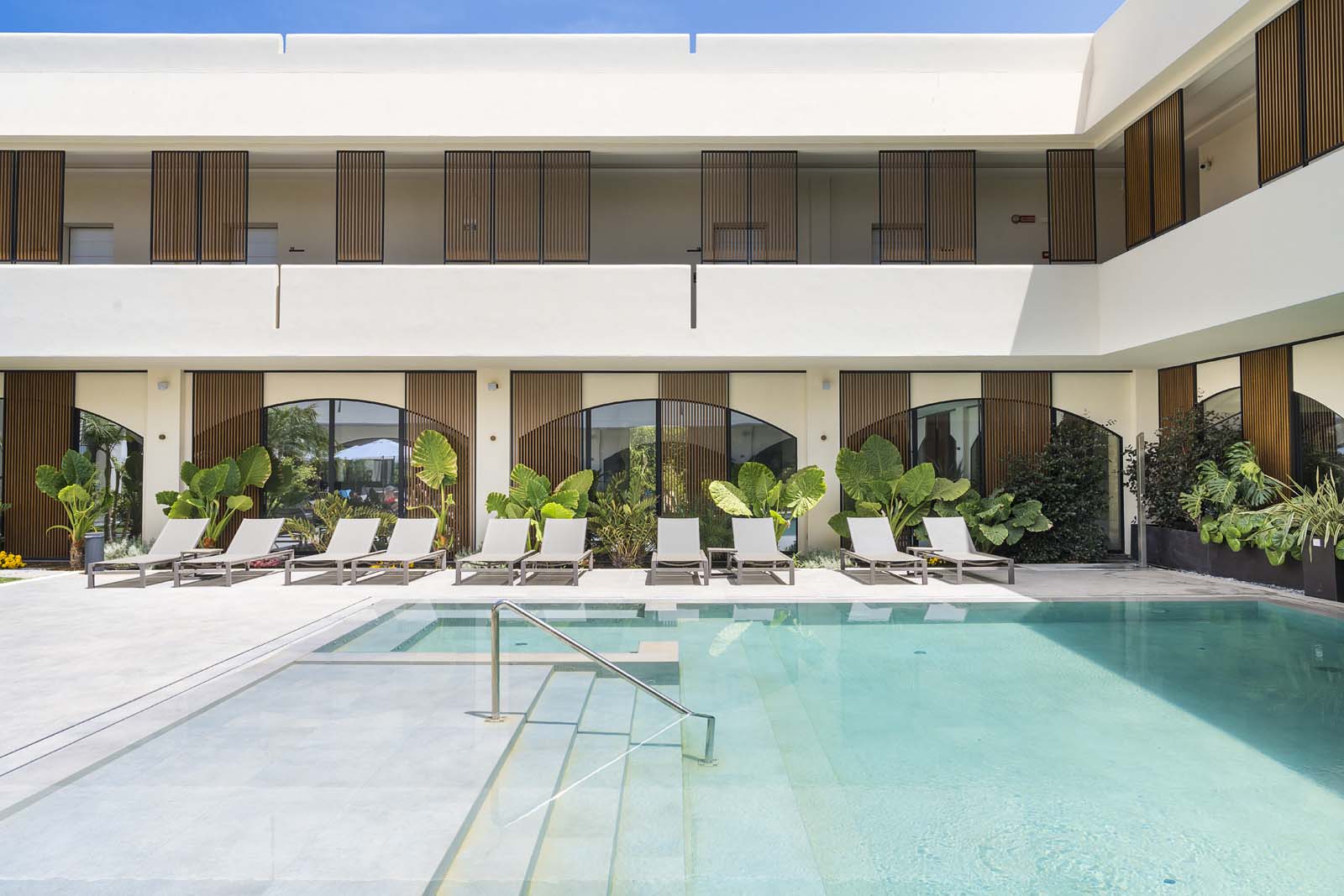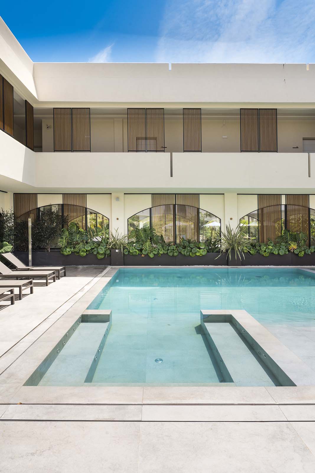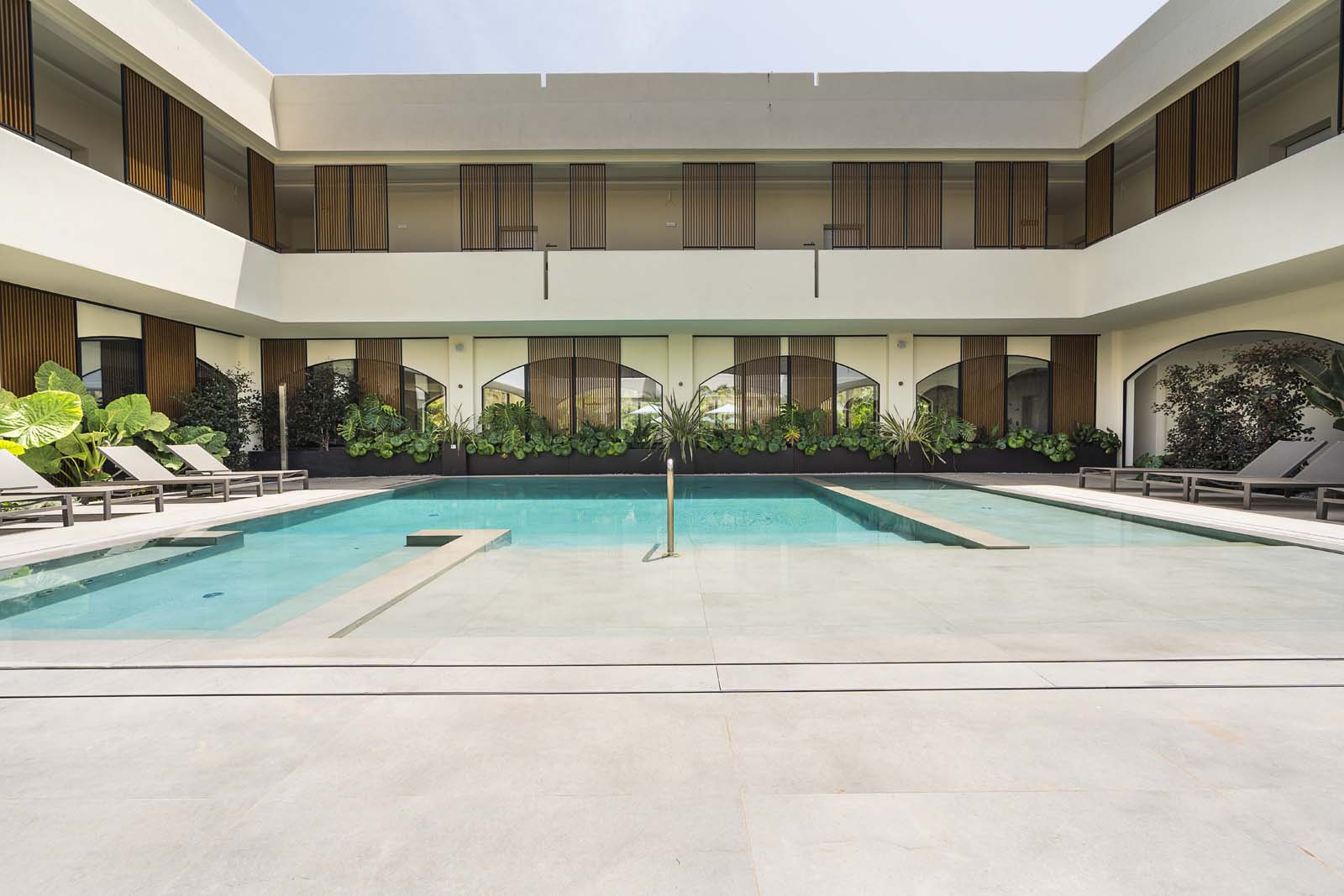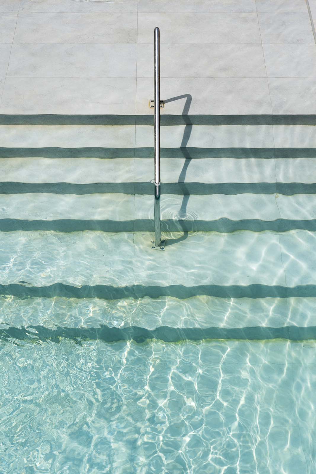 So water in all its forms – sea, swimming-pool or spa – and the concept of wellness that derives from it are core features in the project, and the central courtyard, a large portion of the ground floor and the 400 m² spa are devoted to them. The building has an L-shaped ground plan, enabling users to follow their path of choice through an outstandingly complete offering: indoor and outdoor pools, Finnish sauna, cold room, quiet room, emotional showers, hammam and private spas. A system of full-height arched windows marks the boundary between indoors and outdoors without interrupting the continuity of the lines or the fluidity of the spaces.