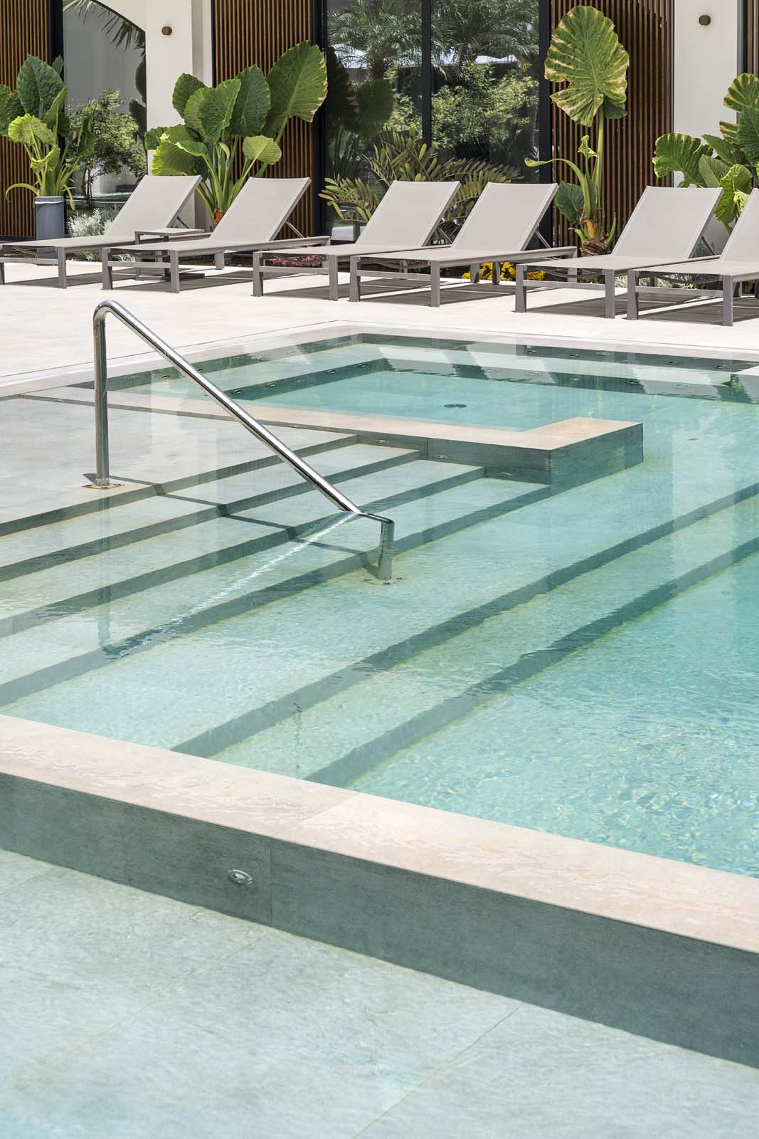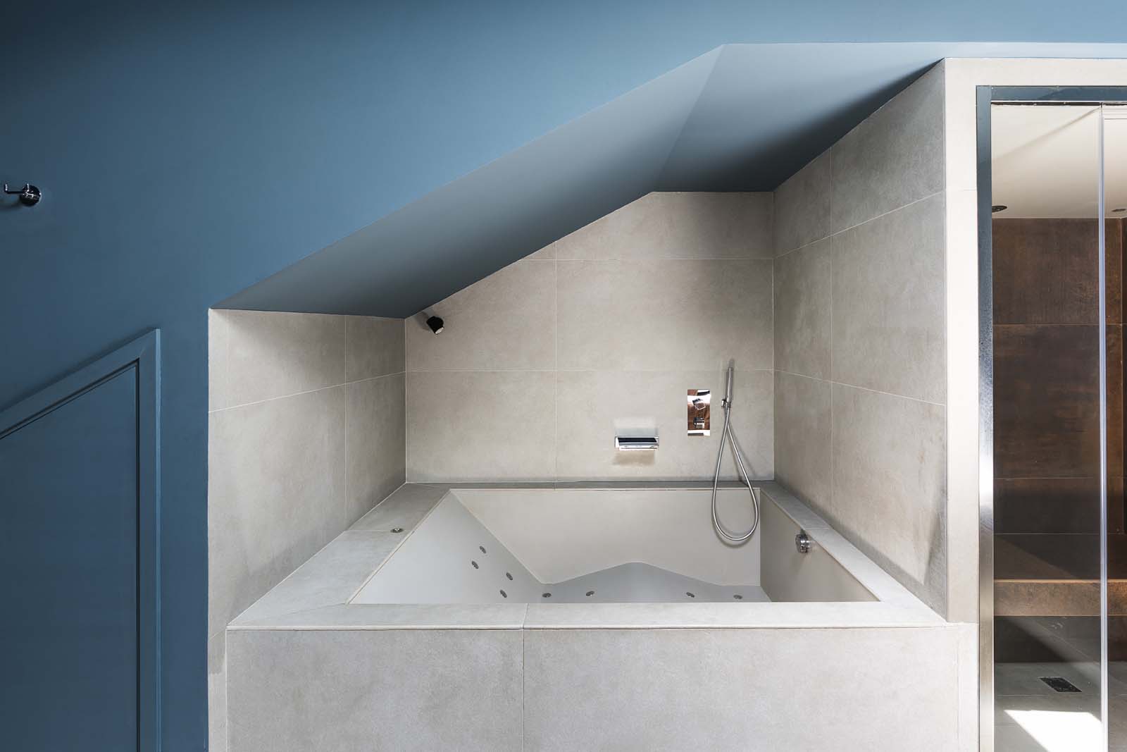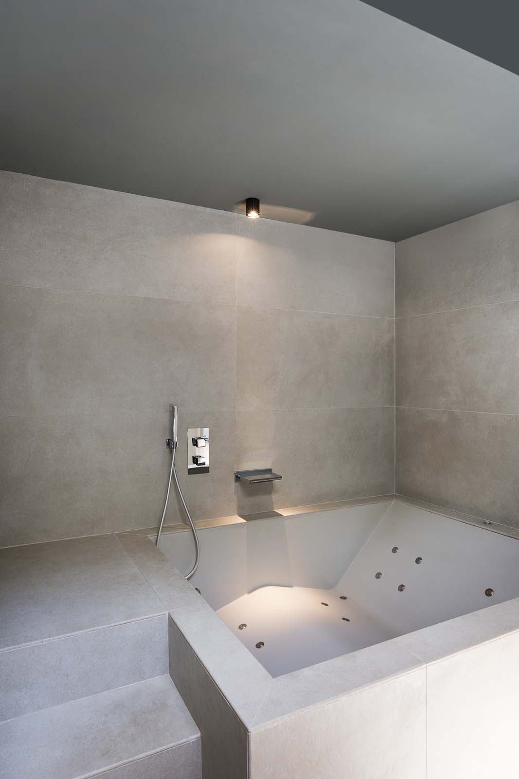 For the wall covering of the spa and for the entire pool, the selected material was the Stratford stoneware collection, in 60×120 cm and in Clay color. “A neutral background,” the architect continued, “with a matt surface but a contemporary texture, a perfect backdrop not only for the indoor rooms but also for the natural features of the garden at the centre of the spa pathway.”