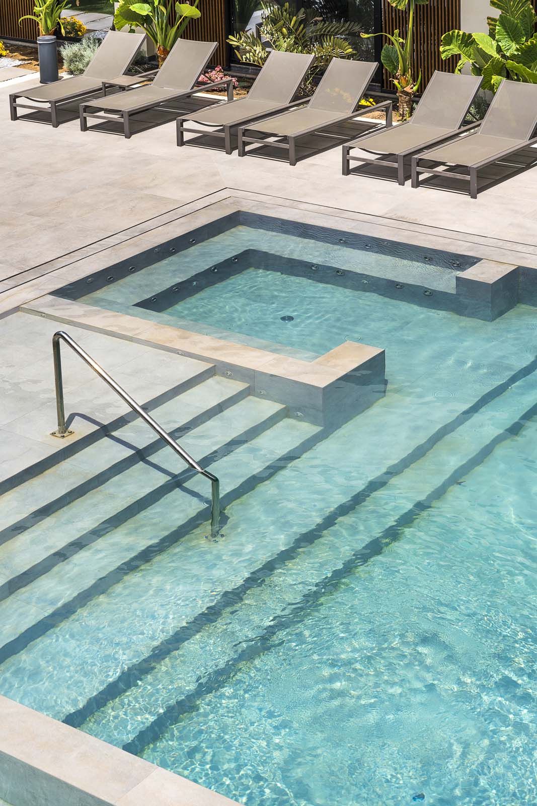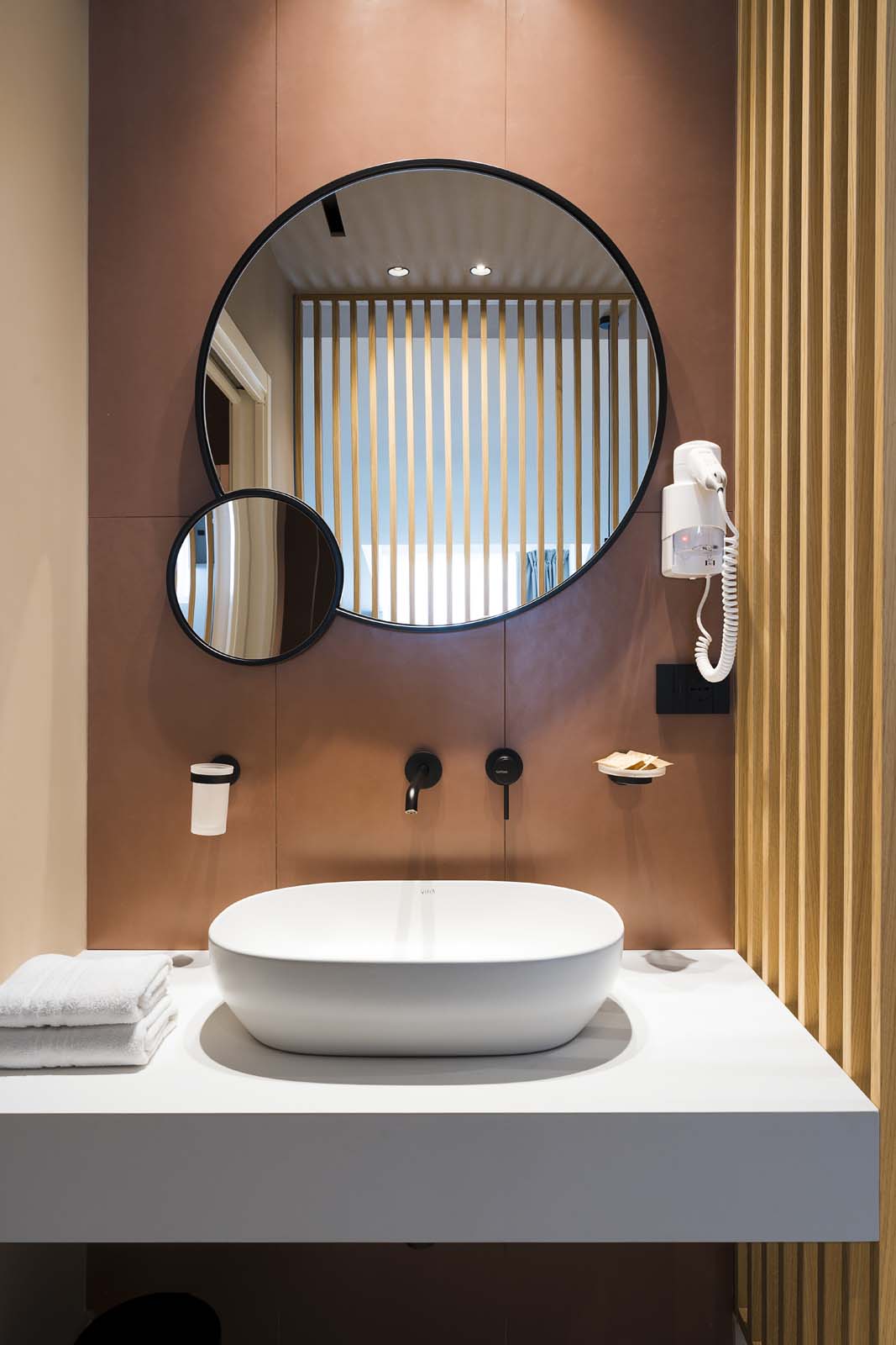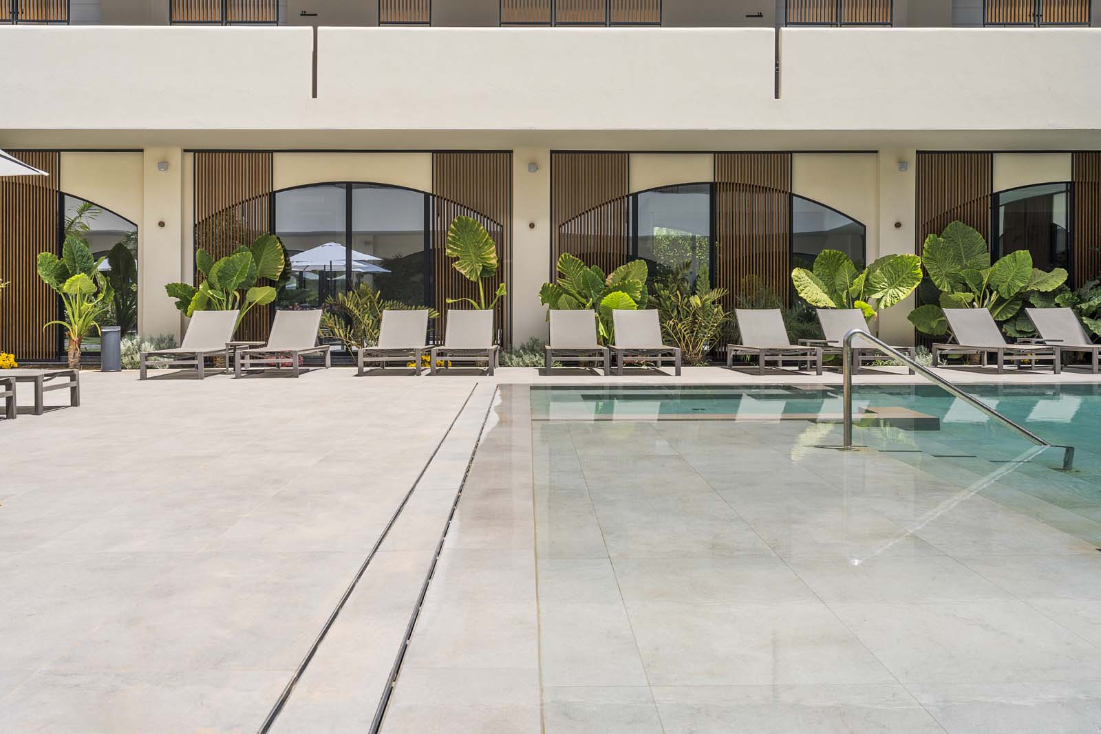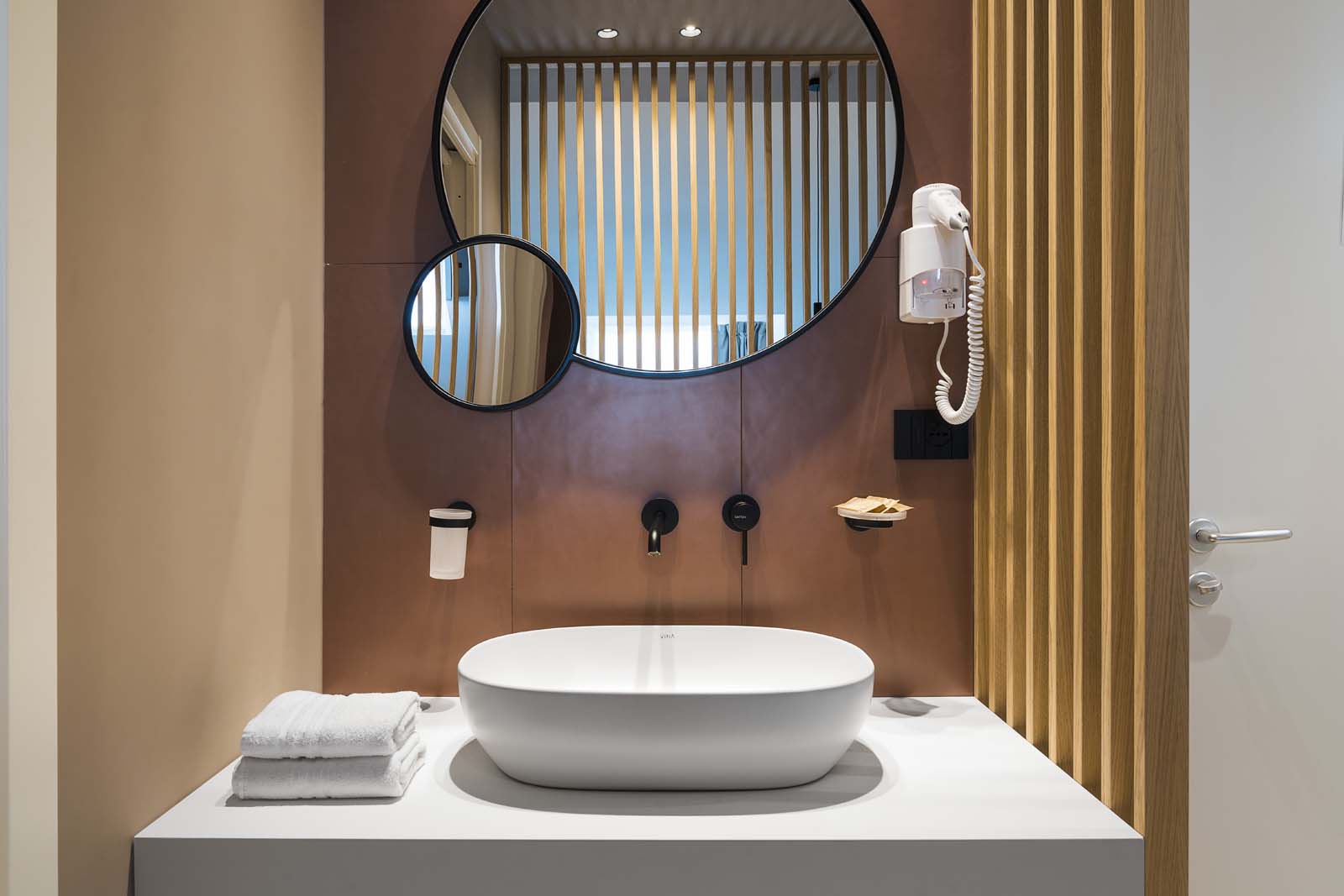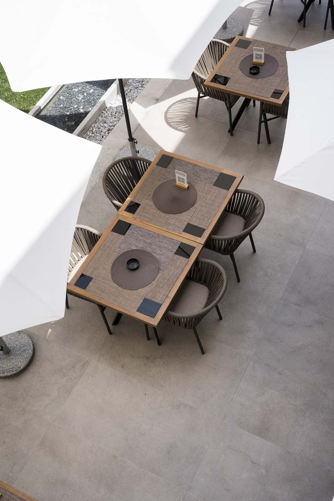 Walking along the outdoor paths or lingering on the terrace or in the poolside solarium for a cocktail or a coffee, it is impossible not to notice the Realstone_Jerusalem Grigio porcelain stoneware (in 60×120 and 30×60 cm sizes) with its texture evoking the strength of slate, which is also used for the balconies of the rooms.