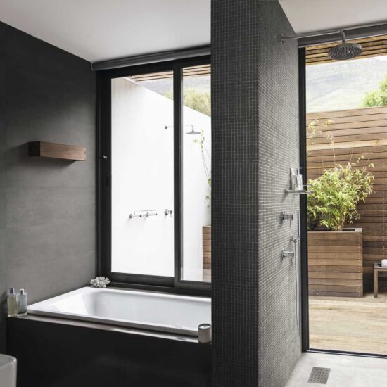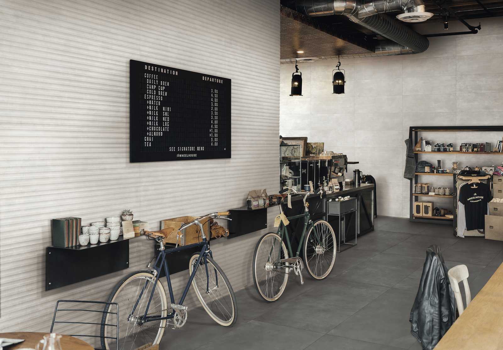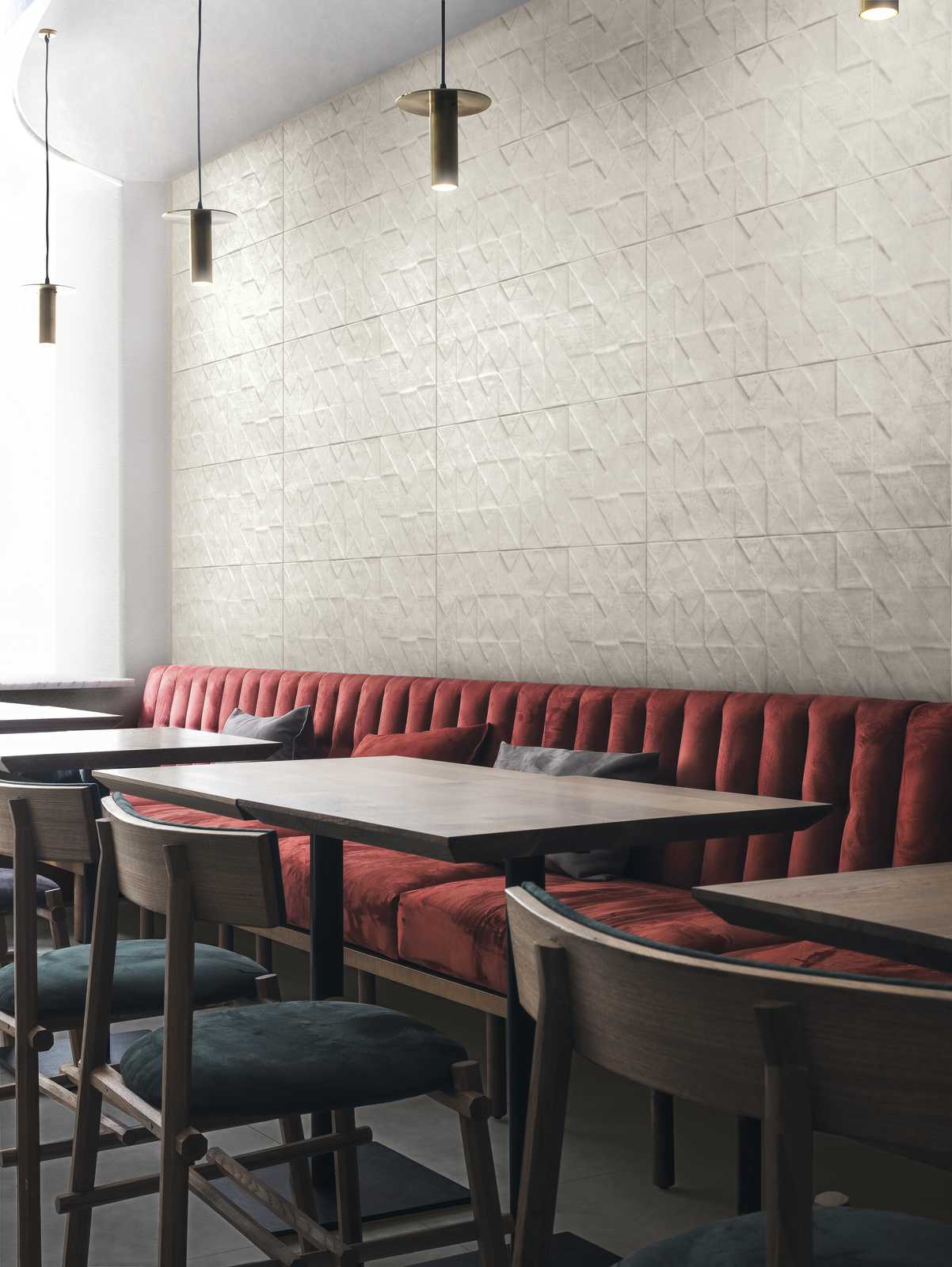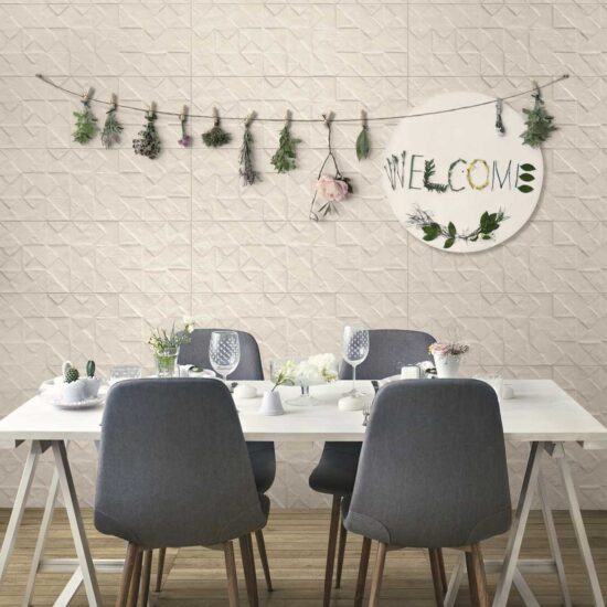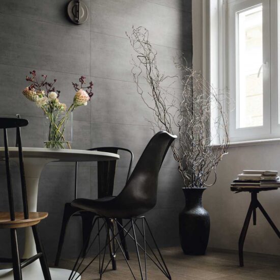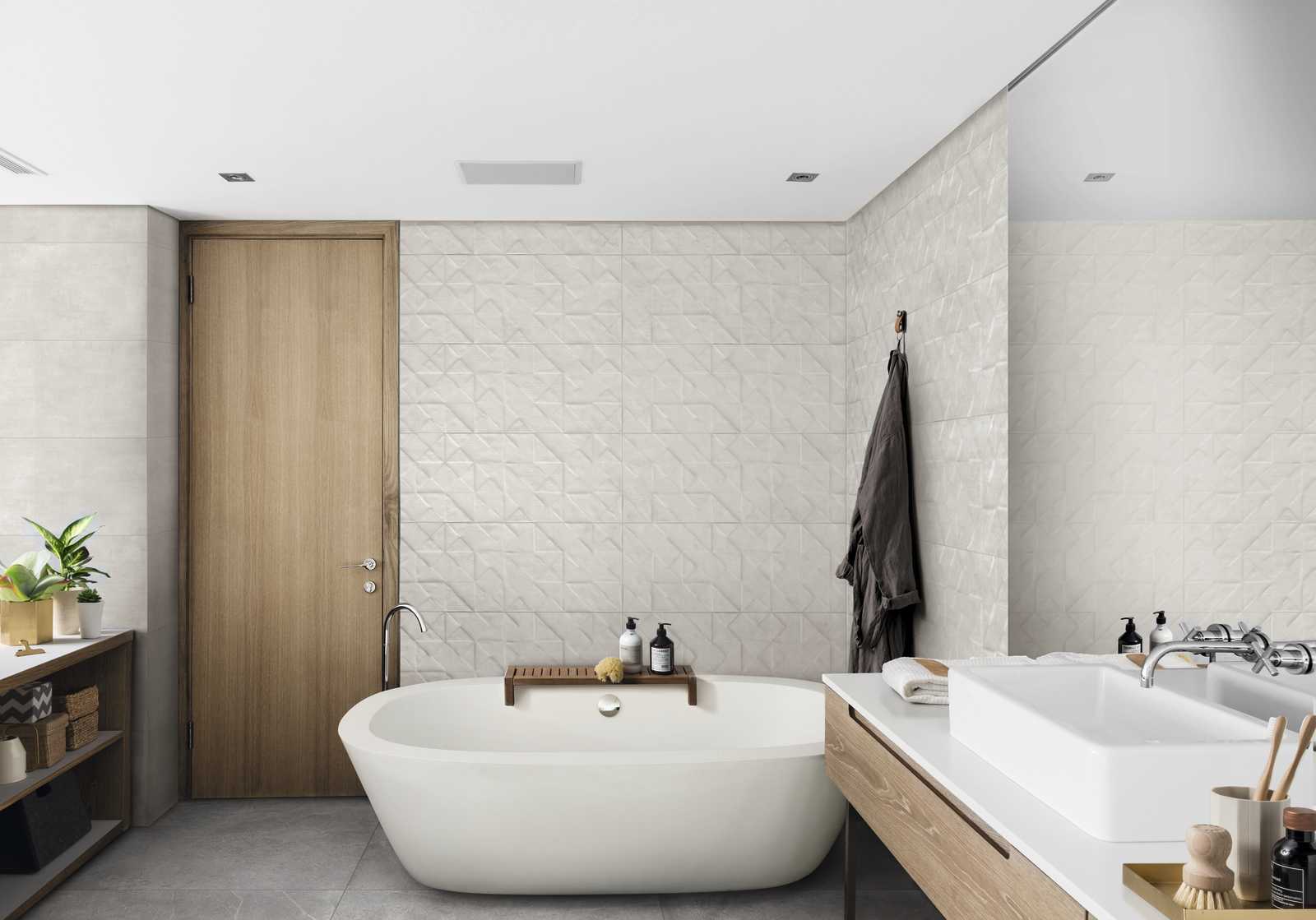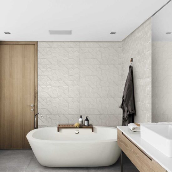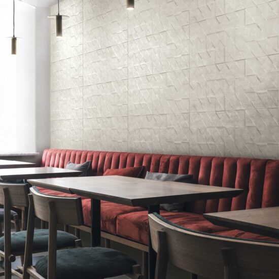 There is a single main size (32.5 cm x 97.7 cm) with plain tiles available smooth or in 3D wall covering structures, which reveal all Texcem's real character: Tria is a structure which uses geometrical chiaroscuro effects, with a 3D pattern created by overlapping triangles and squares, generating an original alternation of light and shade, while Groove is inspired by the manual shaping of concrete, evoking the same surface appearance.