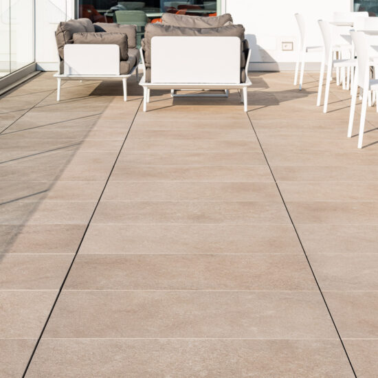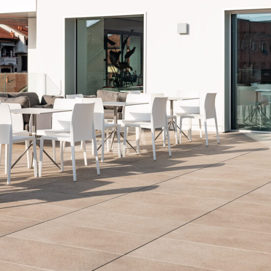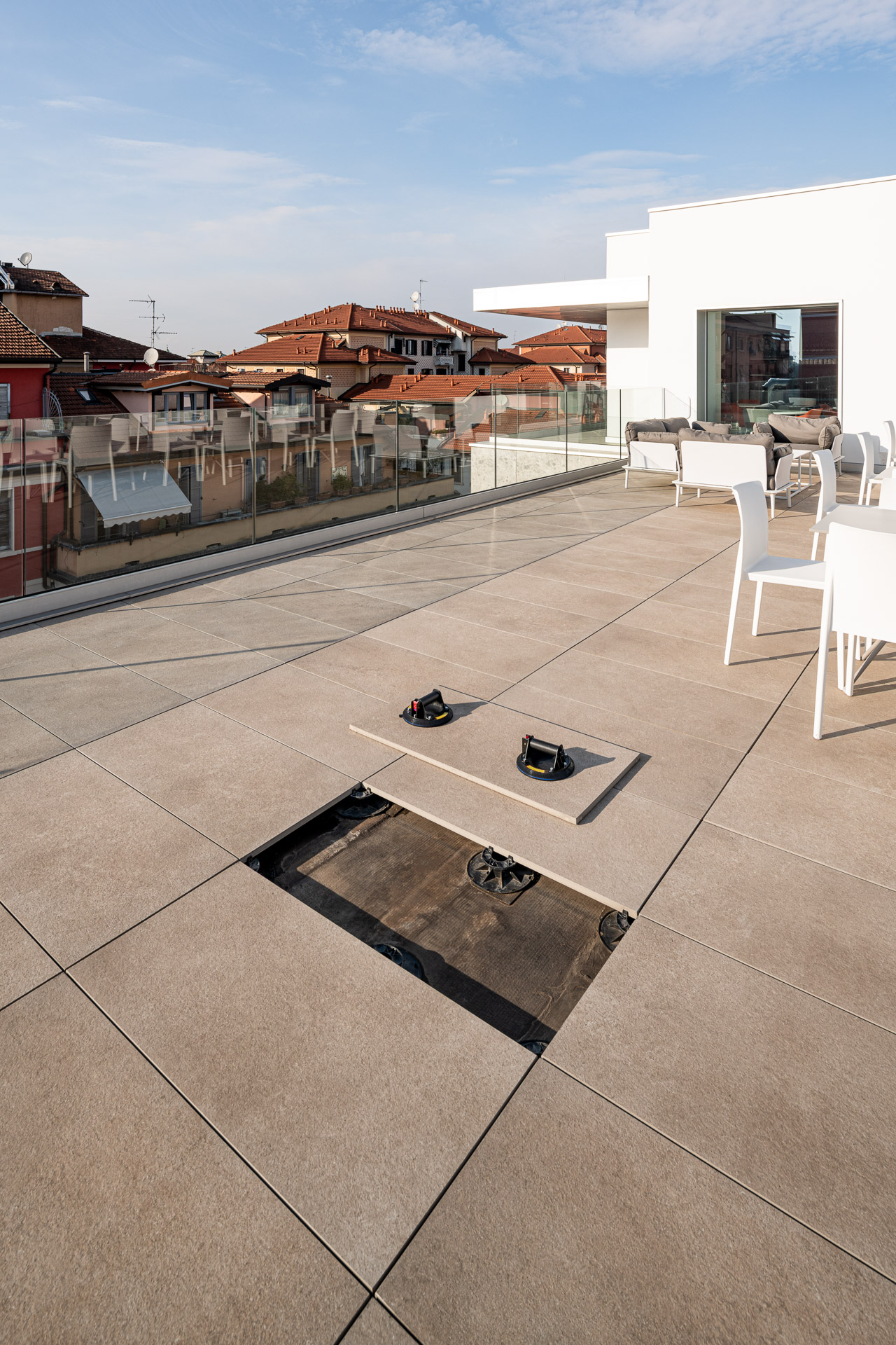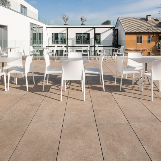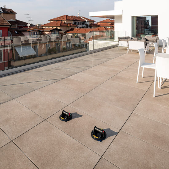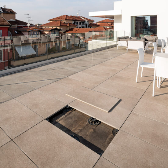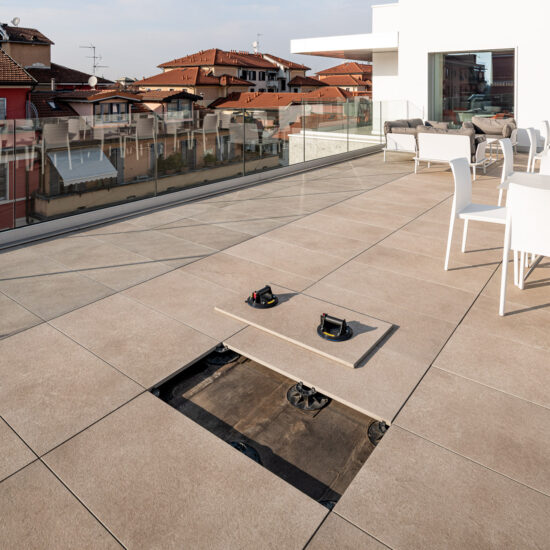 The outdoor raised paving system is a very versatile construction method that can be installed above any type of paving; it consists of a stoneware surface mounted on a convenient, lightweight supporting structure. Each individual module can be easily removed at any time, simplifying the inspection, modification and maintenance of utility systems.