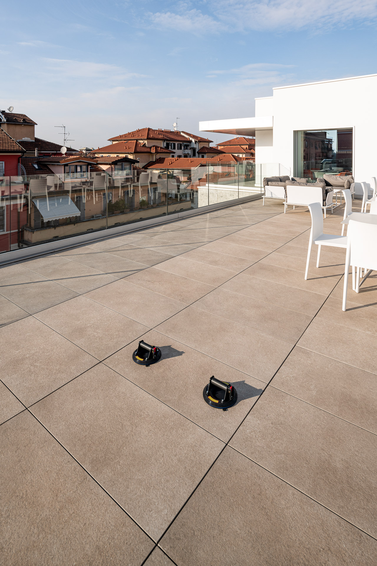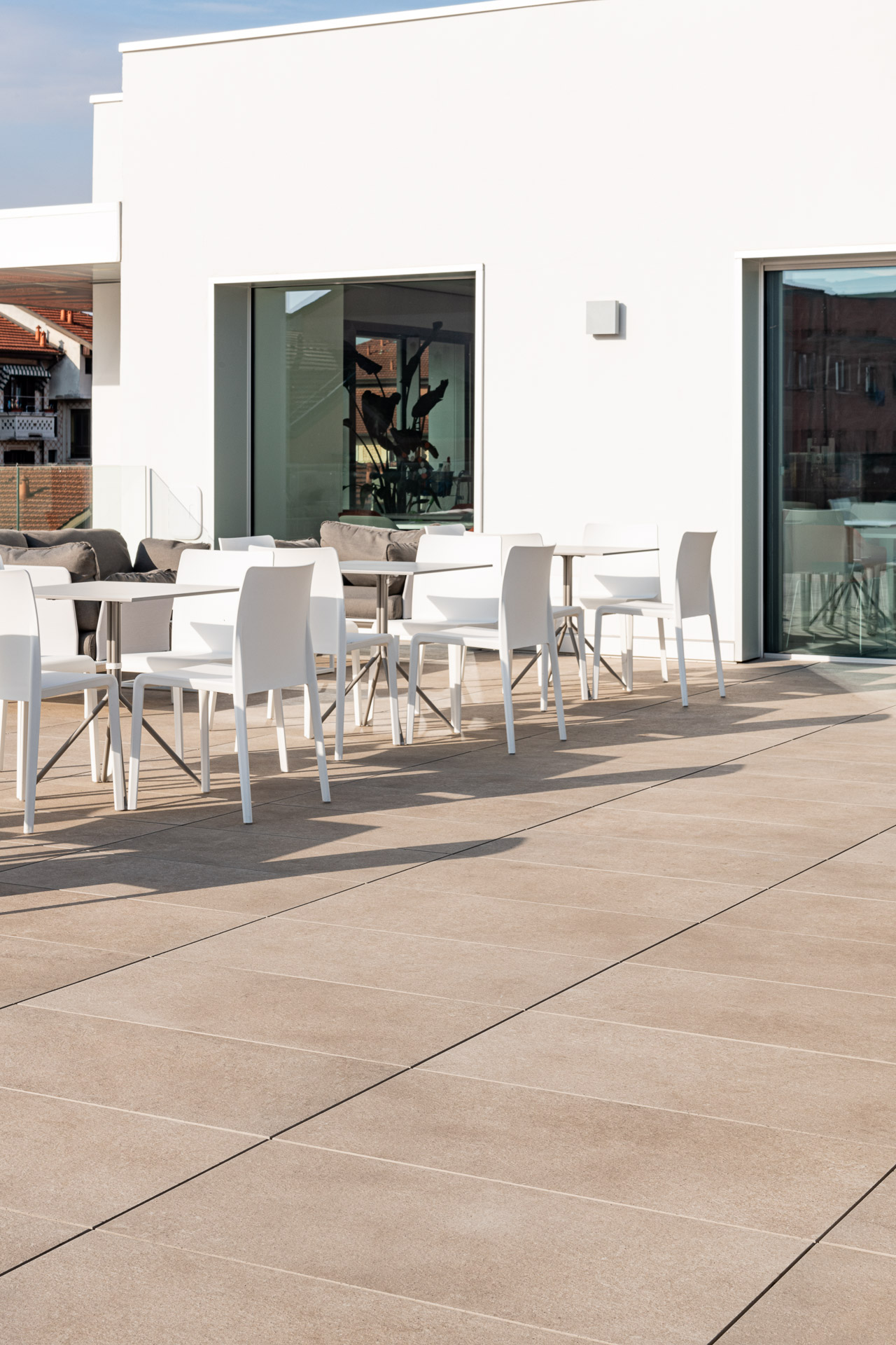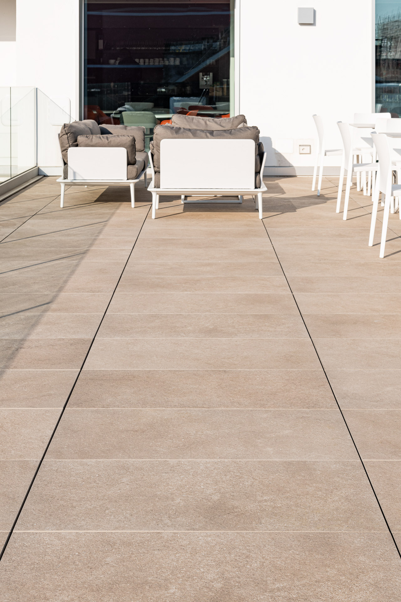 The outdoor raised paving system is a very versatile construction method that can be installed above any type of paving; it consists of a stoneware surface mounted on a convenient, lightweight supporting structure. Each individual module can be easily removed at any time, simplifying the inspection, modification and maintenance of utility systems.
