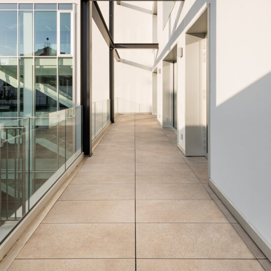 A sustainable urban regeneration project with high energy efficiency standards and Leed Core & Shell certification, designed by the Galliano & Tagliapietra architecture firm, which chose Ragno Ceramiche porcelain stoneware slabs for the outdoor raised paving and the ventilated walls.