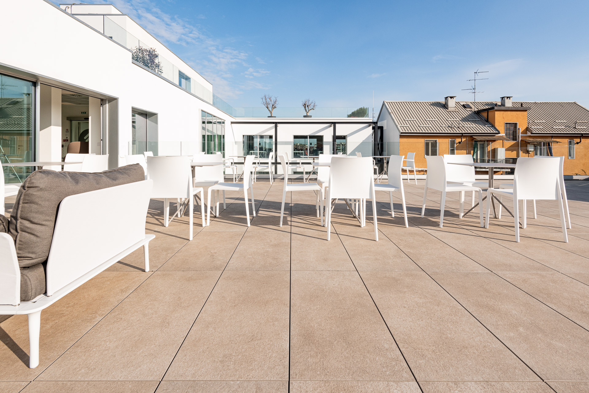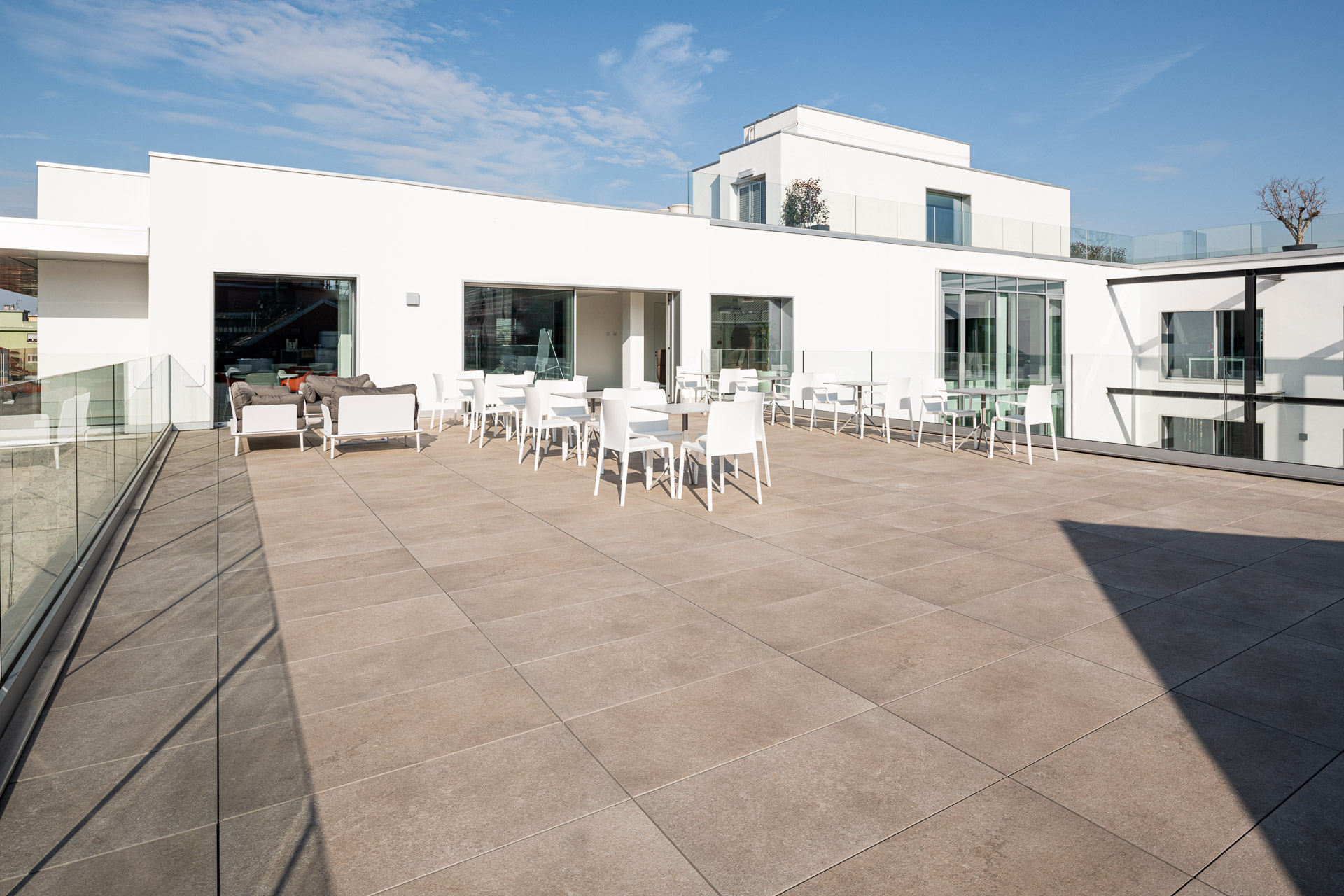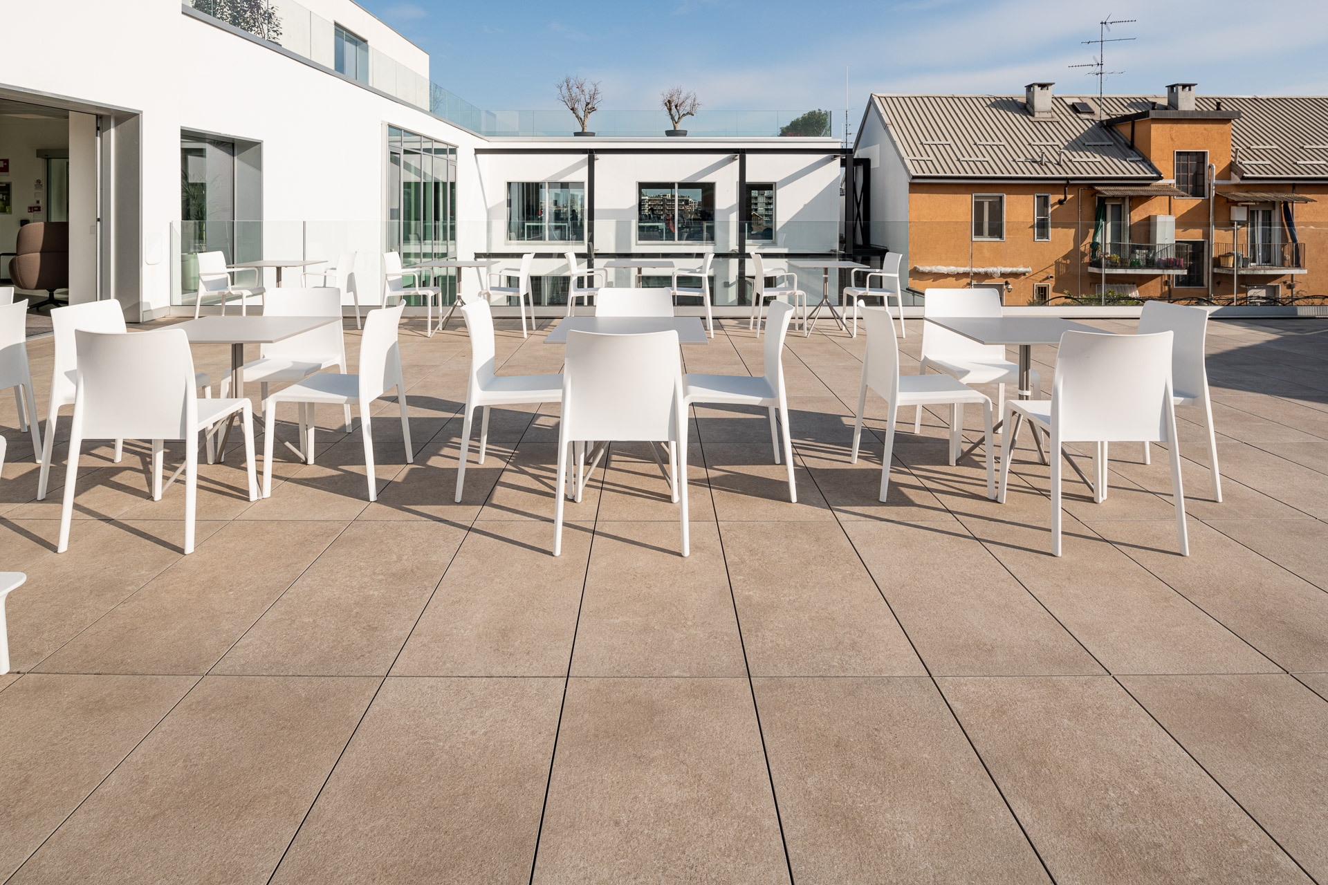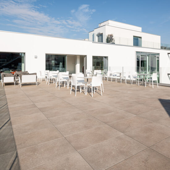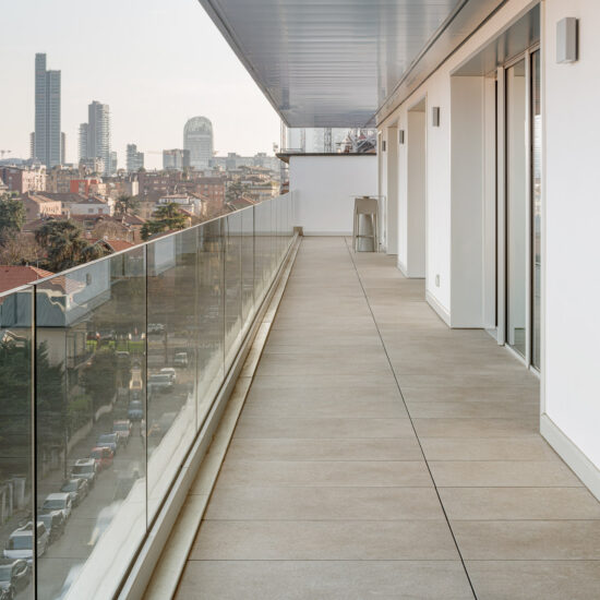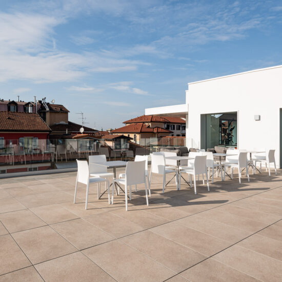 The use of Ragno porcelain stoneware for the facade cladding boosts the building’s energy efficiency and soundproofing, as well as resolving issues of damp and atmospheric aggression, while guaranteeing outstanding comfort in the interior.