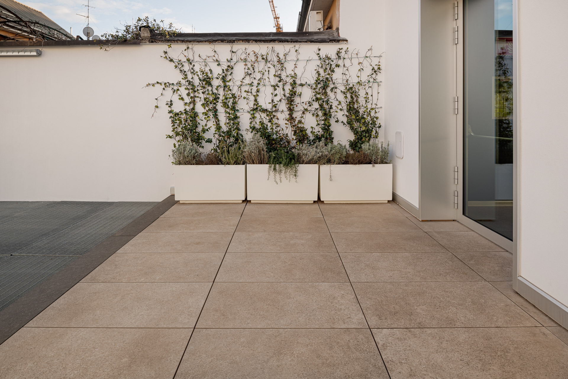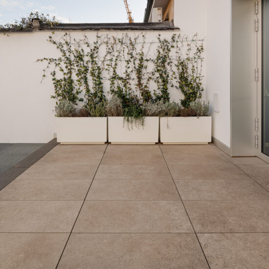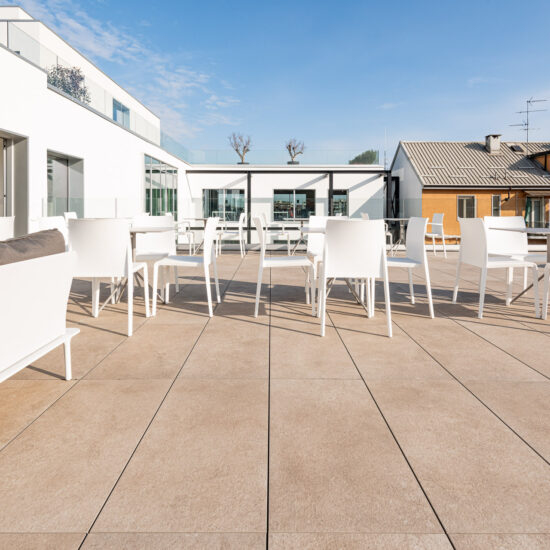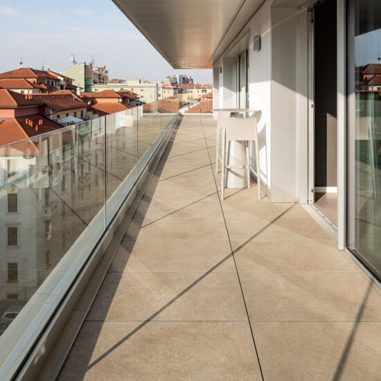 The architects decided to finish the 4th and 5th floor terraces with the raised paving system, using the Realstone_Jerusalem XT20 stone-effect porcelain stoneware collection in Noce color in 50×100 cm size.