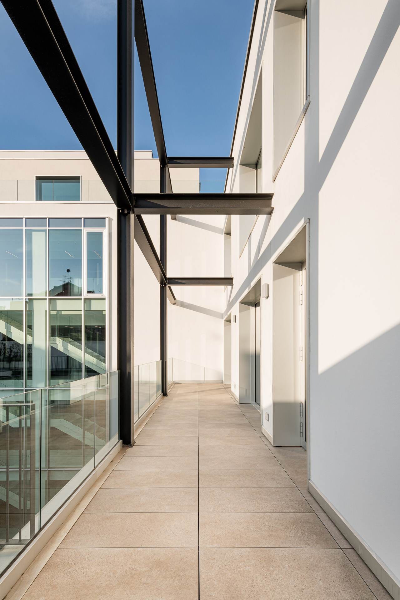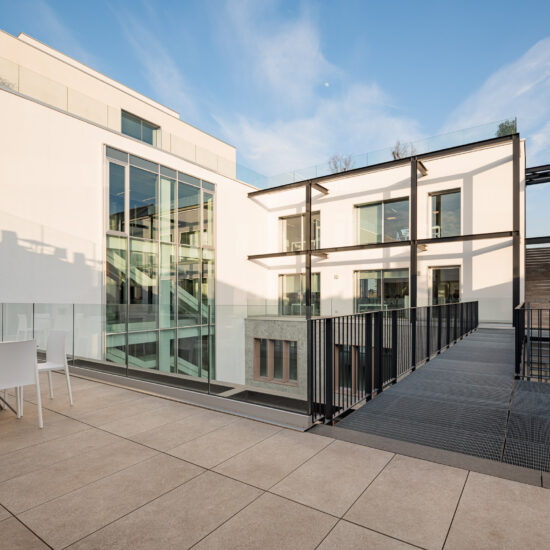 It is a sustainable project with high efficiency standards and exceptional design values, that offers a contemporary reinterpretation of the architectural style of its surroundings. The building is a composition of severe, simple geometrical forms, with an attractive balance between solid and hollow sections.