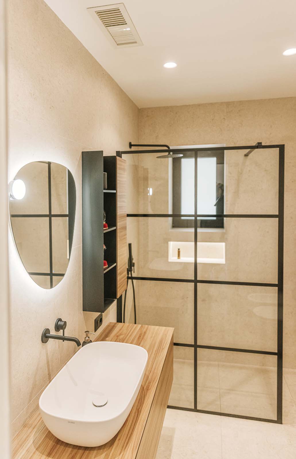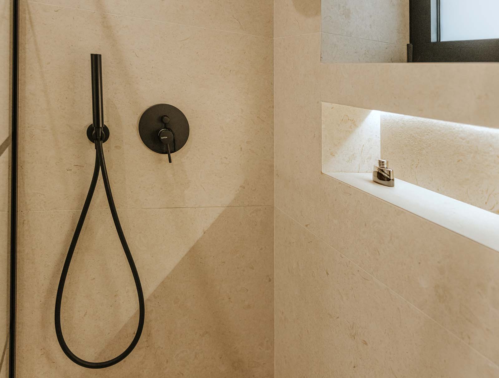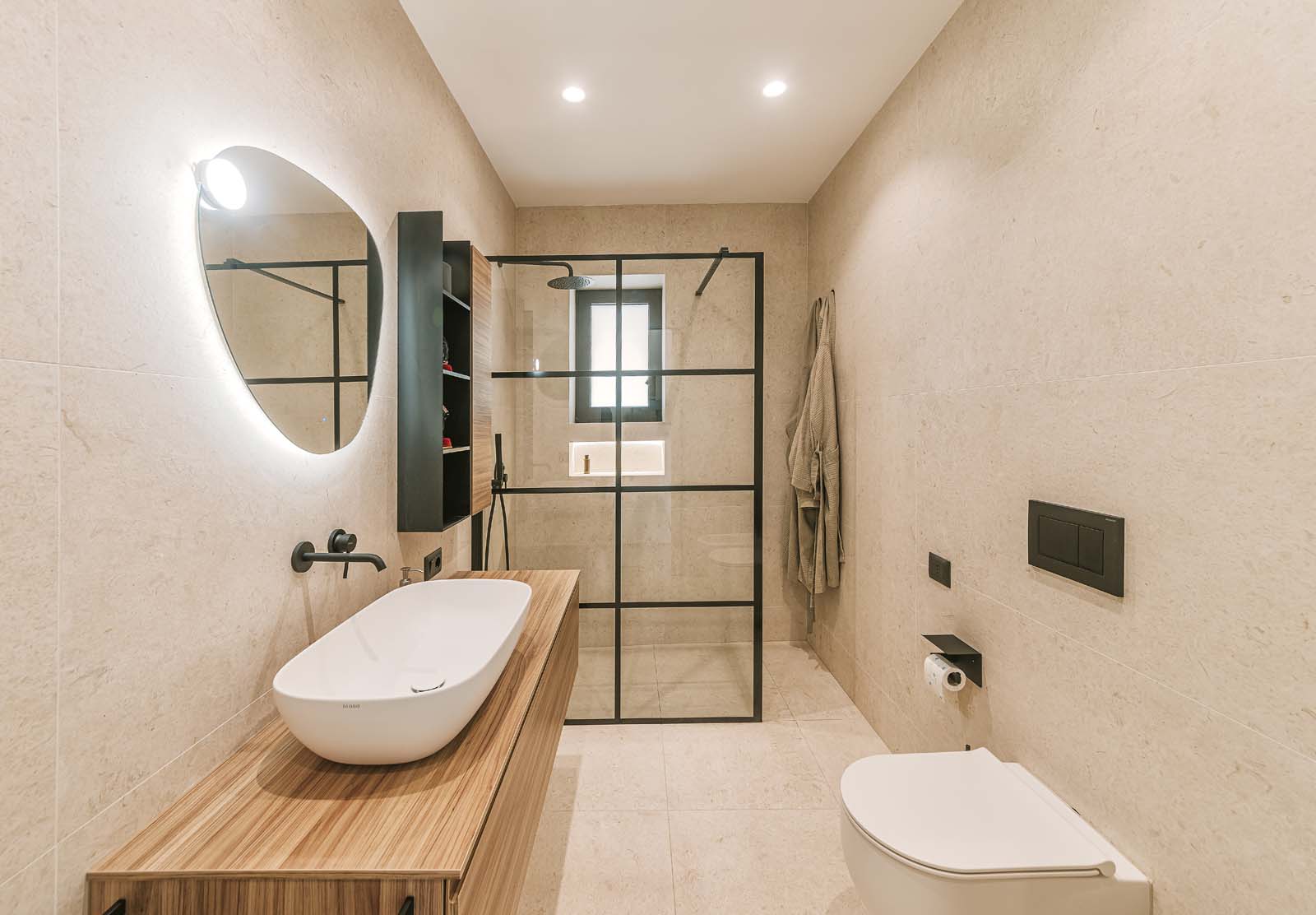 In the bathroom, the Eterna stone-effect stoneware also extends to the walls, creating an inviting ambience of pure elegance. The black details of the furnishings and finishes underline the overall harmony of the interior, which is elegant yet welcoming.