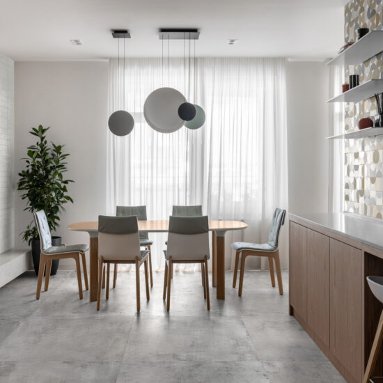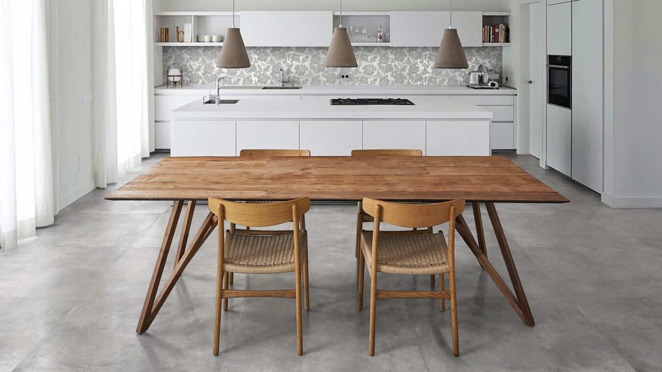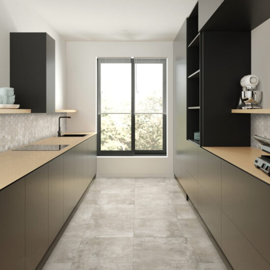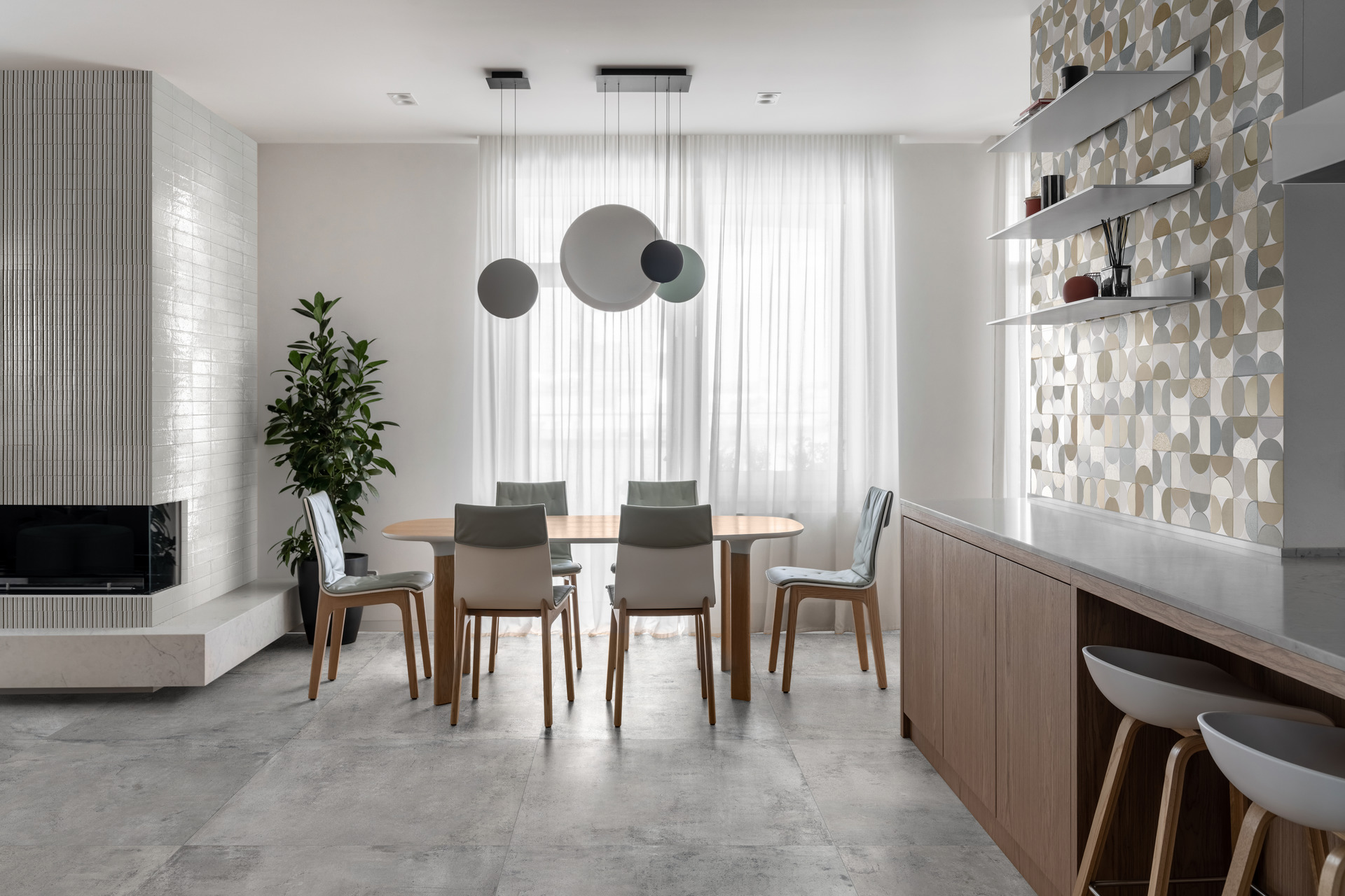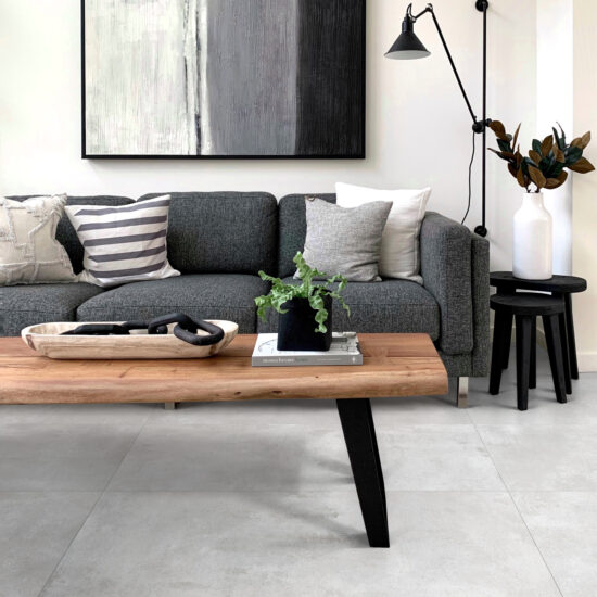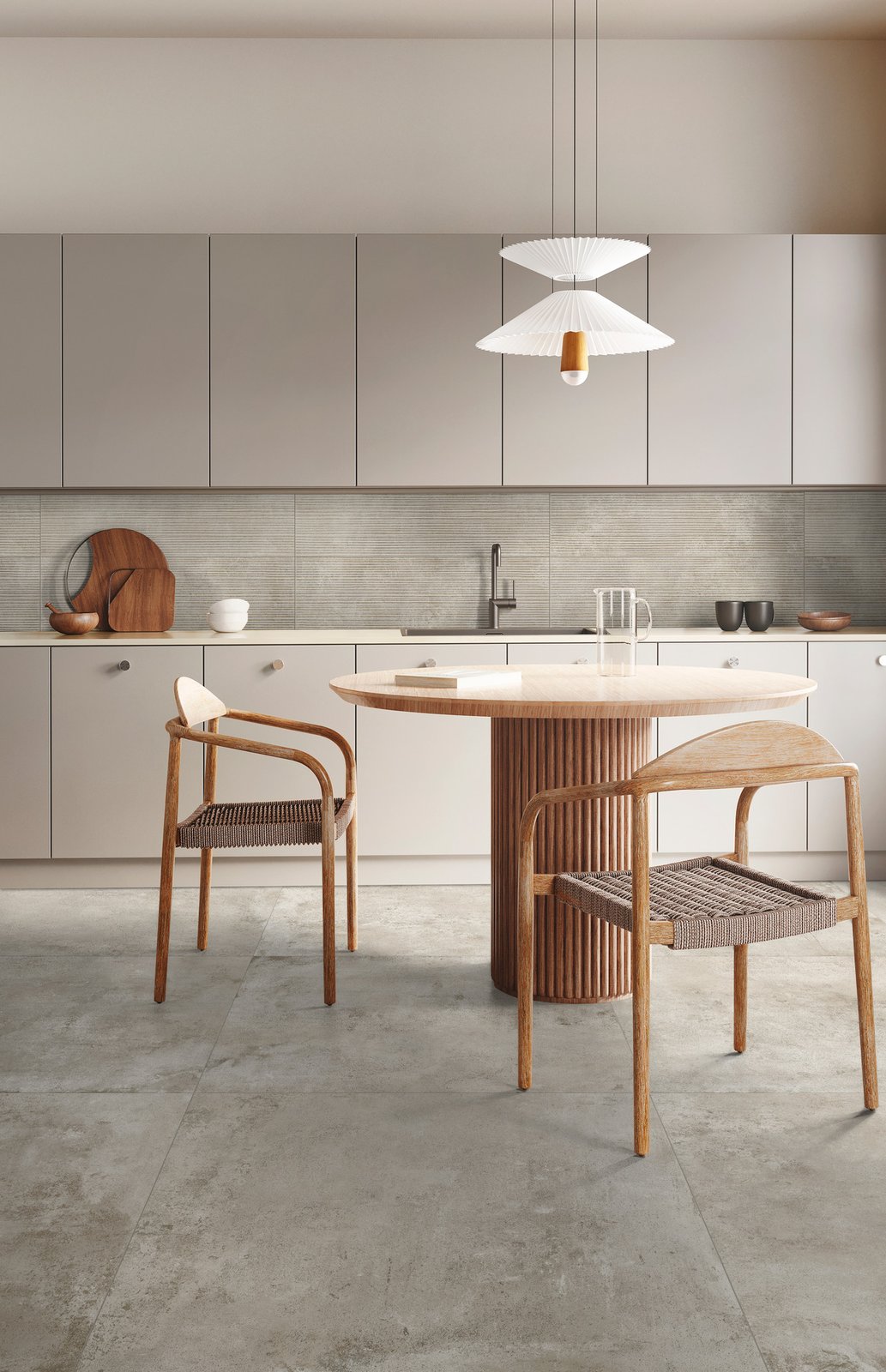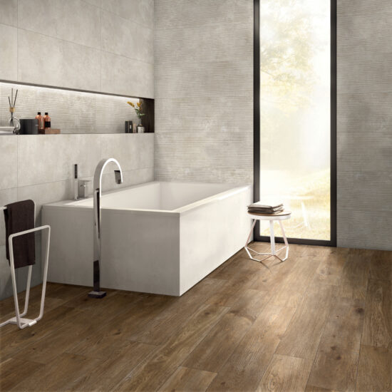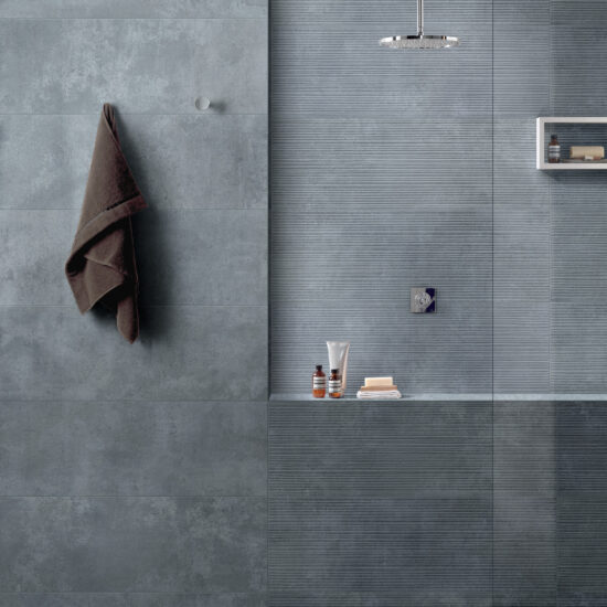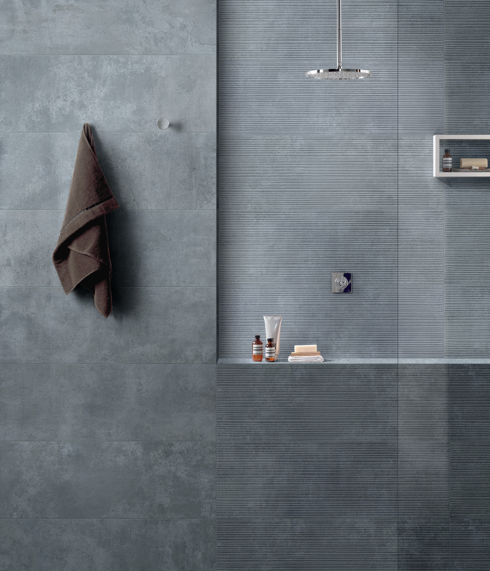 The Clayton collection’s unusual concrete texture is striking when combined with different materials or ceramic surfaces with multiple effects, in contemporary interior design schemes featuring an eclectic mix of different effects and textures.