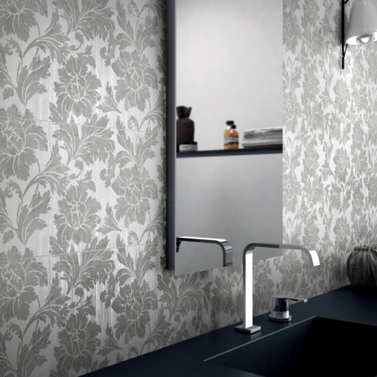Last but not least, the Touch Technology, is used for the decors of the Clayton ceramic coverings to enhance them with the textured effect of glossy and matt vitreous grits, giving the product a selective three-dimensional effect that conserves the artistic-crafted air of traditional ceramics. These exquisite relief structures add a special gleam to the surfaces, as in the case of the Meridian Decor, a homage to the world of Damask fabrics installed as a wall covering – available in cold or warm variants – or the Sphere Decor, featuring vintage geometrical forms with subtle profiles.