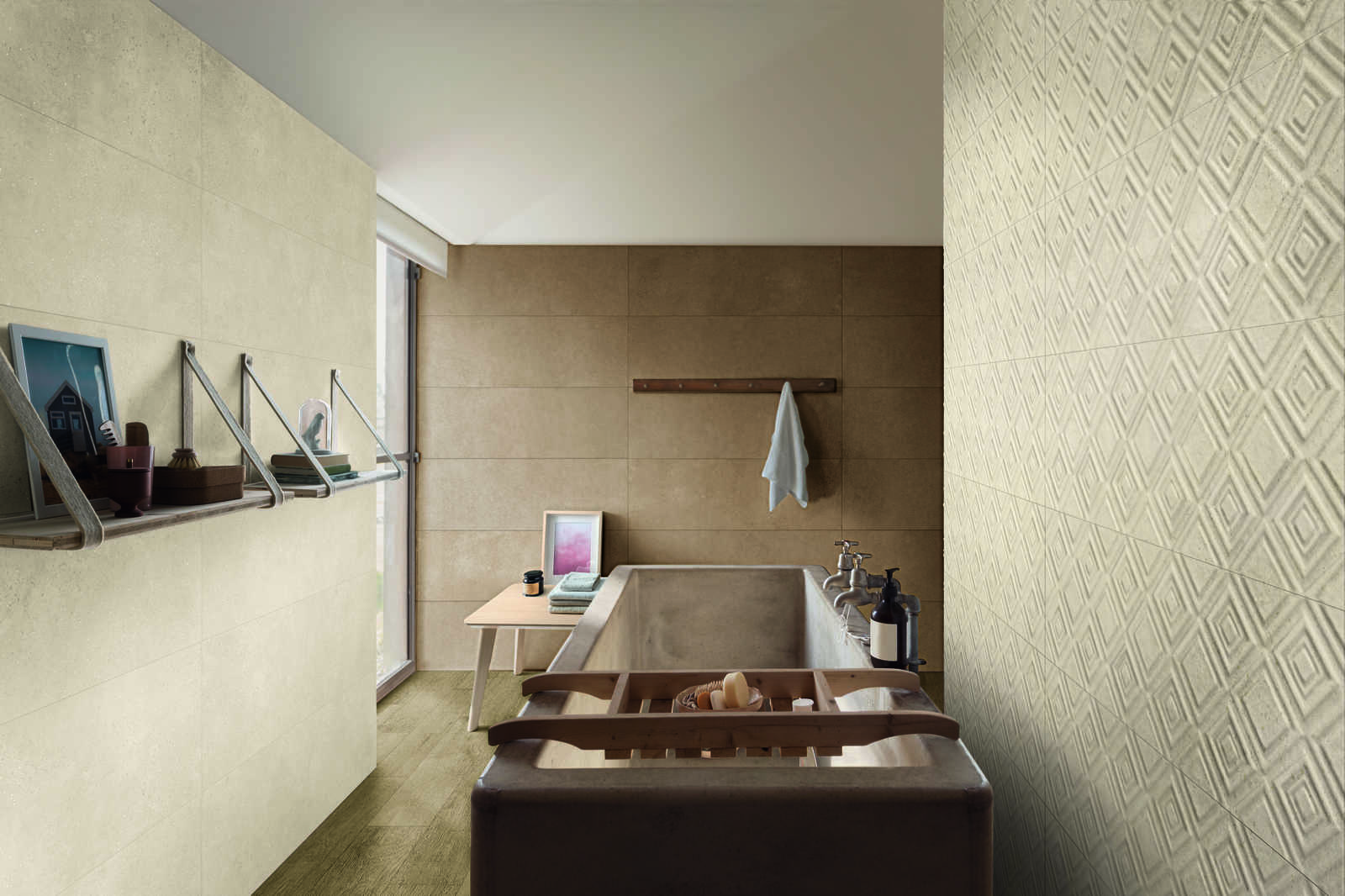 Ragno reinterprets this ancient construction tradition by giving its Cocciopesto wall tile collection some of the essential, easily recognisable characteristics of the traditional crushed brick material.
