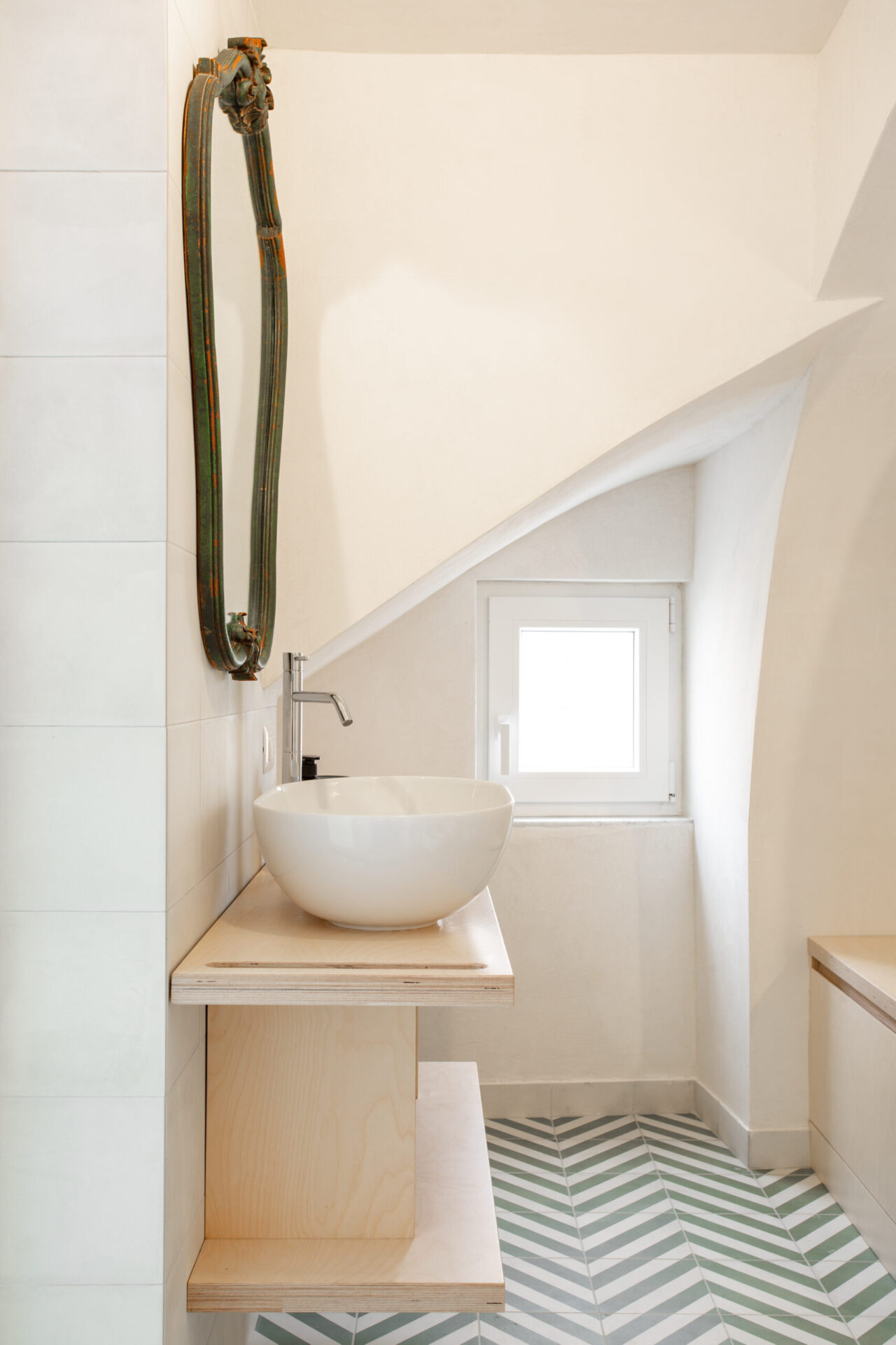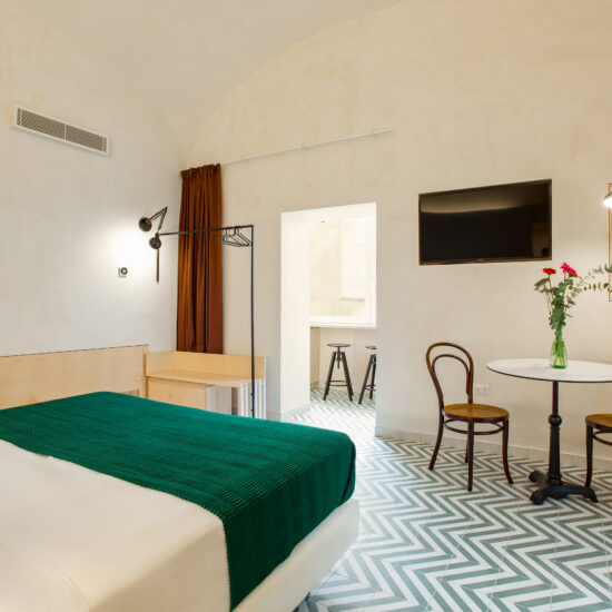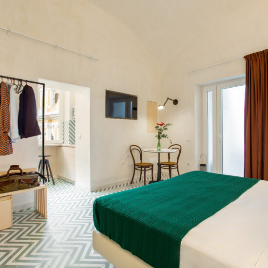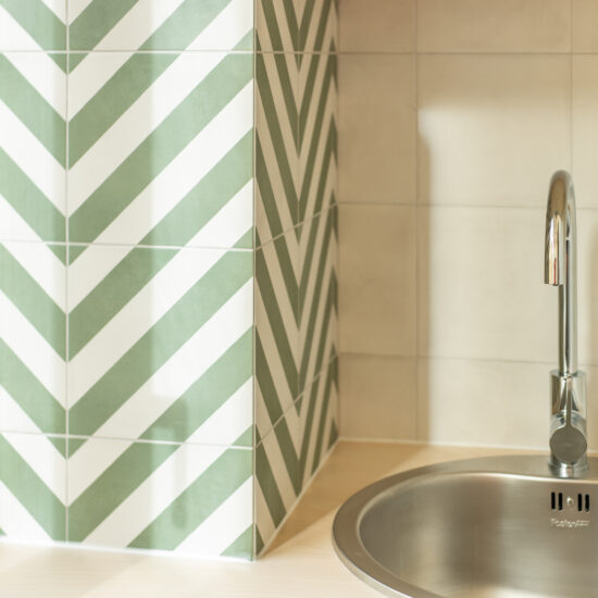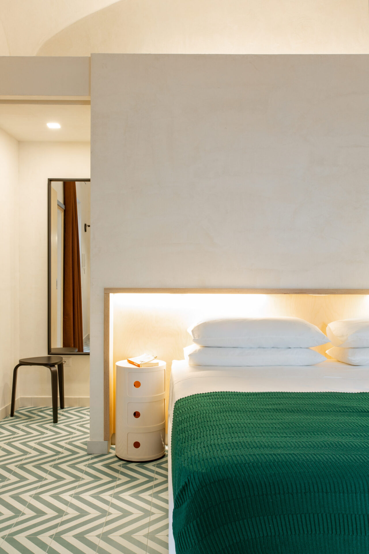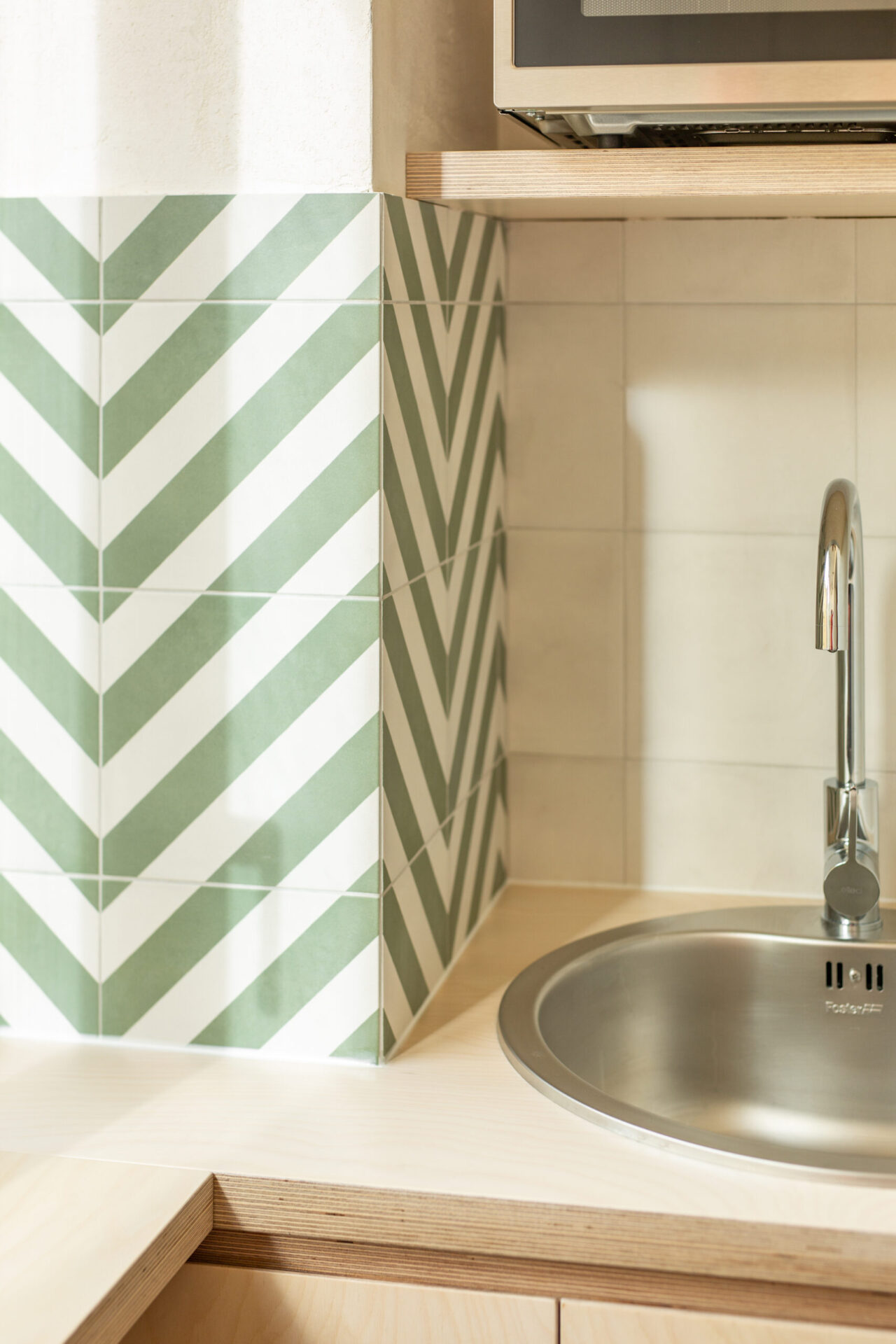 In this small apartment of just 35 m2 designed by Studio Manuarino and trasformed into the B&B Otium the key feature is the distinctive floor with a zigzag pattern created with the Contrasti series in the green Tappeto 10 finish, used throughout the interior to create a visual impression of a much larger space.