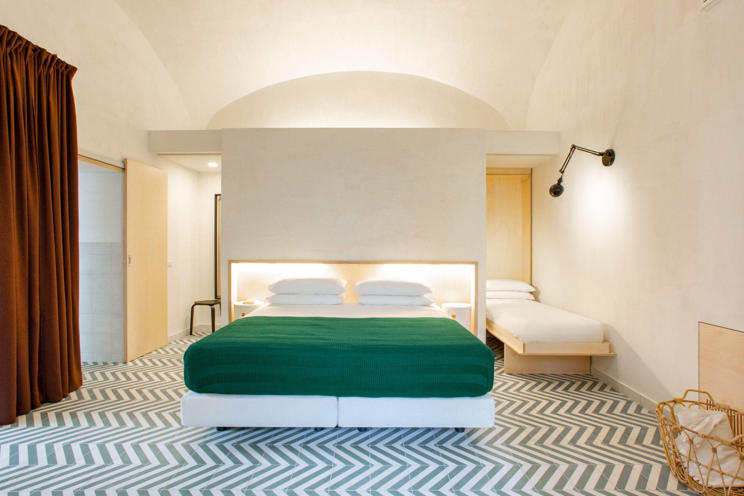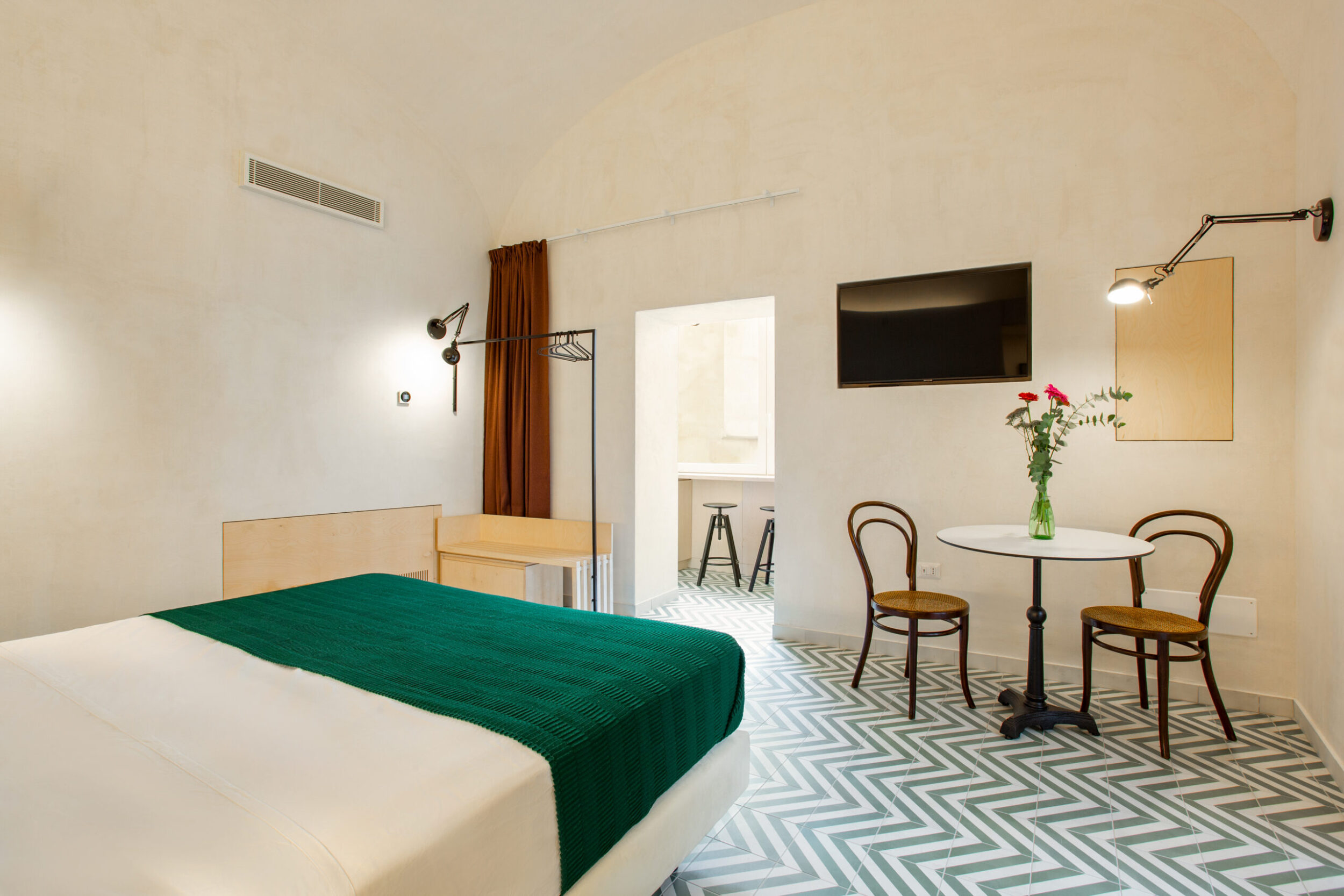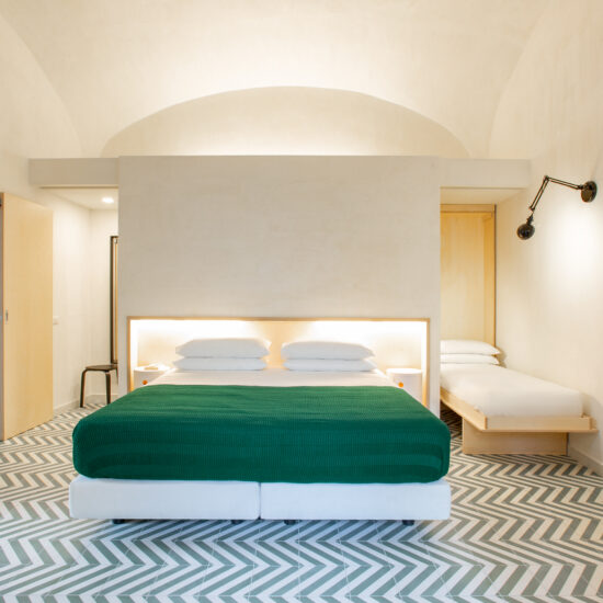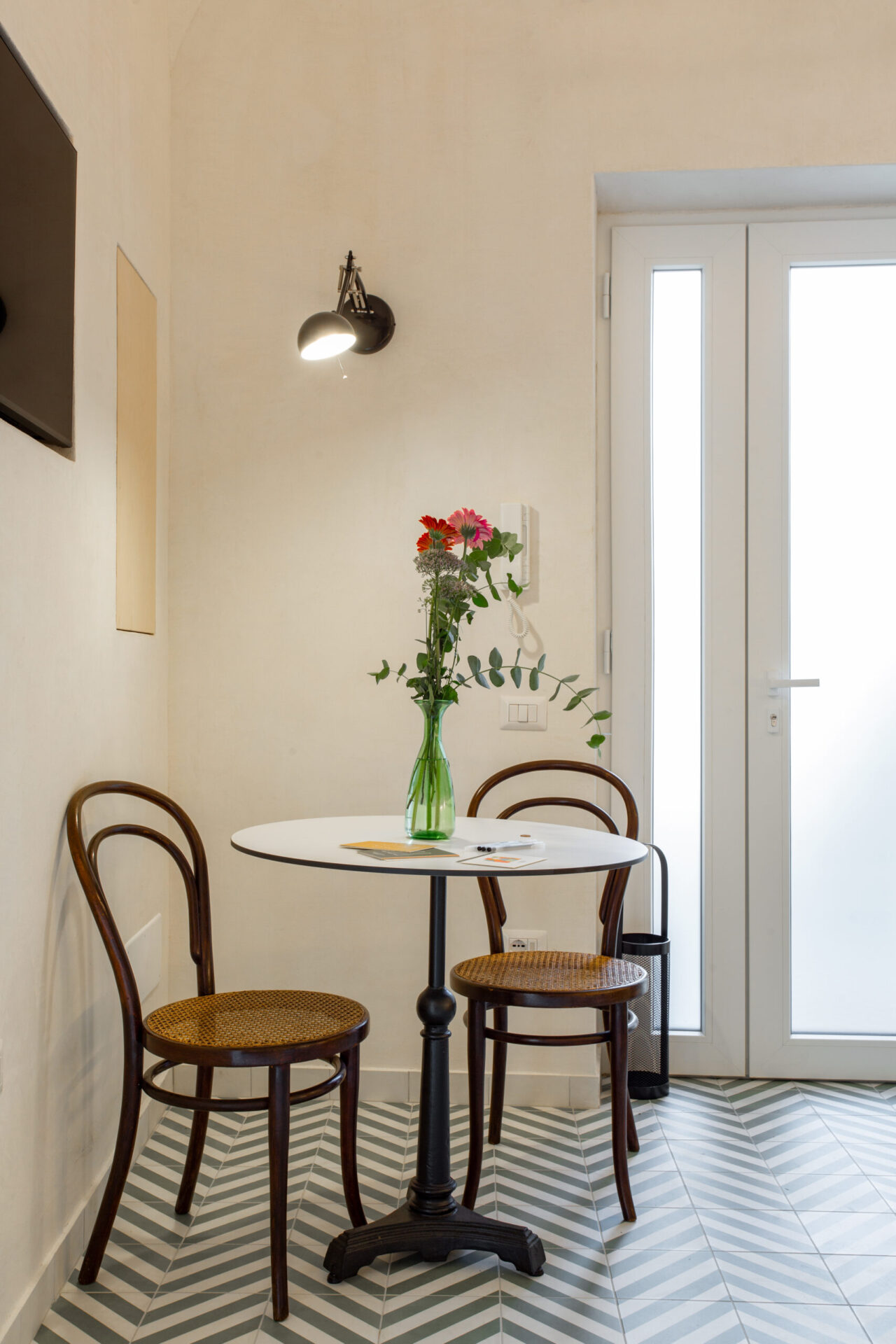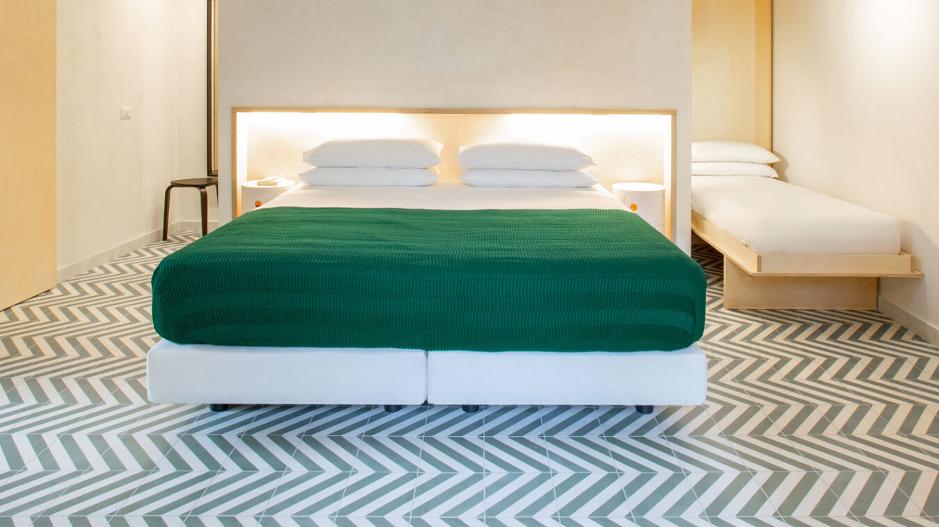 In this small apartment of just 35 m2 designed by Studio Manuarino and trasformed into the B&B Otium the key feature is the distinctive floor with a zigzag pattern created with the Contrasti series in the green Tappeto 10 finish, used throughout the interior to create a visual impression of a much larger space.