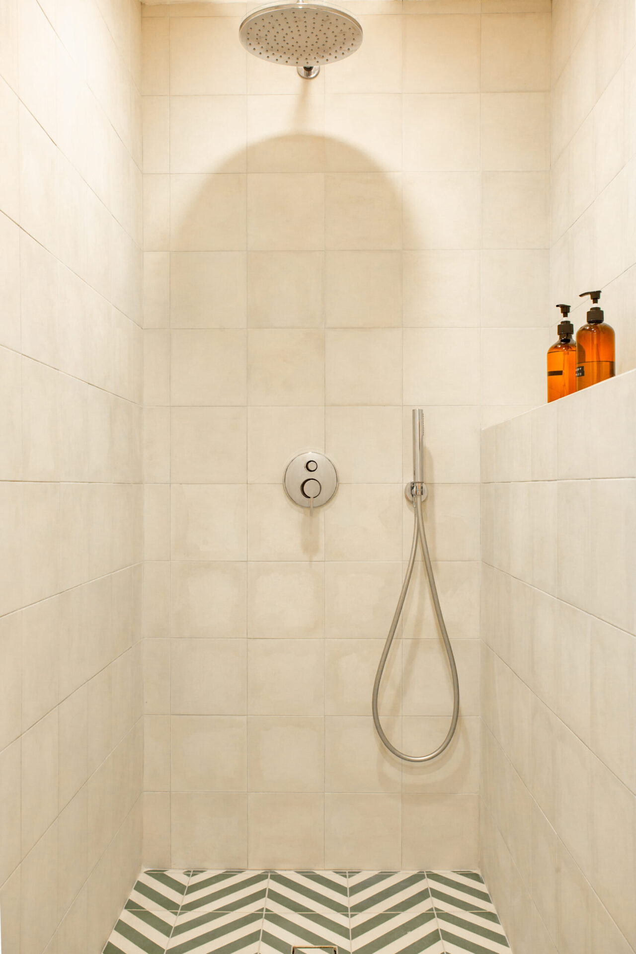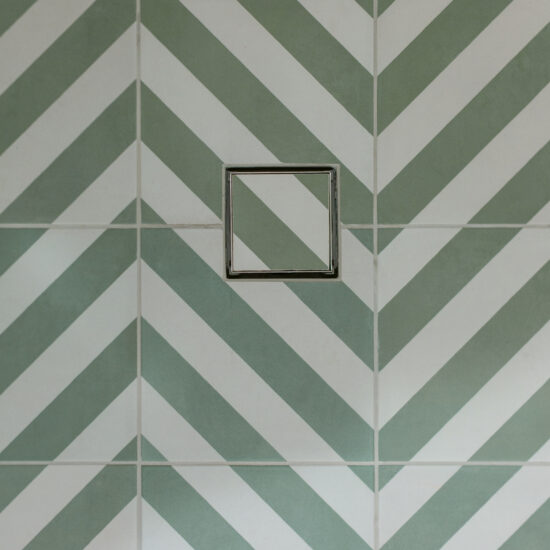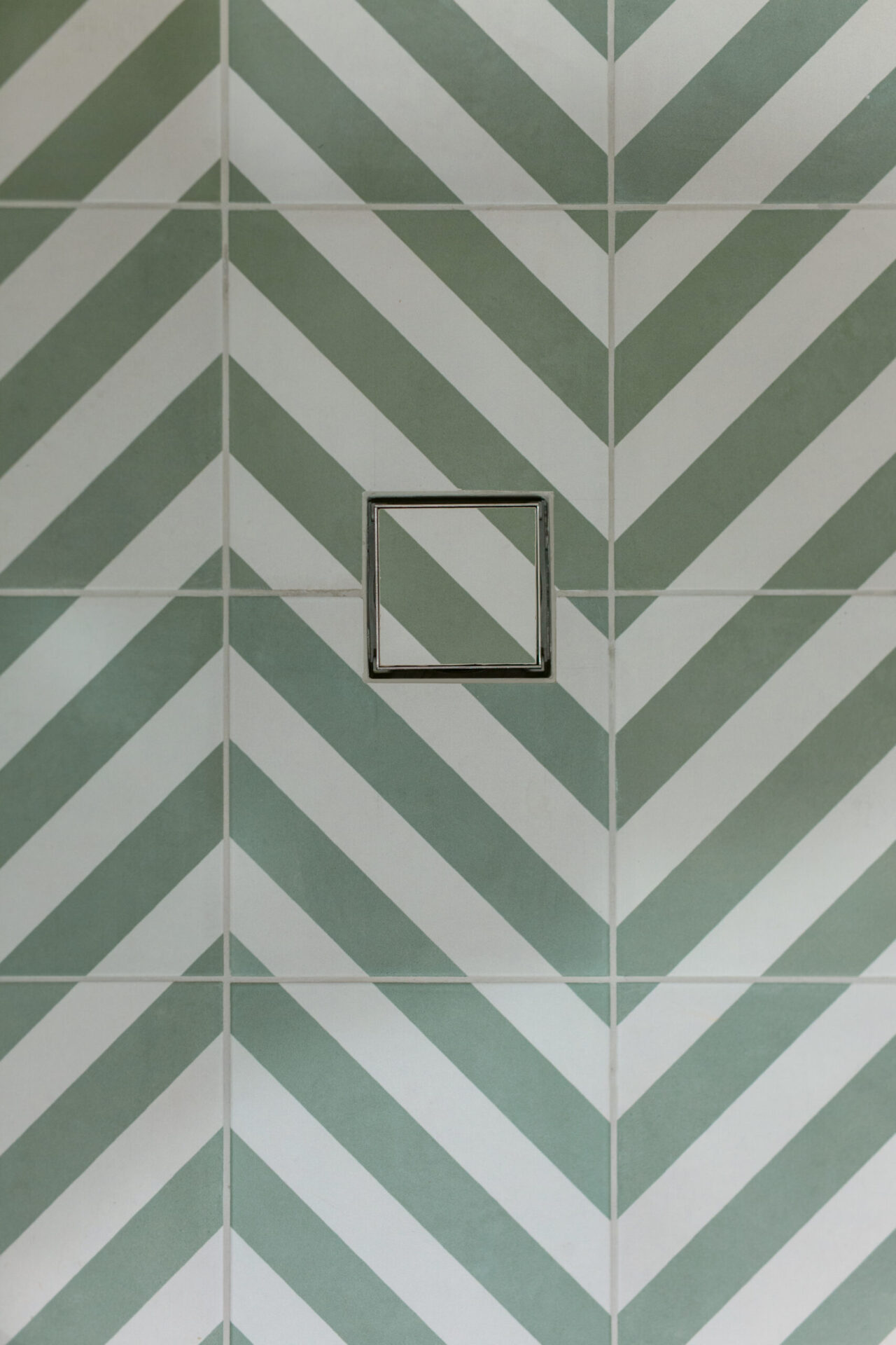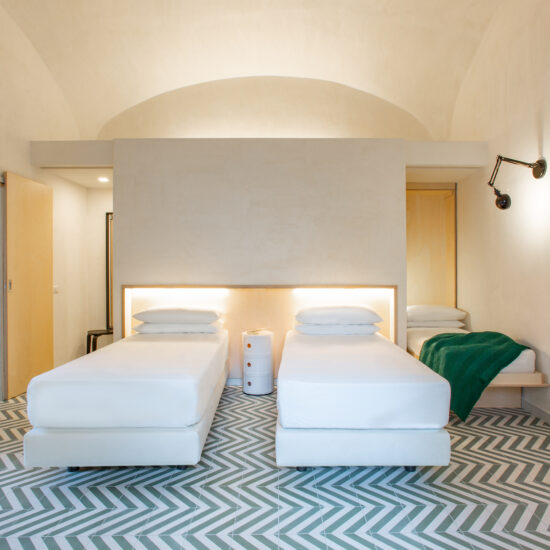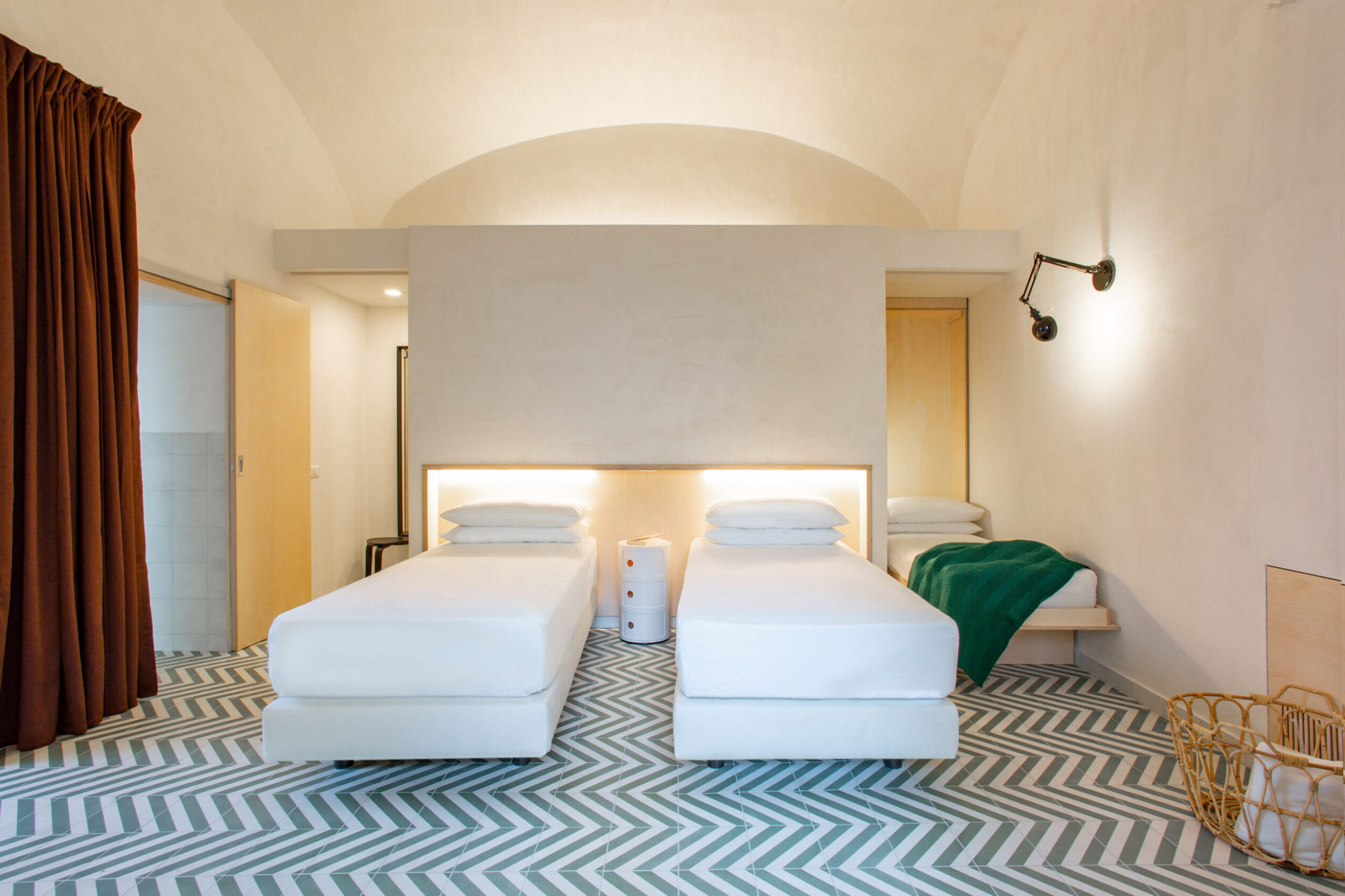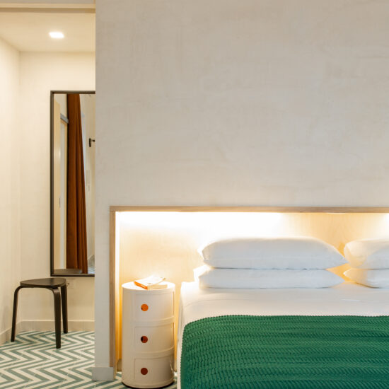 In this small apartment of just 35 m2 designed by Studio Manuarino and trasformed into the B&B Otium the key feature is the distinctive floor with a zigzag pattern created with the Contrasti series in the green Tappeto 10 finish, used throughout the interior to create a visual impression of a much larger space.