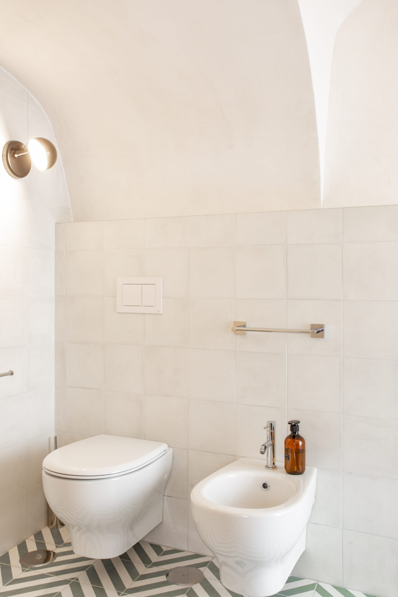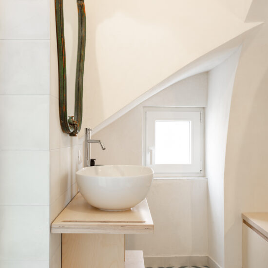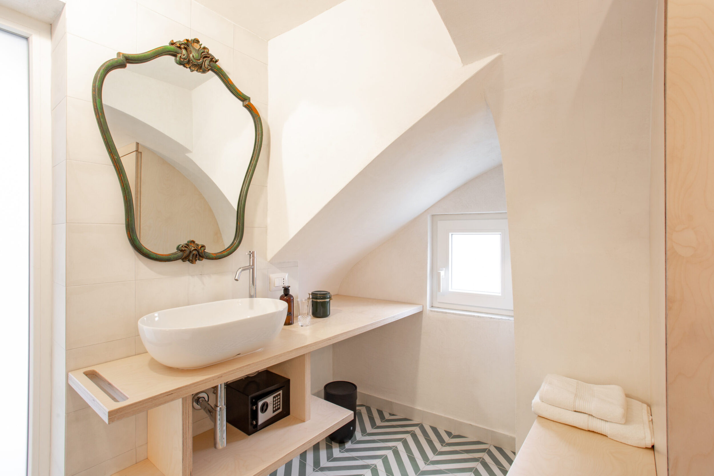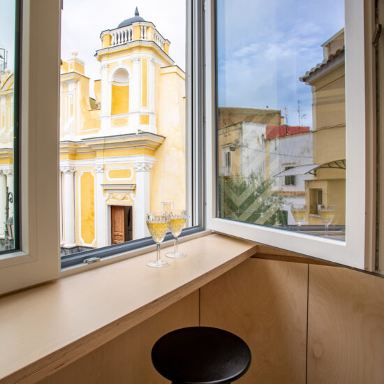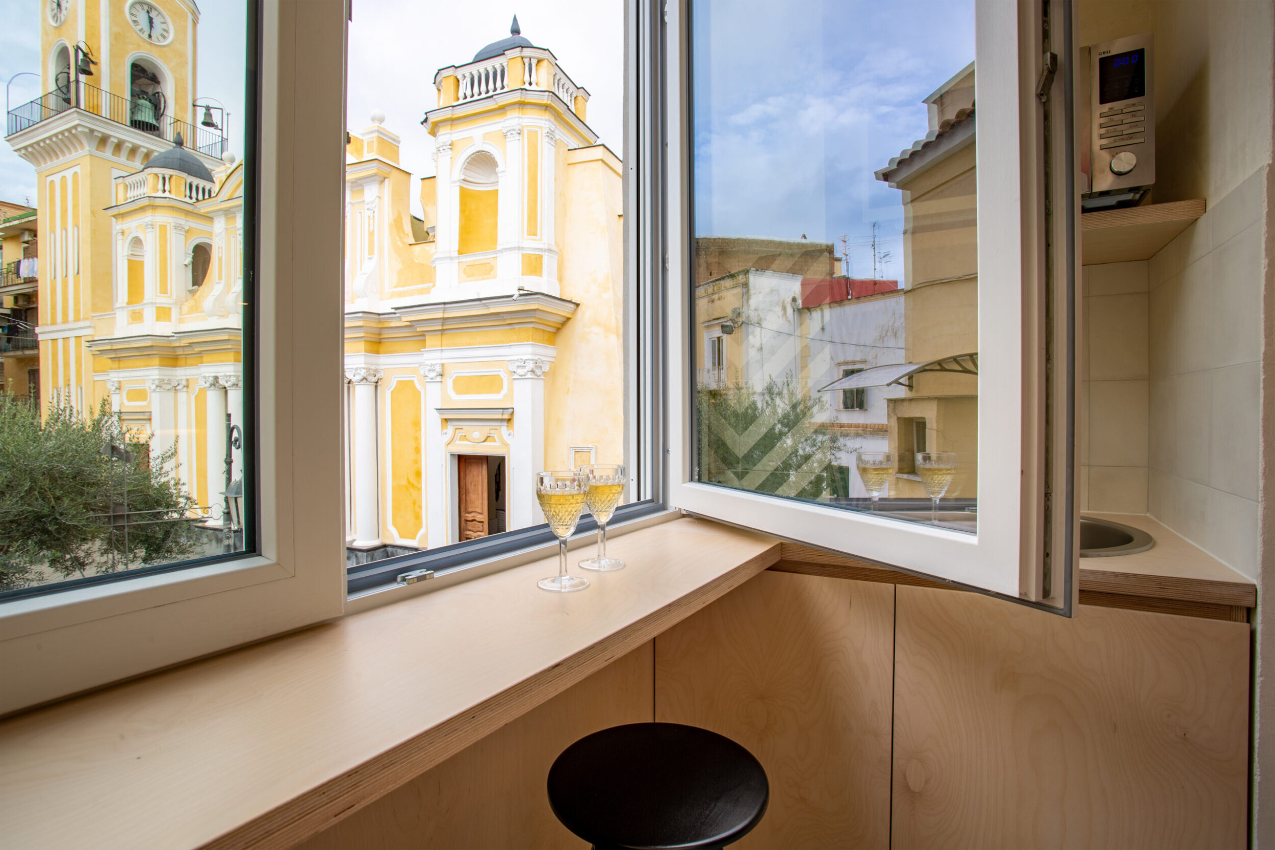 The main room – used as a bedroom – communicates with the small kitchen corner, which directly overlooks the yard of the church of SS. Maria Assunta, the oldest in Monte di Procida: the bespoke birch wood furnishings also provide surfaces for a small snack corner, complete with two stools for enjoying the view. The kitchen’s backsplash is covered with the Contrasti porcelain stoneware series in 20 x 20 size and Bianco finish.