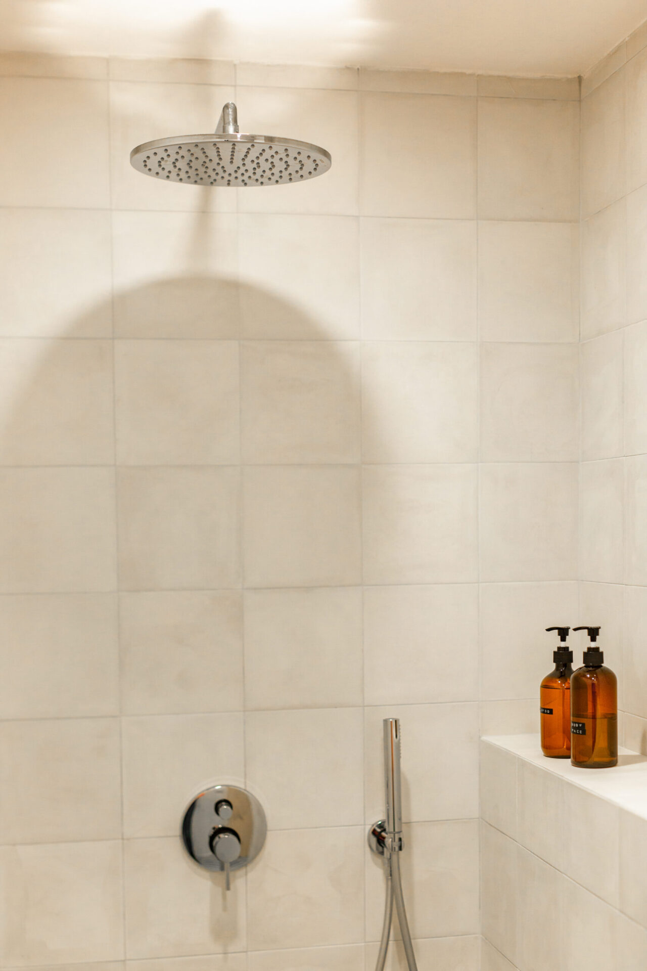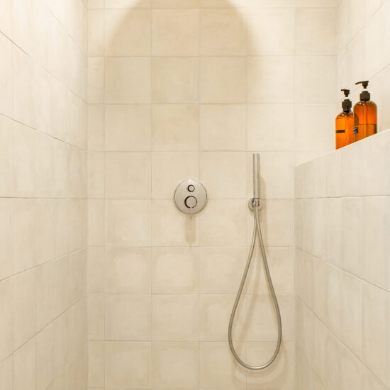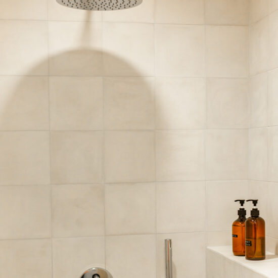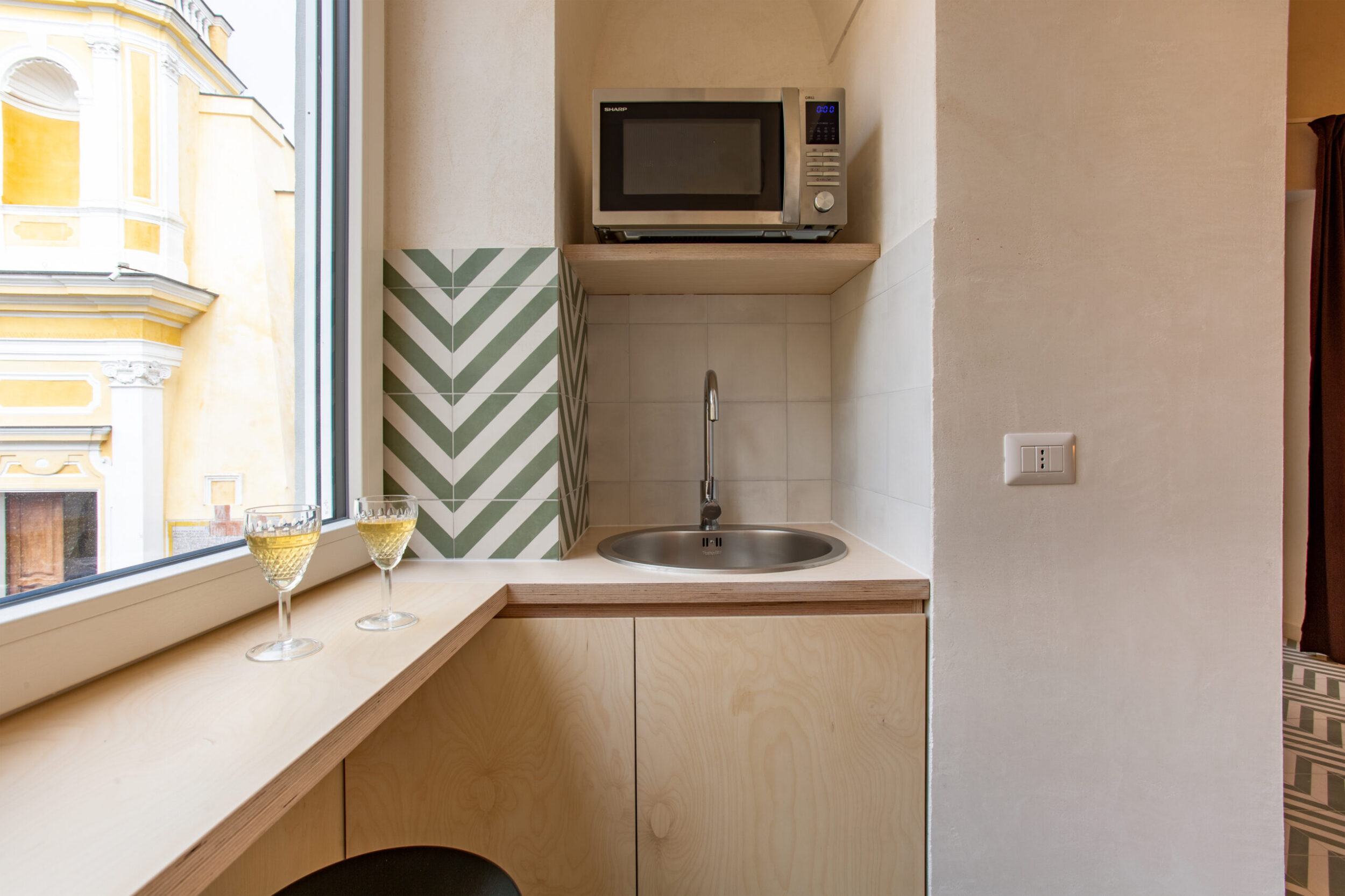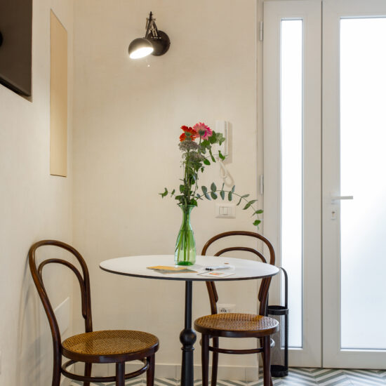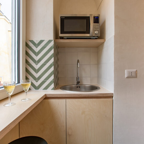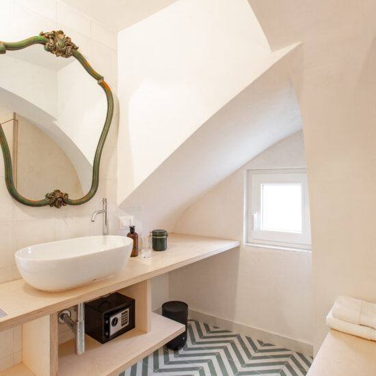 The main room – used as a bedroom – communicates with the small kitchen corner, which directly overlooks the yard of the church of SS. Maria Assunta, the oldest in Monte di Procida: the bespoke birch wood furnishings also provide surfaces for a small snack corner, complete with two stools for enjoying the view. The kitchen’s backsplash is covered with the Contrasti porcelain stoneware series in 20 x 20 size and Bianco finish.