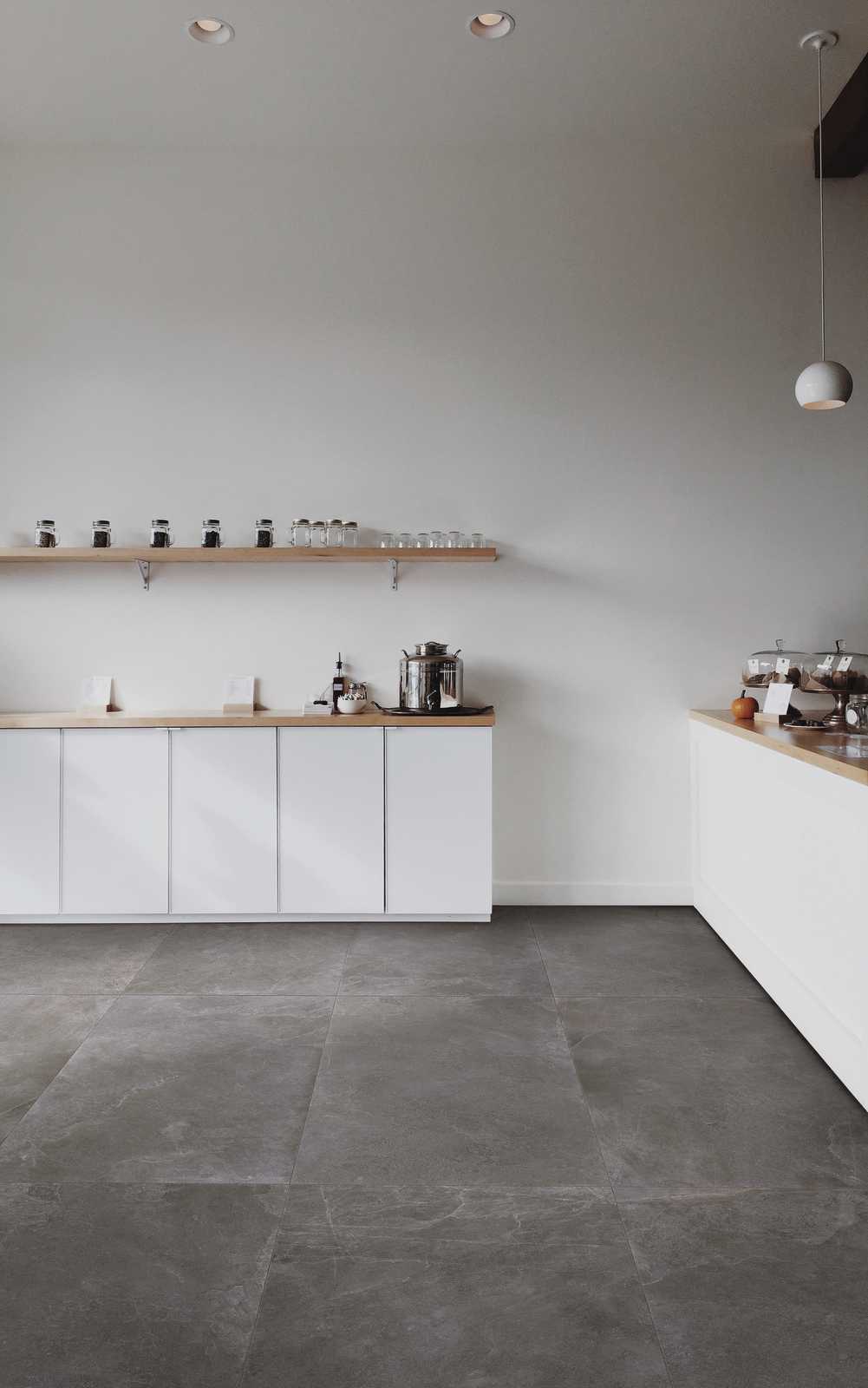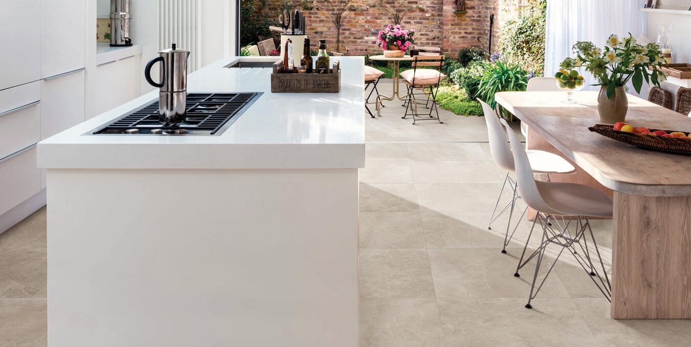 A large full-height sliding glass door separates the living area from the porch overlooking the garden: it is the only physical separation between indoors and outdoors because Realstone_Slate – in the 75×75 cm size – runs seamlessly from the porch to the entrance, thus extending an interior that is not particularly large and giving you a sensation of being in a single space when the door is fully open. The neutral colour (Shell) gives us the ability to invent any style: sofas covered with soft cushions in colours ranging from light blue to Air Force blue, together with a large table made of honey-coloured raw wood, which warms the atmosphere and contrasts with the ultra-modern style of the high-tech kitchen.