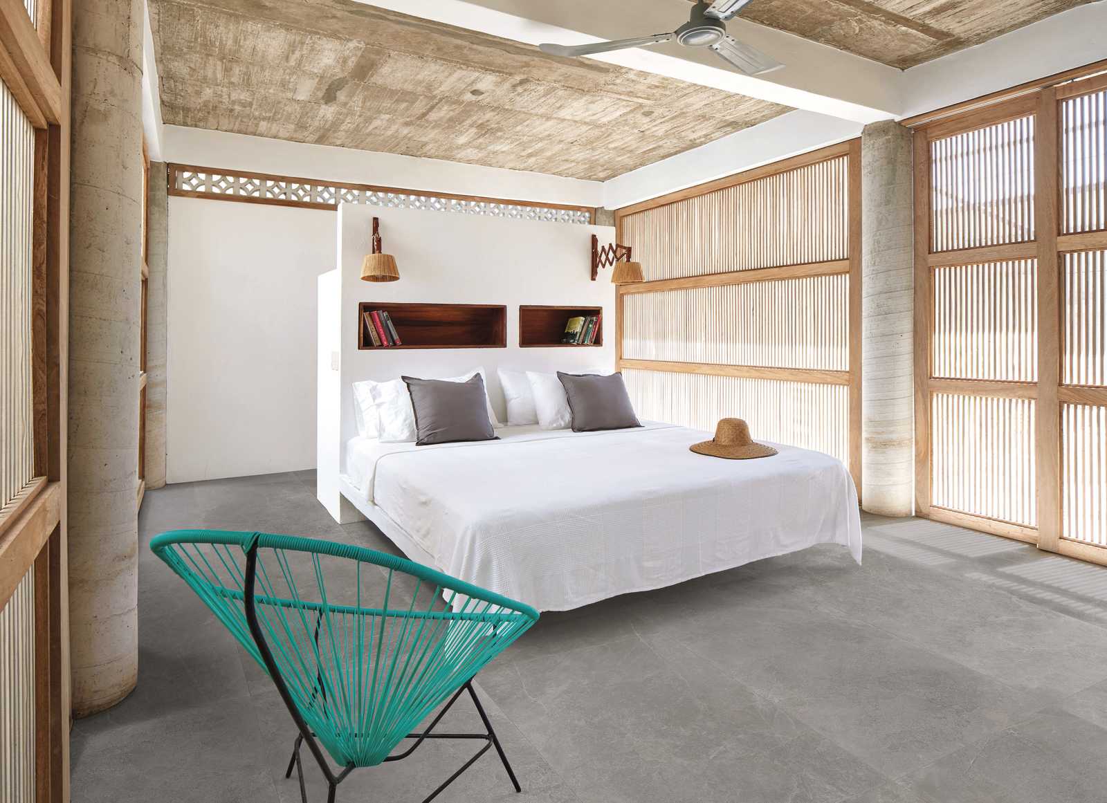 A warm leather colour covers the furniture’s finishes and fabrics in a playful combination of design pieces and retro furnishings. Two Chesterfield sofas facing each other in the centre of the room, vintage-style lamps and a large dark wood table perfectly define this imagined interior with a slate-effect stoneware floor in the Musk colour, perhaps in the largest Realstone_Slate size (75×150 cm).