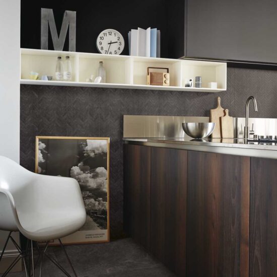 In a minimalist kitchen, you can create a striking effect by focusing on the contrast between the colours of the furniture and the splashback. For example, by combining light furniture with dark tiles, such as the Realstone Slate slate-effect porcelain stoneware tiles by Ragno available in shades of iron, musk and black.