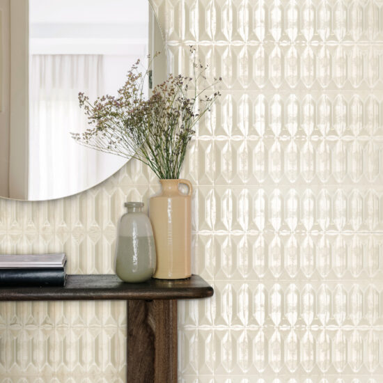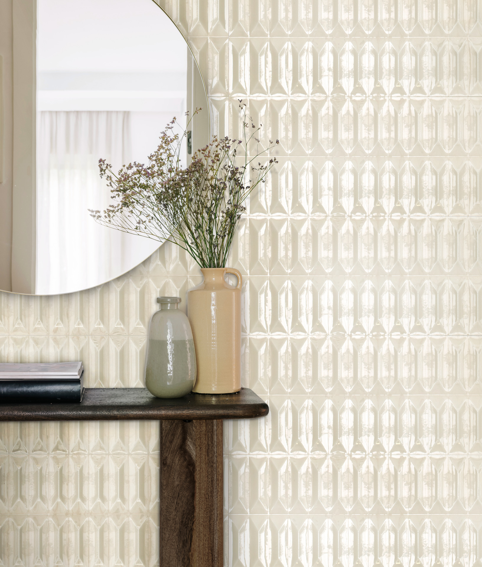 The visual interplay of tone-on-tone/light-dark outlines the contours of graphic effects that materialise on a dense, glossy surface. For this decor, horizontal, full-wall, vertical column or boiserie installation is recommended.