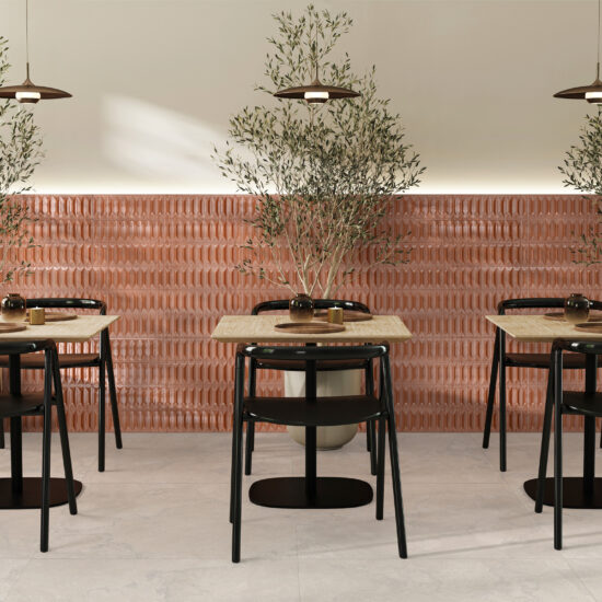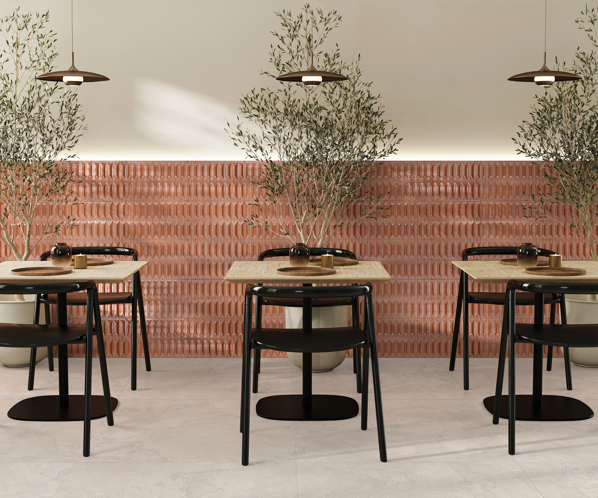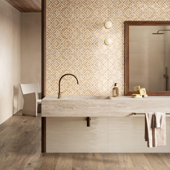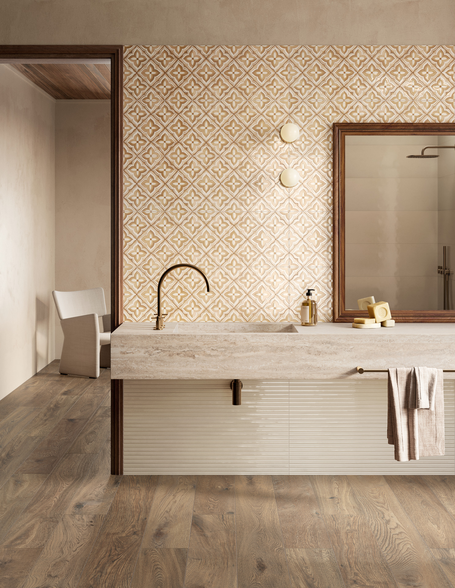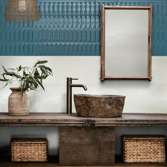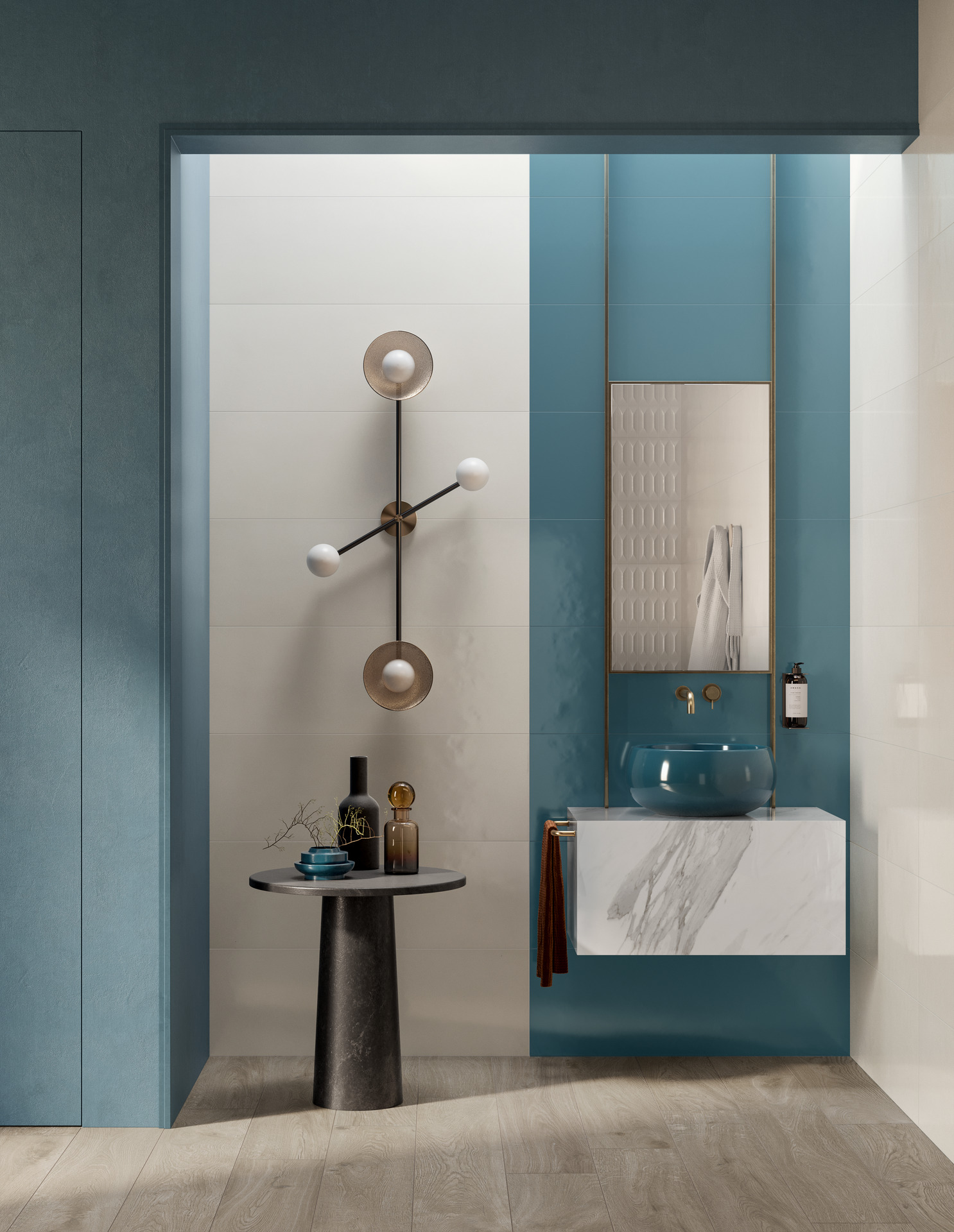 Lucida is an aesthetically versatile series. All subjects in the series are suitable for creative combinations with each other, including with strong color alternations, such as Brick with Forest, or Ocean with Ice. For the choice of flooring, it is also interesting to install Lucida with the woods from the Ragno collections in the catalogue, achieving a more navy look when paired with the Ocean and Ice colors, more elegant with Cream and Brick, and wilder with Forest. Pebbles and ‘ceppi’ create a striking and distinctive contrasting tactile effect, specifically different 60×60 cm shades of Amuri to emphasize tradition and ‘the handmade’. Lucida can be combined with Realstone_Travertino for a simple and sophisticated styling, or with Stratford for a more sophisticated industrial atmosphere.