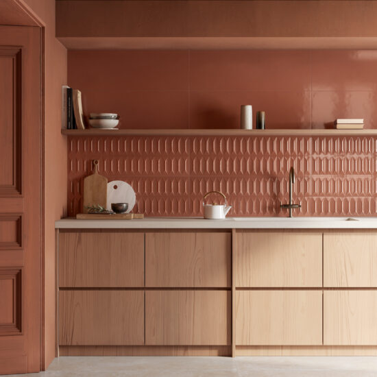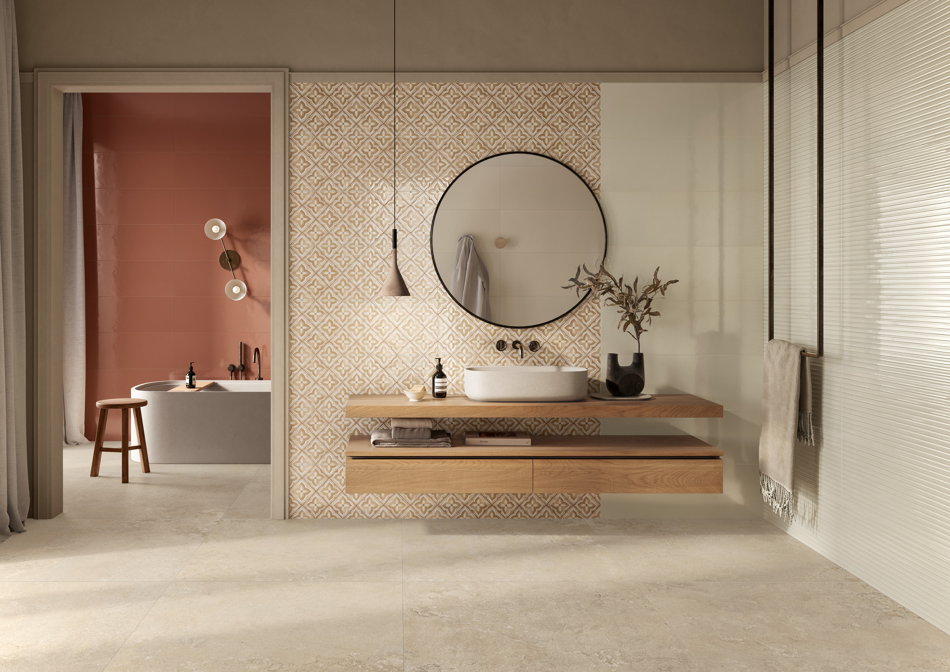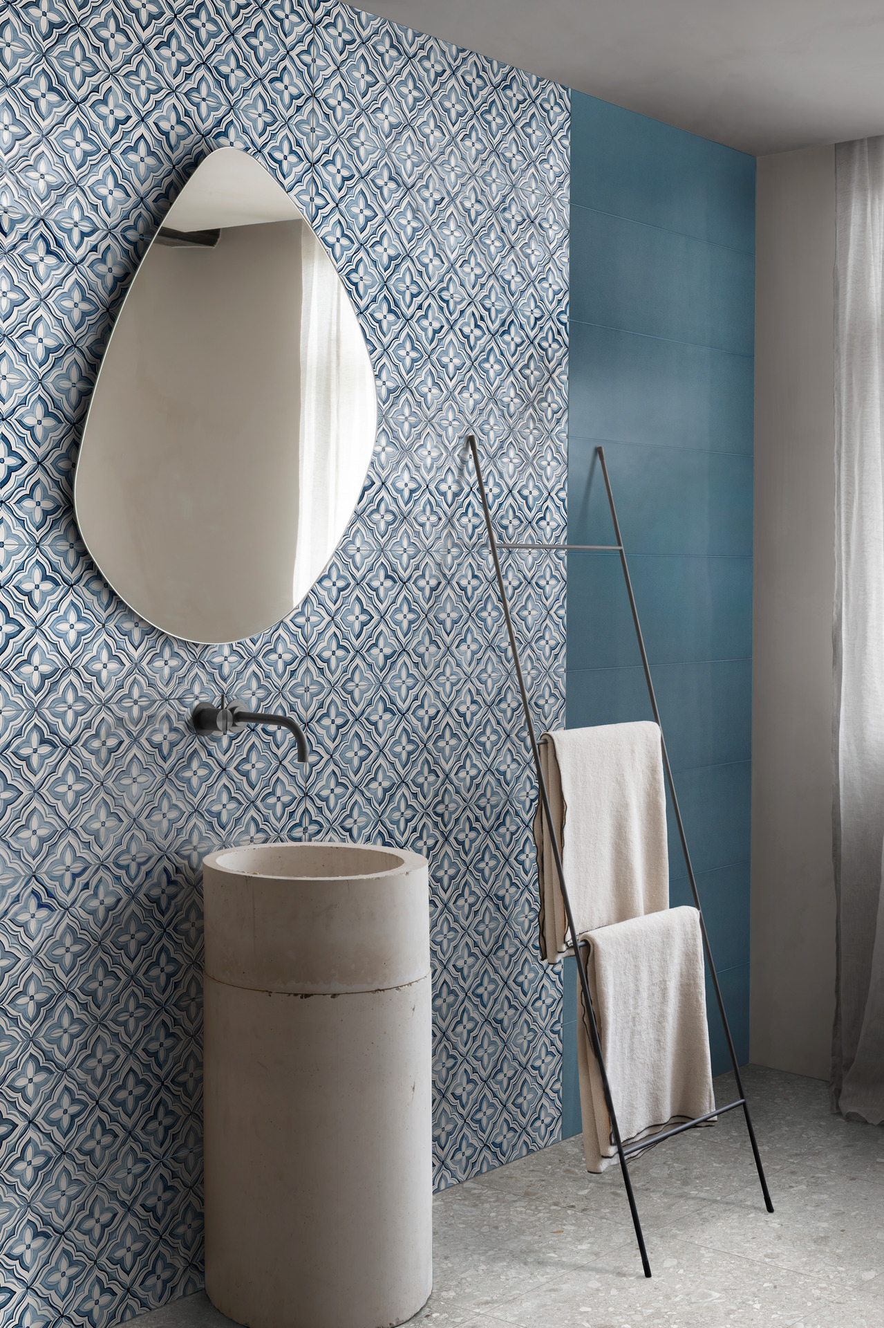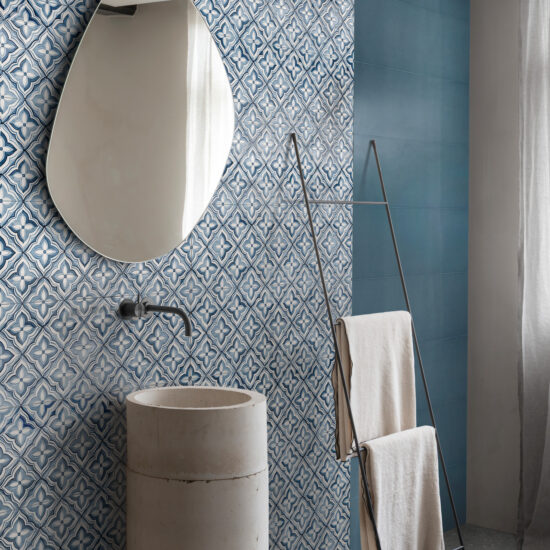 Finally, explicitly recalling hand-decorated majolica, the Motif Decor offers a traditionally inspired relief pattern made with Touch technology; it is available in two shades that can be matched with the Cream and Brick plain tiles or the Ice and Ocean plain tiles with cooler colors.