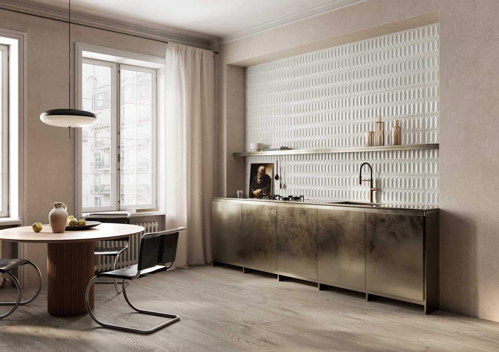 In the new Lucida wall covering collection, an increasingly conscious design interprets a majolica dating back to the ancient Ladino tradition of masonry stoves created with ceramic tiles and distinguishing the main room of the most stately homes in the Italian alpine regions, where the family would gather to spend long winter evenings, telling stories and handcrafting. A symbol of hospitality and family warmth, the masonry stove not only heated the entire room, but also constituted the heart of the home, keeping a sense of cultural identity alive.