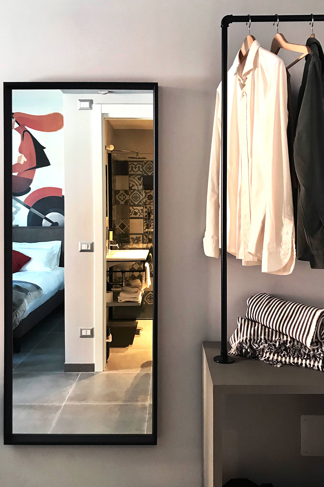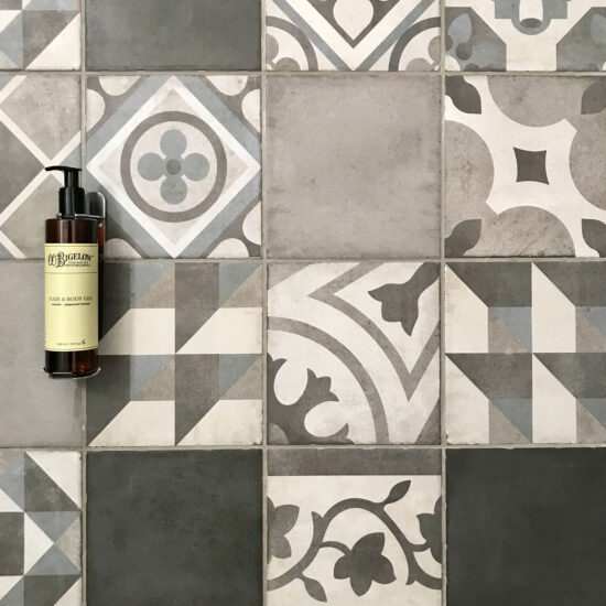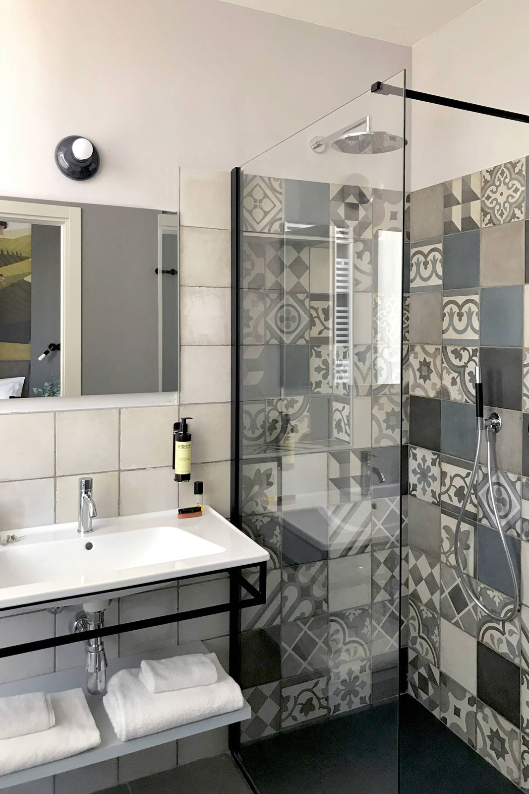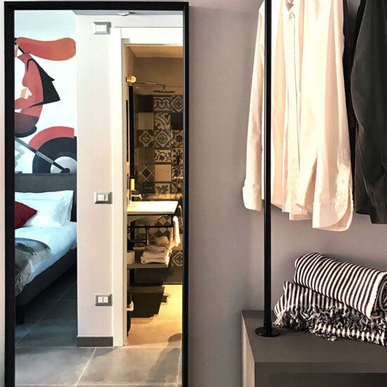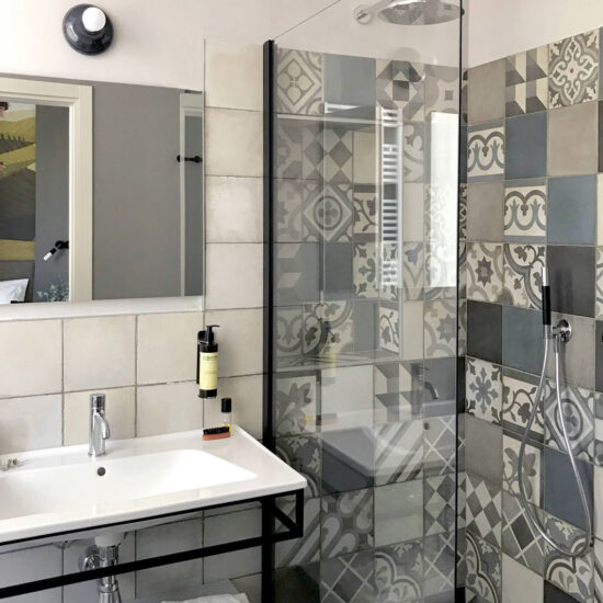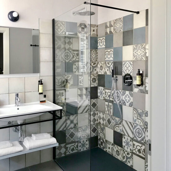 In the bathrooms, places of intimacy clearly distinct from the hotel's rooms themselves, the need was felt for something that, while different, would still harmonise with and complement the rest of the design scheme. The highly decorative Ottocento collection by Ragno seems tailor-made for creating interiors of character by rediscovering geometric motifs popular in the past. The shower alcove, in particular, is lined throughout with 20×20 cm tiles in a single texture but with different colours and patterns: Talco, Pomice, Basalto and Cobalto on the one hand and guilloche patterns, lines and geometrical forms on the other.
