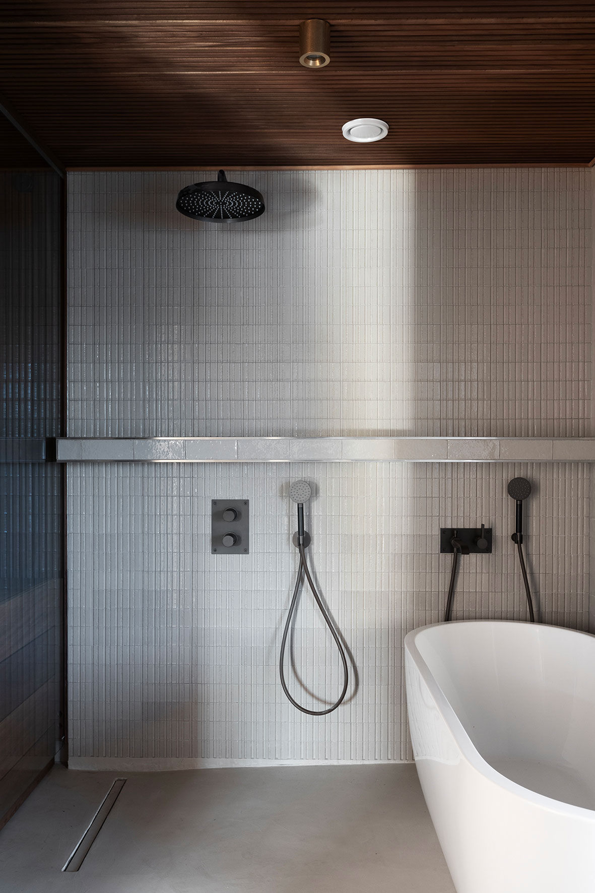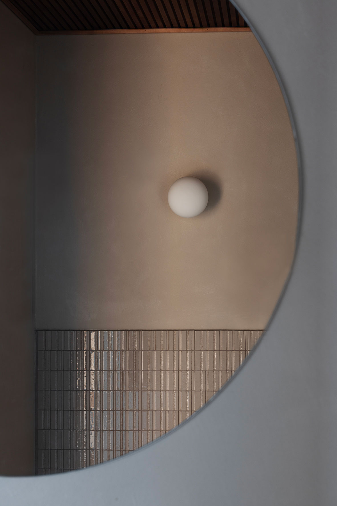 Nell’area Spa e nella sauna al secondo piano, lo studio Palinpera ha scelto sempre la collezione Glacé nel colore più chiaro, Mastice, e nella sua struttura tridimensionale Rayé 3D che presenta delle scanalature larghe e profonde per un effetto ‘barcode” che alterna smalti lucidi e opachi, per conferire alle pareti profondità e ricchezza cromatica.