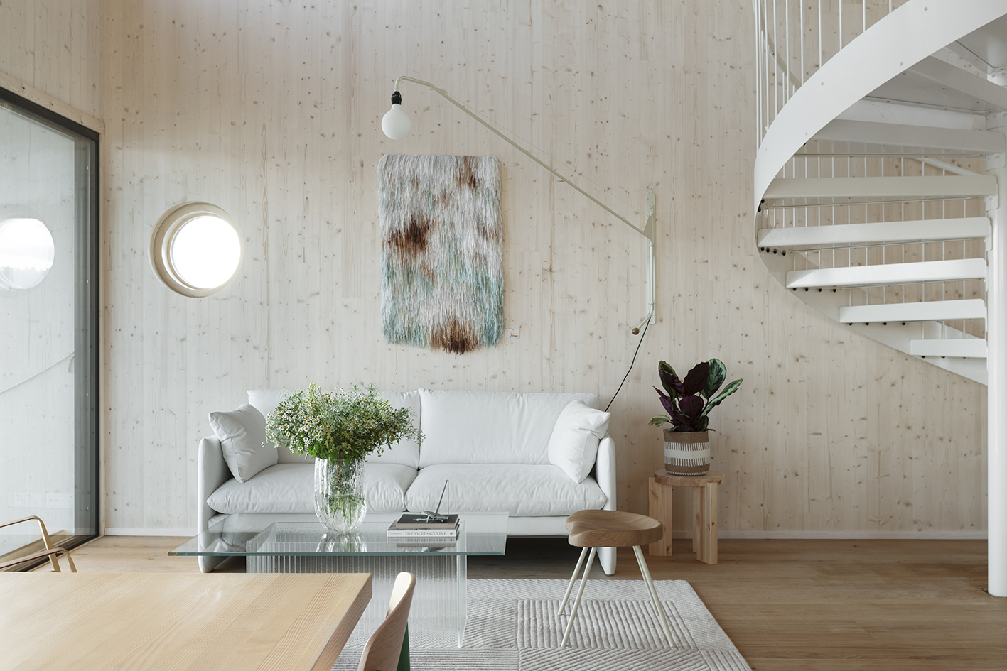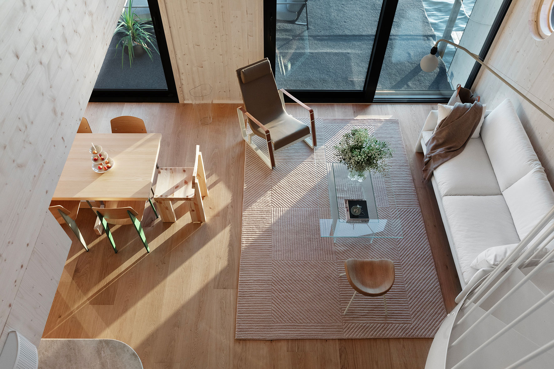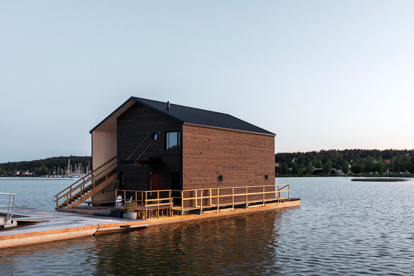 Siamo a Loviisea, sulla costa est-sud della Finlandia, nella Fiera Annuale dell’Housing Finlandese. Lo studio di architettura Ilkka Palinpera è stato incaricato di occuparsi della progettazione degli interni di Lovisea Floating House, una casa galleggiante immersa nelle acque del Golfo di Finlandia.