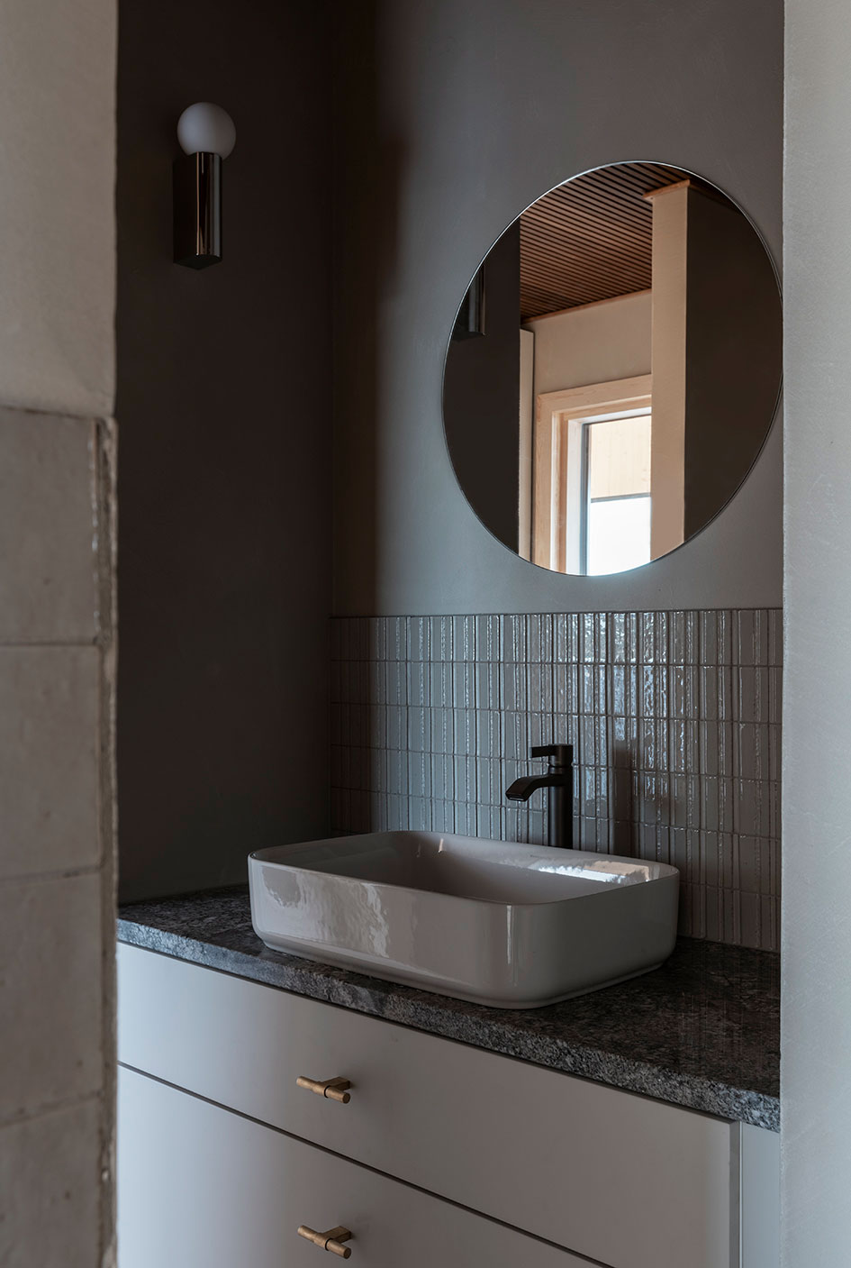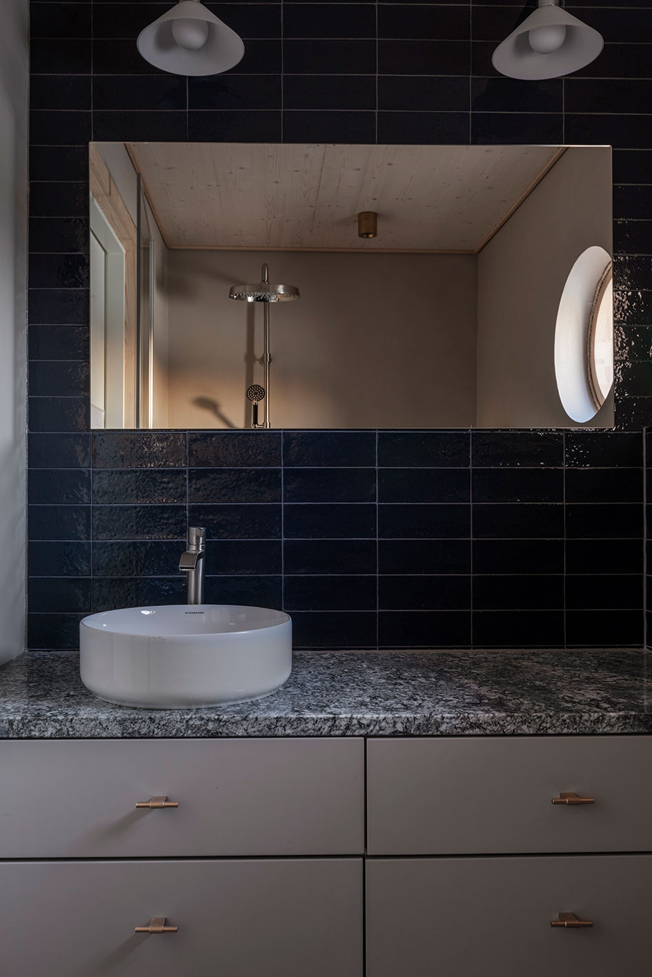 Uno degli elementi che definiscono l’eccezionalità di Lovisea è l’uso sapiente dei materiali. Nel bagno al primo piano, si è optato per la collezione in gres porcellanato Glacé nel colore Blu notte, abbinata a un microcemento.