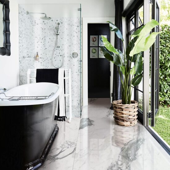 The exquisite Maiora Paonazzetto pattern, which features a delicate, elegant graphic design, is created by overlaying a mesh of soft charcoal-coloured veining on the white background of the timeless Bianco Carrara, which has always been synonymous with the purity and perfection of marble.