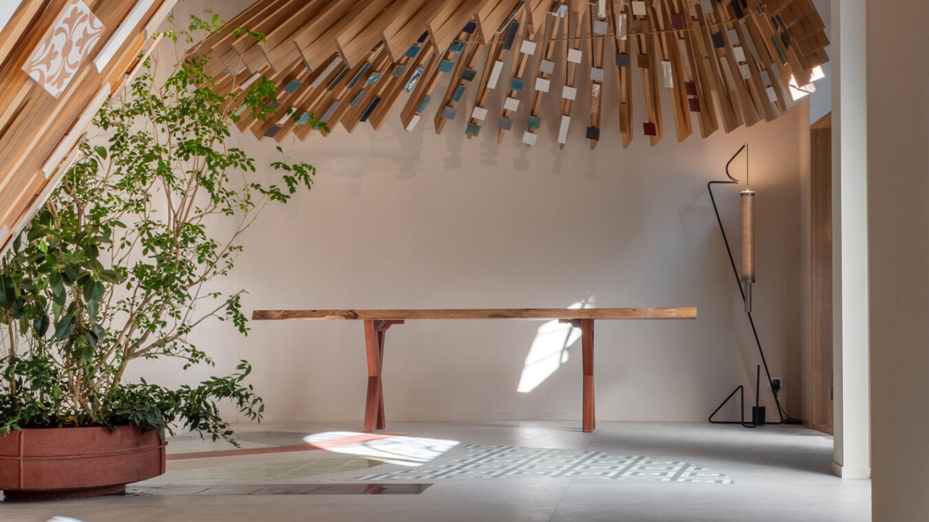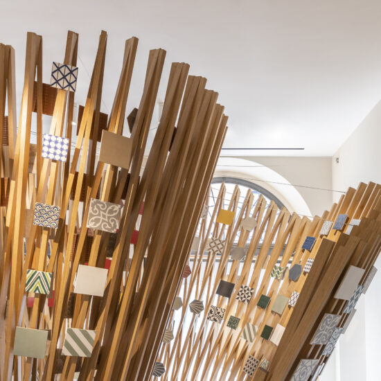 The collections are exhibited by means of a series of large wooden structures that imitate a spider’s web, building up a library of materials of different colours and finishes, which create a single fascinating storytelling experience extending throughout the entire space.