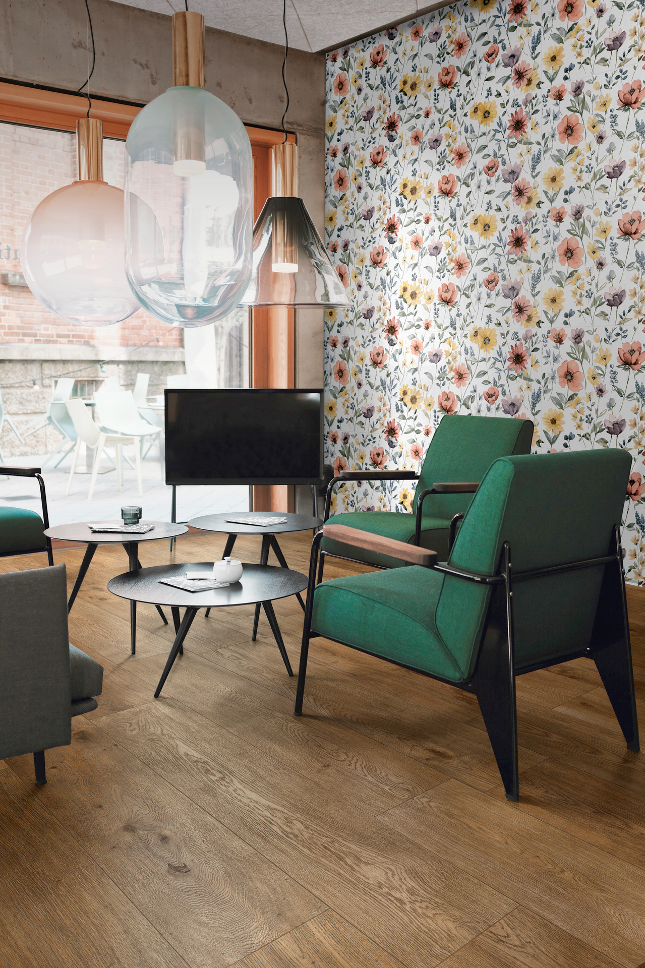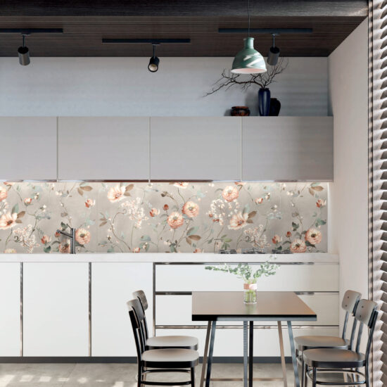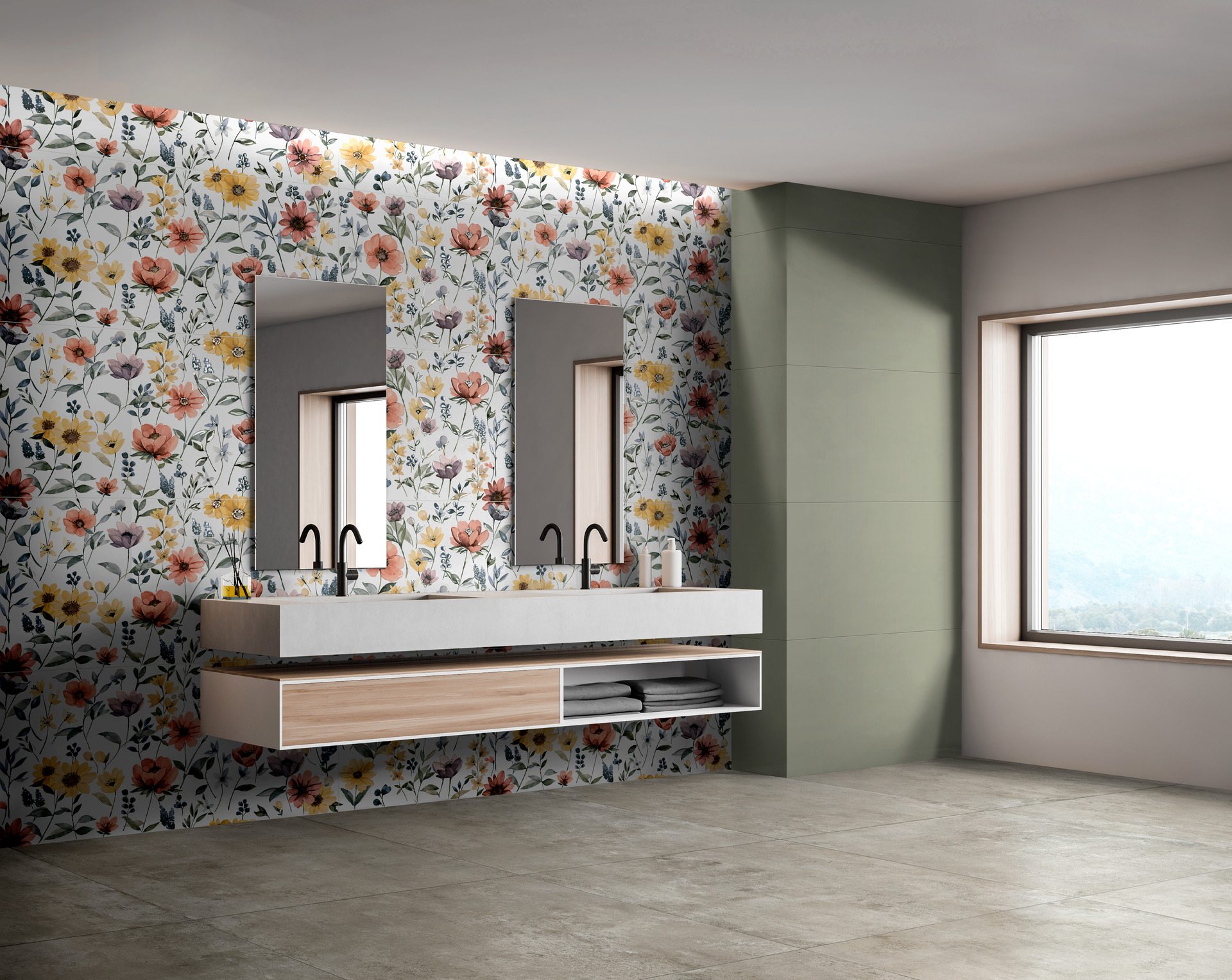 A large-size wallpaper-effect wall covering for creating striking backdrops in different decorative styles, to be matched with solid color plain tiles, for living spaces that tell your story.