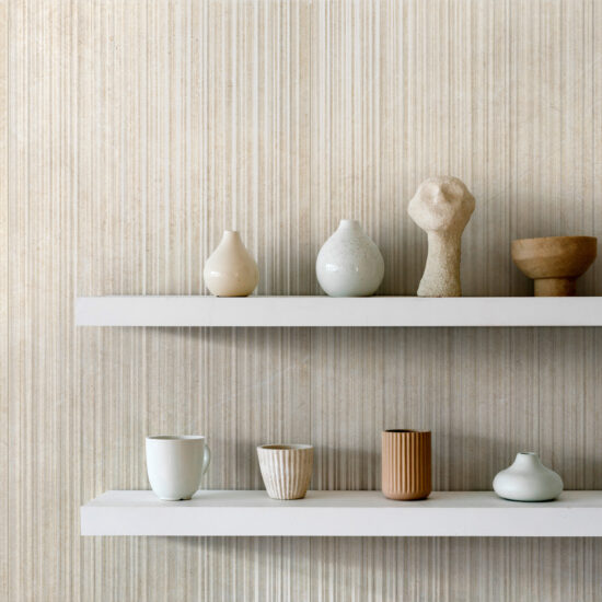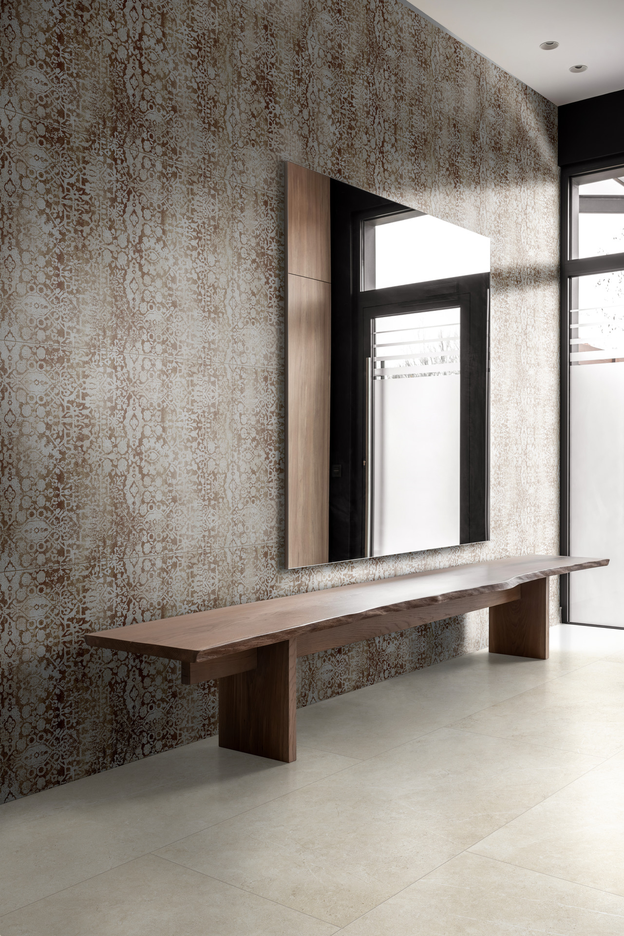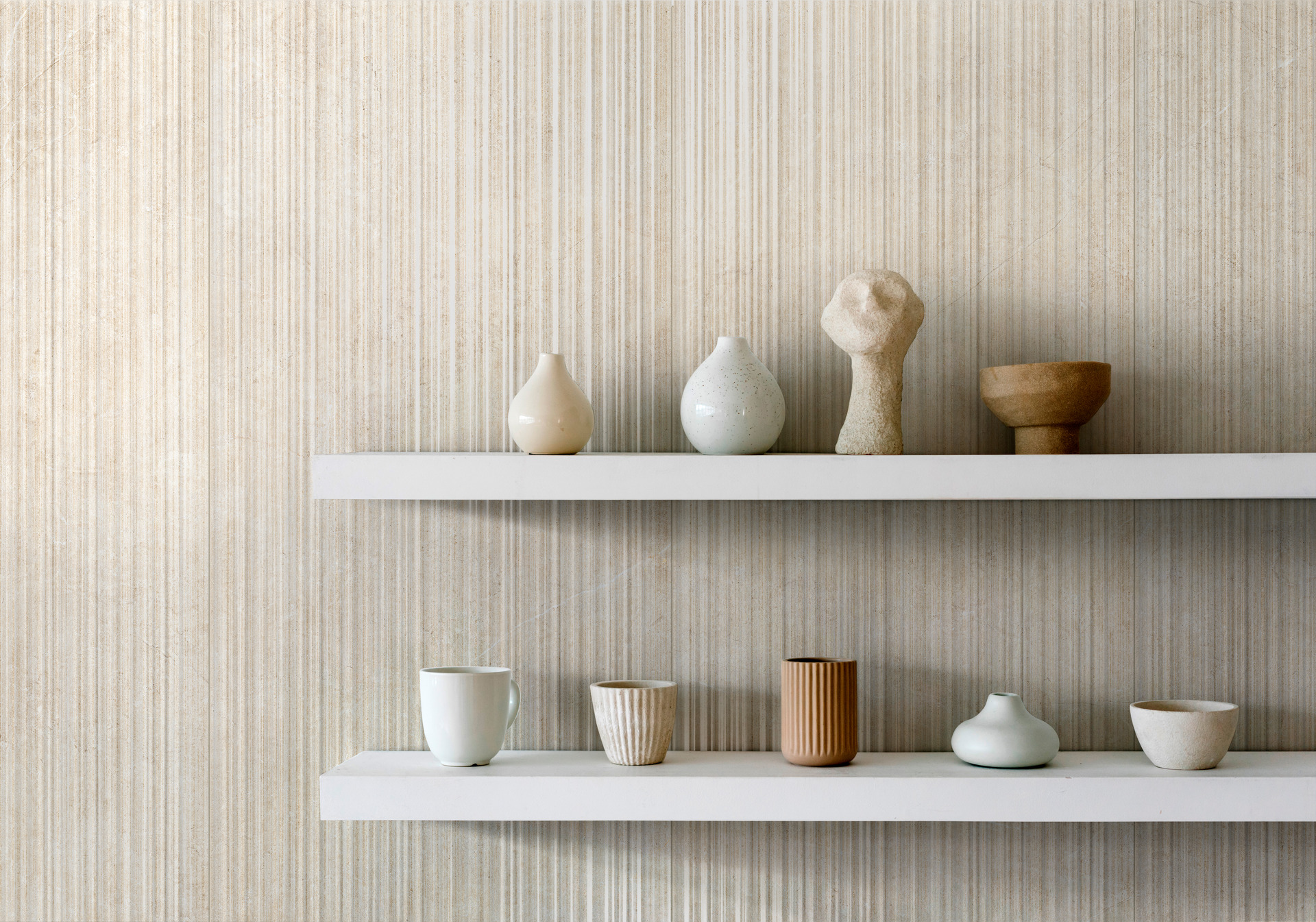 The Tapestry decor, in two versions, warm Avorio and cool Ghiaccio, is ideal not only for vertical surfaces but also for indoor floors with a strong, decided personality, with a timeless wallpaper effect. The Mosaico Rombi, available in all colours, and the Struttura Linee 3D, offered in the warm, enticing Miele and Avorio shades, personalise interiors and reference a minimalist aesthetic.