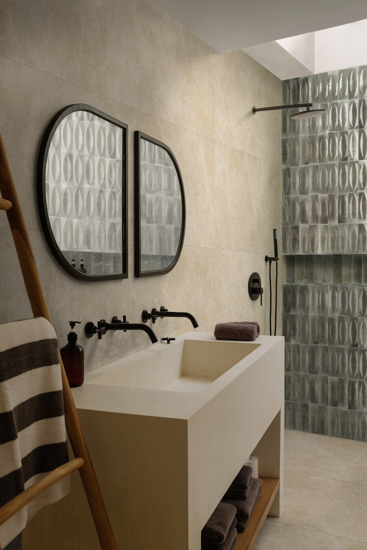 Ragno Ceramiche enlarges this stone effect porcelain stoneware collection with the new Miele and Ghiaccio colours and the Tapestry, Mosaico Rombi and Struttura Linee 3D decors. A neutral, matt-effect palette that guides the collection towards a continuum with a minimal, pure look. The Miele, Avorio and Sabbia colours add warmth to spaces, while the Ghiaccio shade restores their balance.