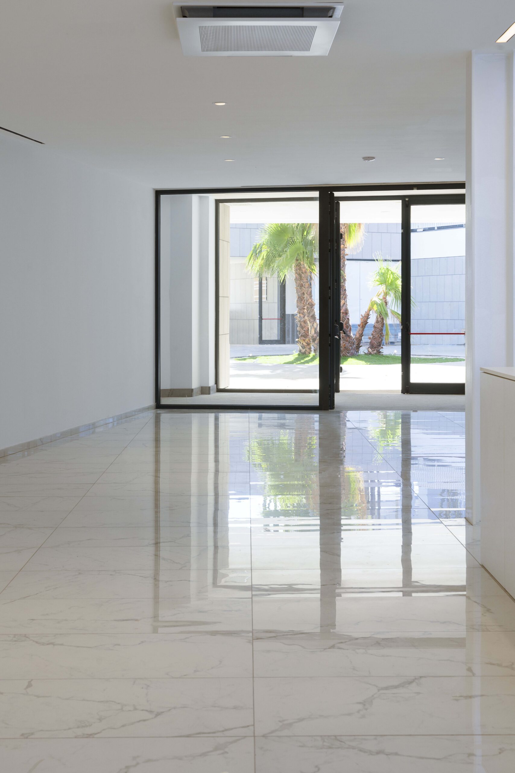 The various Ragno porcelain stoneware collections, chosen for their breadth of range and technical characteristic, alternate in the indoor and outdoor areas, giving the various spaces a distinctive personality. The institutional importance of the lecture rooms was impeccably underlined by the use of Imperiale Statuarietto marble-look large slabs in glossy finish. Similarly, the slightly uneven texture of Stratford in the severe Beige, White and Grey shades in Natural finish proved perfect for the offices and public areas. The glossy 3D effect of the bar counter covered with Glacé Muschio tiles, also with Rayé structure, again in Muschio color (7.5×20 cm), alternating with the warm shade of parquet-look Woodmania Honey (60×120 cm), is particularly eye-catching. This sophistication in the choice of coverings is found throughout the project.