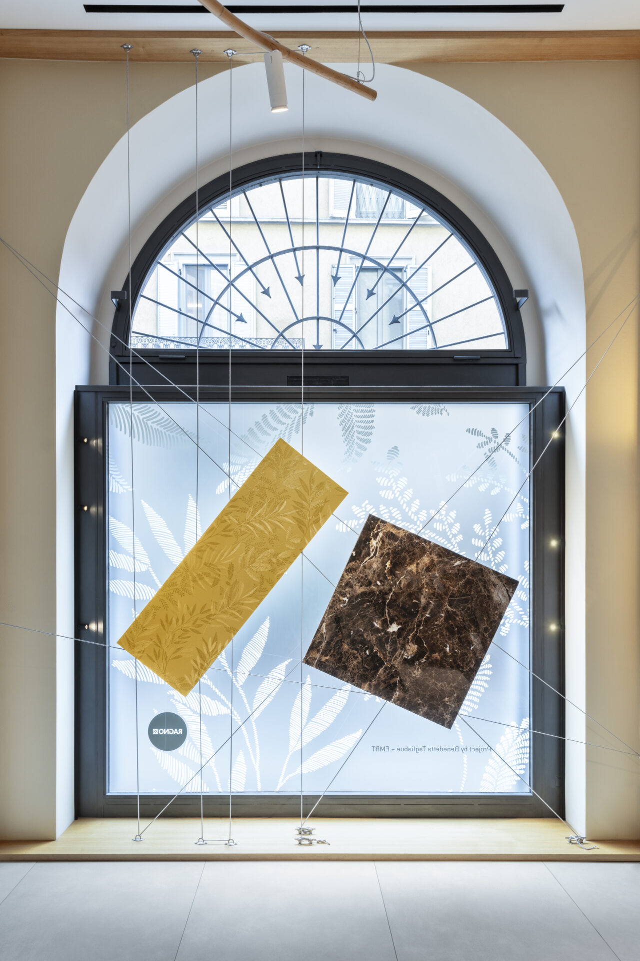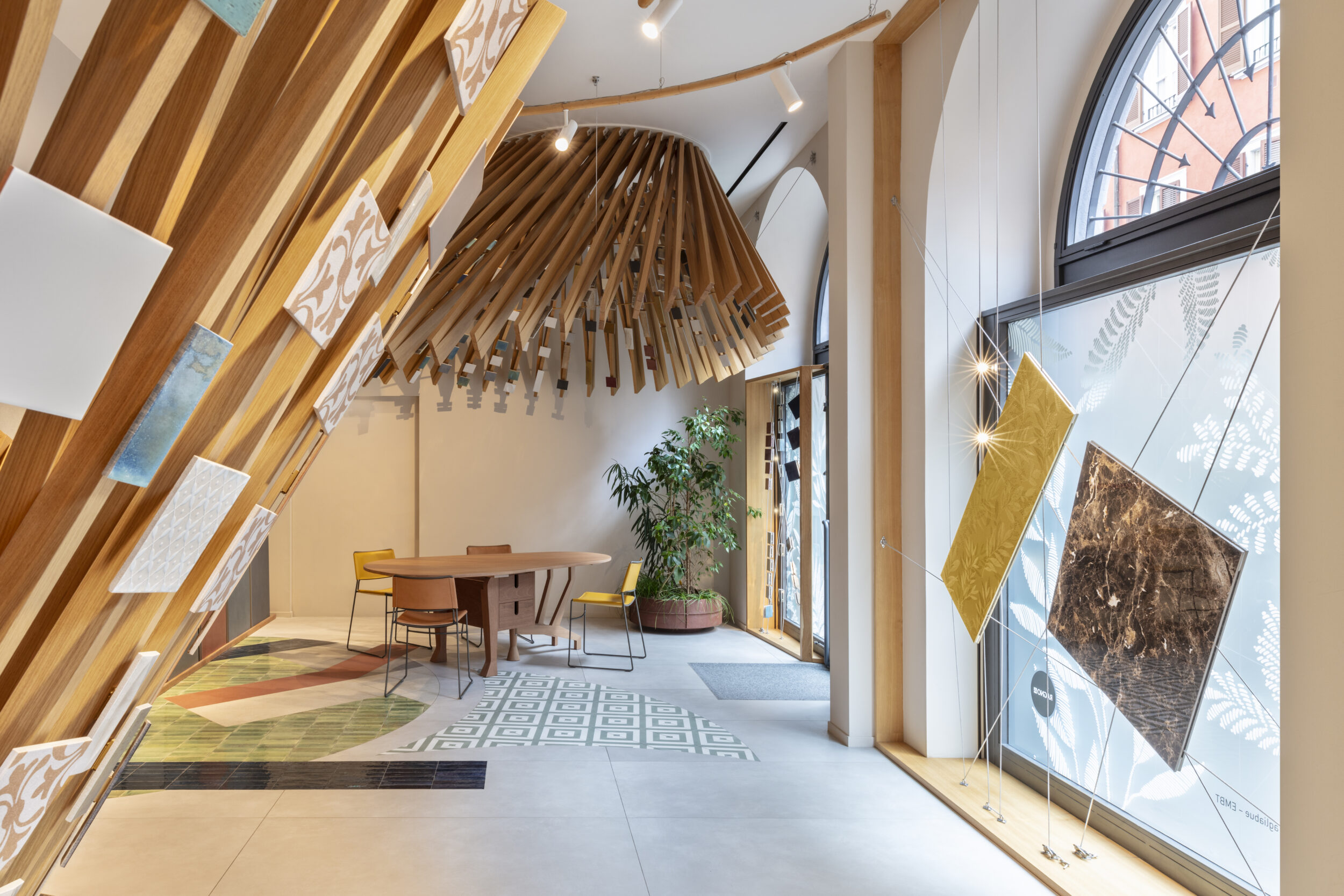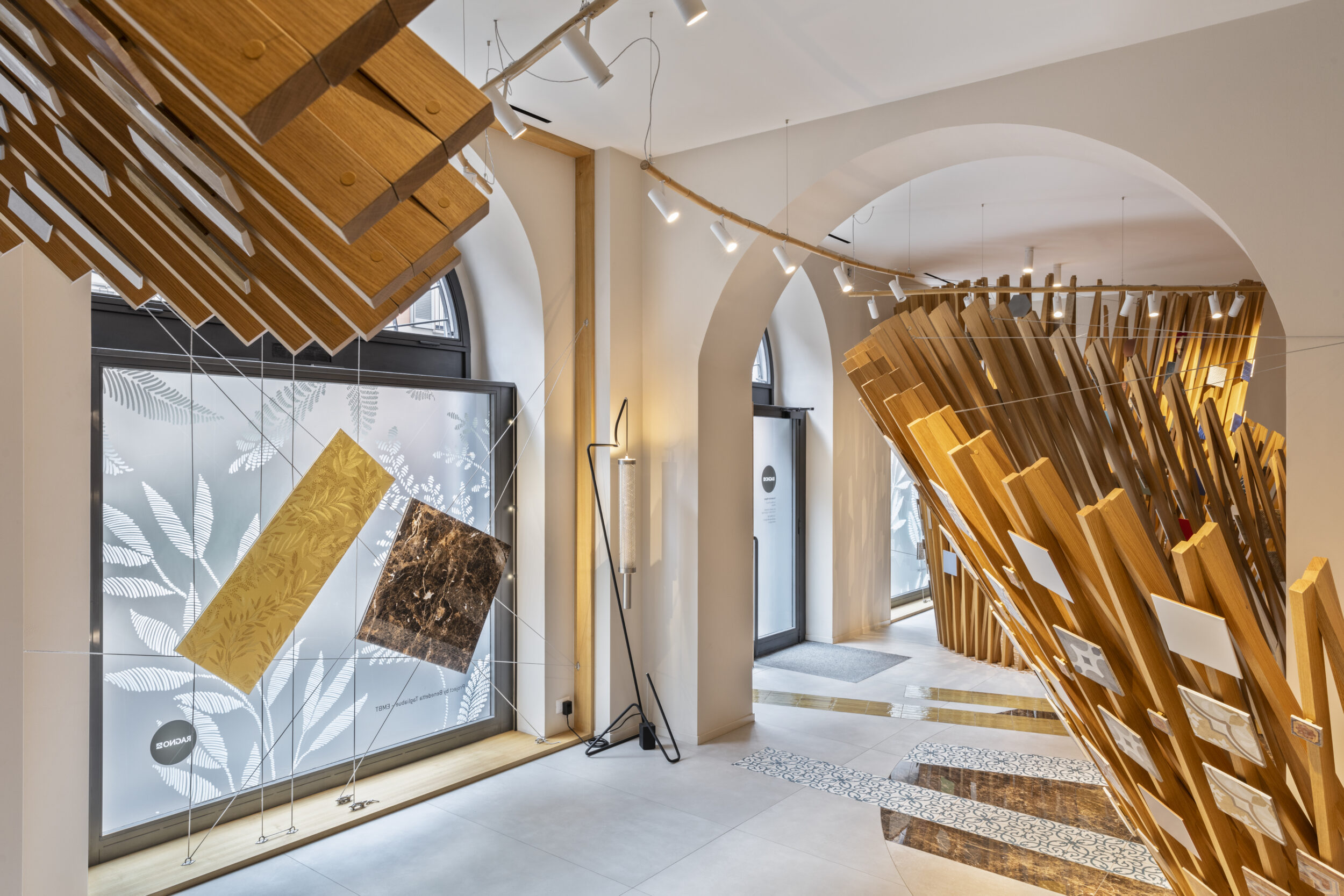 The project’s origins lie in the concept of the ‘spider’ (‘ragno’ in Italian), taken from the name and history of the company, which had a stylised spider as its first logo to symbolise industriousness and craftsmanship. The showroom design incorporates organic wooden geometric forms inspired by spider webs. Featuring a long succession of arches that define the rooms, the space presents the ceramic and stoneware collections through a novel display format that showcases a variety of ceramic materials available to designers and private individuals, suggesting exclusive combinations of the different surfaces in the range. Materials and furnishings have been carefully selected and combined with warm lighting and neutral tones, highlighting the ceramic tiles as works of art, complemented by custom-made furniture.