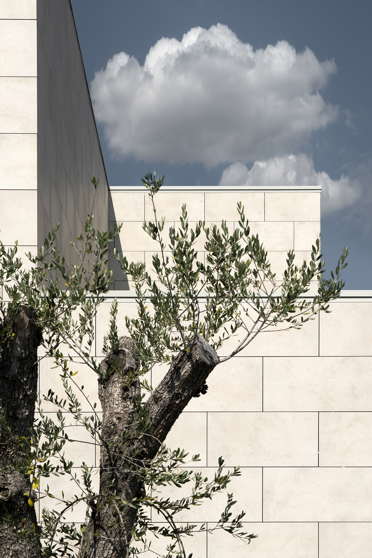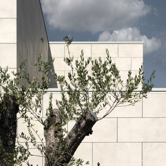 The Residence is clad with a ventilated wall 500 m2 in area, constructed using Ragno Realstone Jerusalem Avorio porcelain stoneware slabs, Structured finish in the 60×120 size.