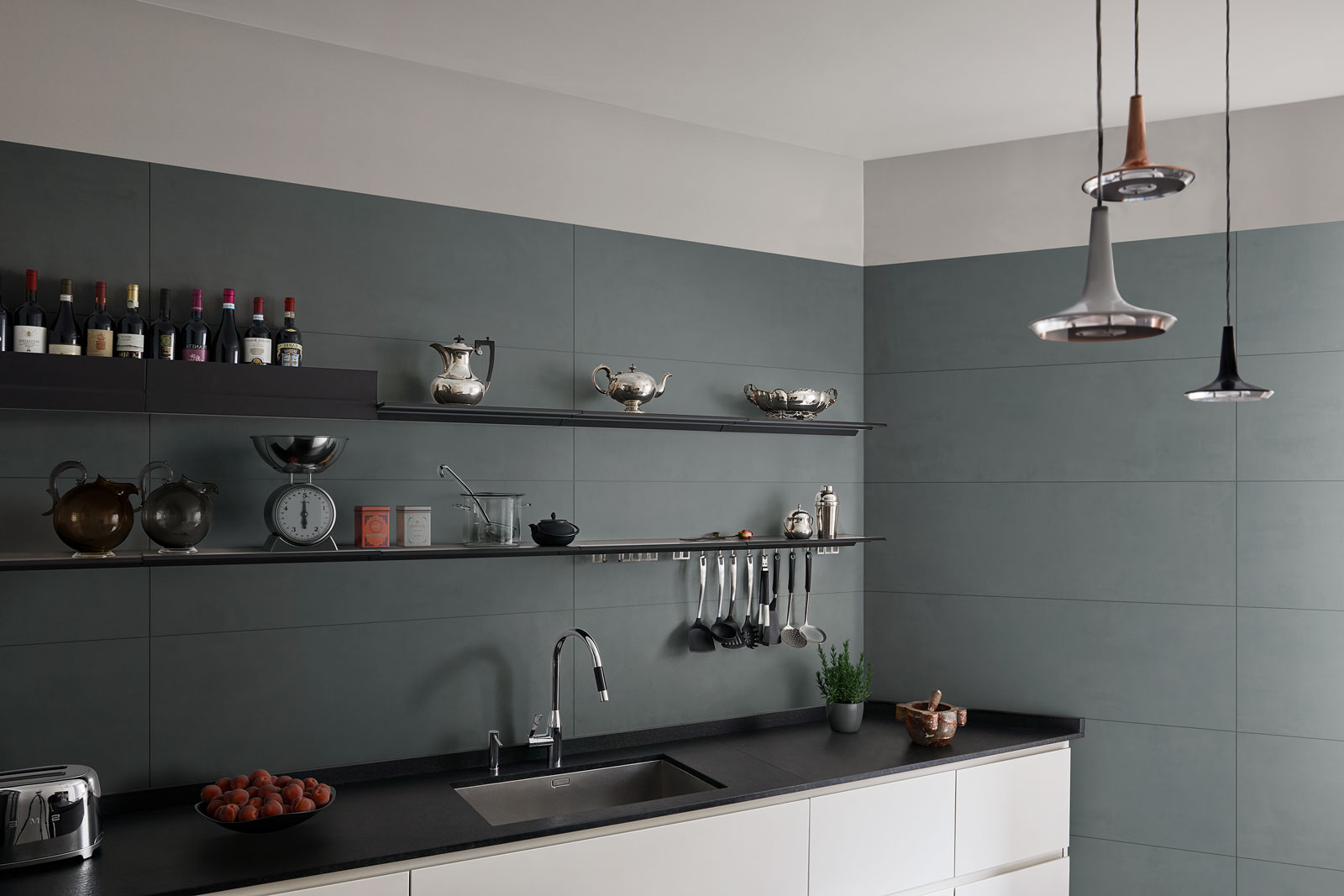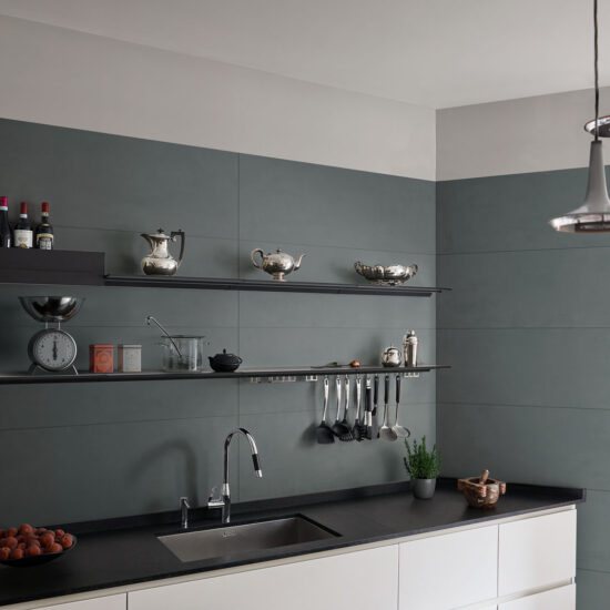 This reinterpretation of resin in ceramic form translates into large yet thin slabs: 40×120 cm and just 6 mm thick. The colour palette of the tiles combines three warm shades with three cool shades: Avorio, Rosa and terracotta on one hand, Bianco, Grigio and Ardesia on the other, in ascending order of saturation.