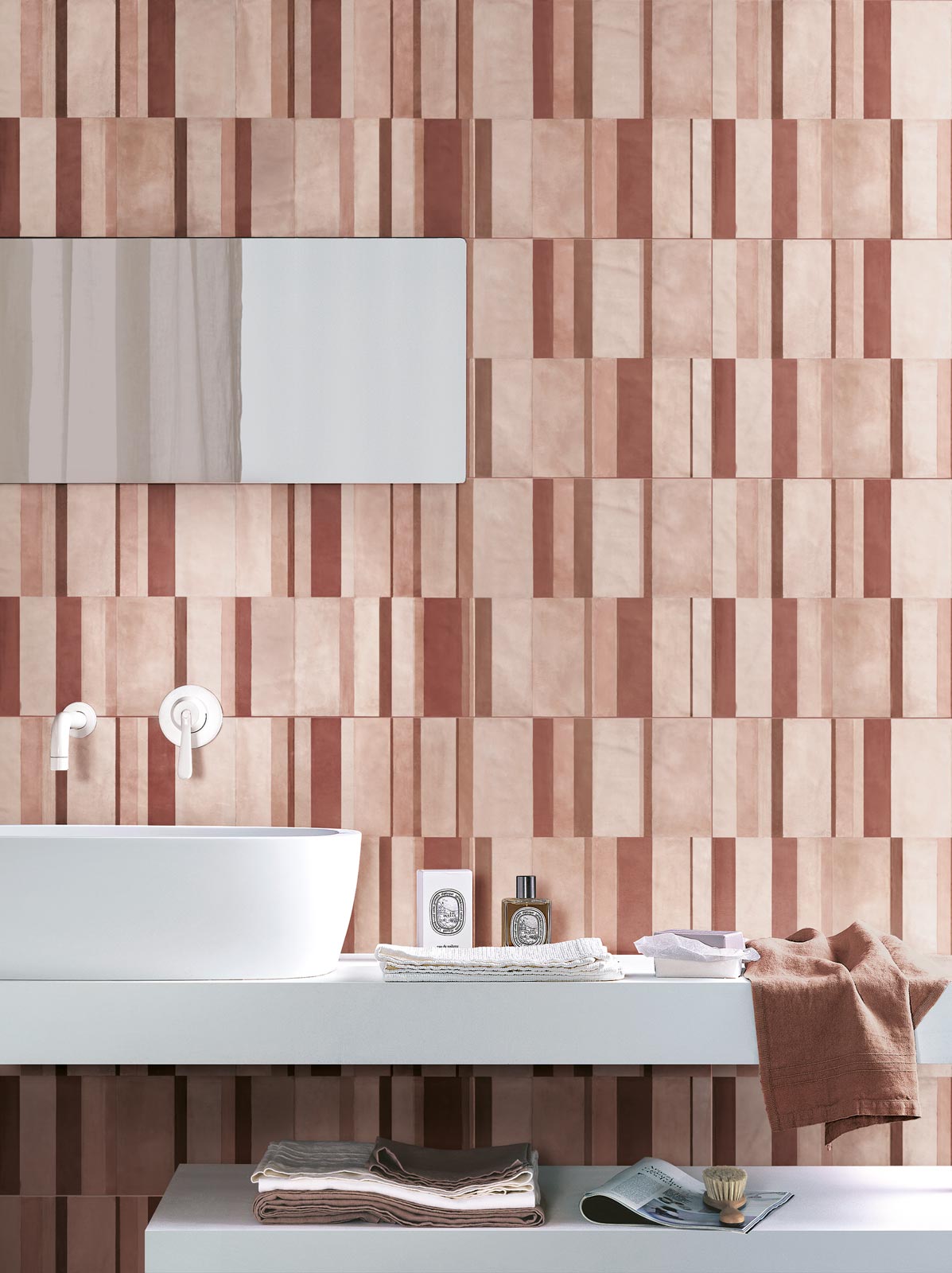 There are also decors and mosaics which have two distinct sources of inspiration: one more rigorous connected with geometry and colour contrasts, and the other softer and more evocative, based on botanical and textile motifs. The Venezia and Tropicana decors fall into this second category and are produced using the third firing technique while the digitally-produced Bricks plays around with clean lines and forms. The two mosaics, Classico and Forme, follow suit and come in all six of the base tile colour options.
