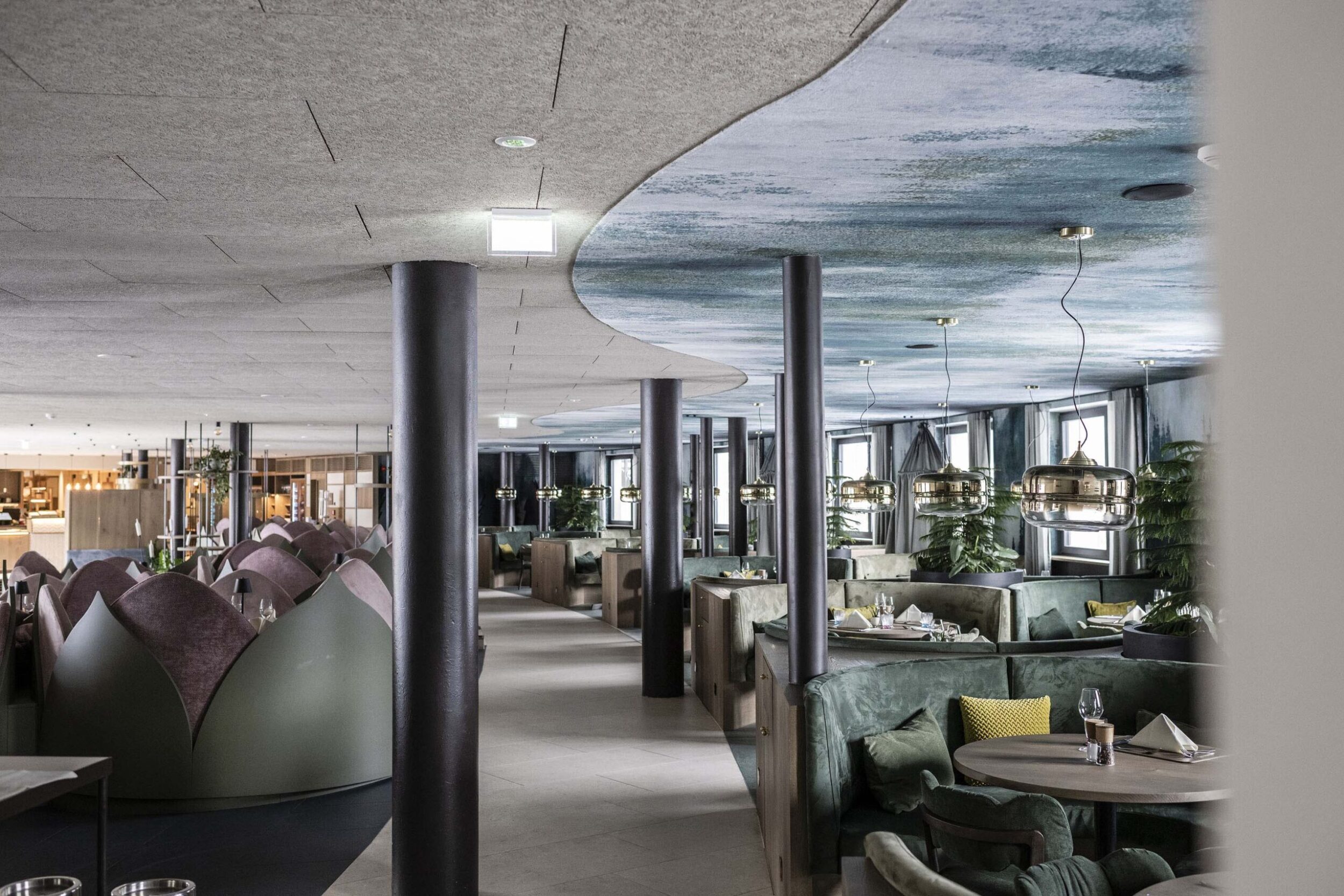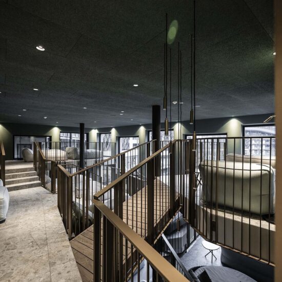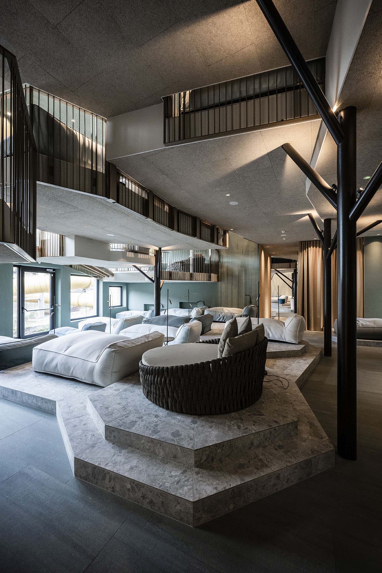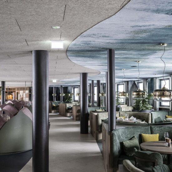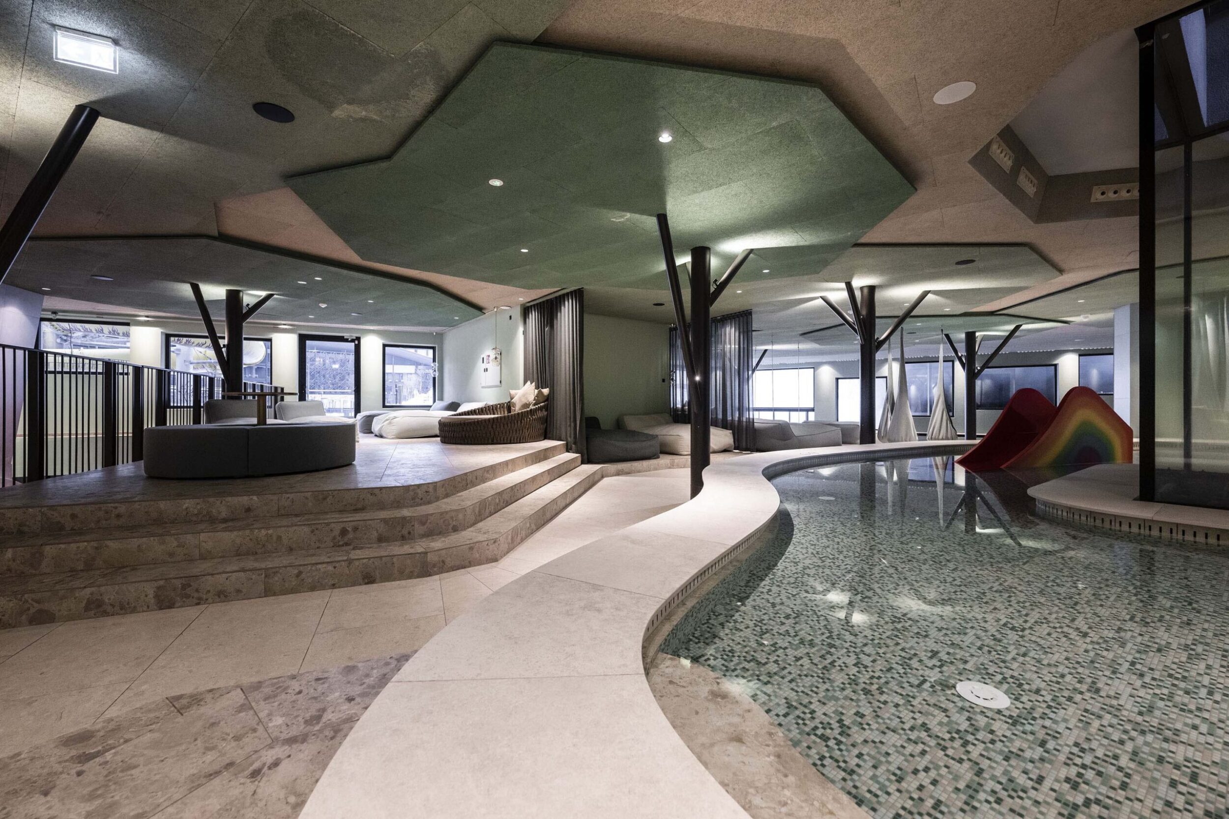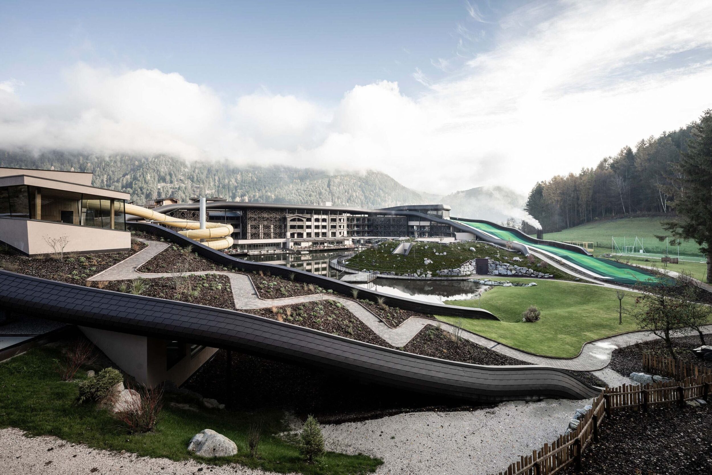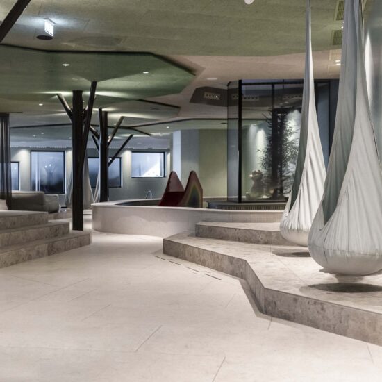 The Noa team set out to make the dreams of young guests come true, starting by revolutionising the appearance and function of the roof. No longer just a top for the building, it was transformed into an incredible reinforced concrete structure shaped in a wave sloping down at the sides, one side becoming a ski slope, a playground or just a pathway and the other providing a bobby car track and a small high-level adventure playground. This highly original, inventive, playful architectural idea also “lets nature climb onto the roof”, confirming the strong focus on the landscape.
