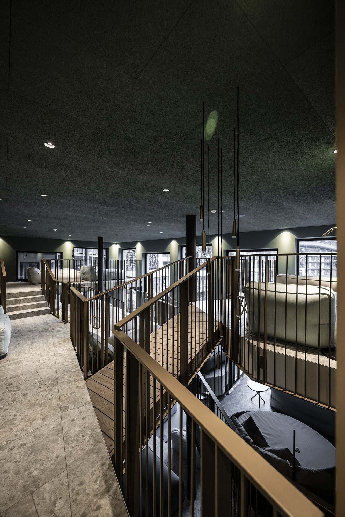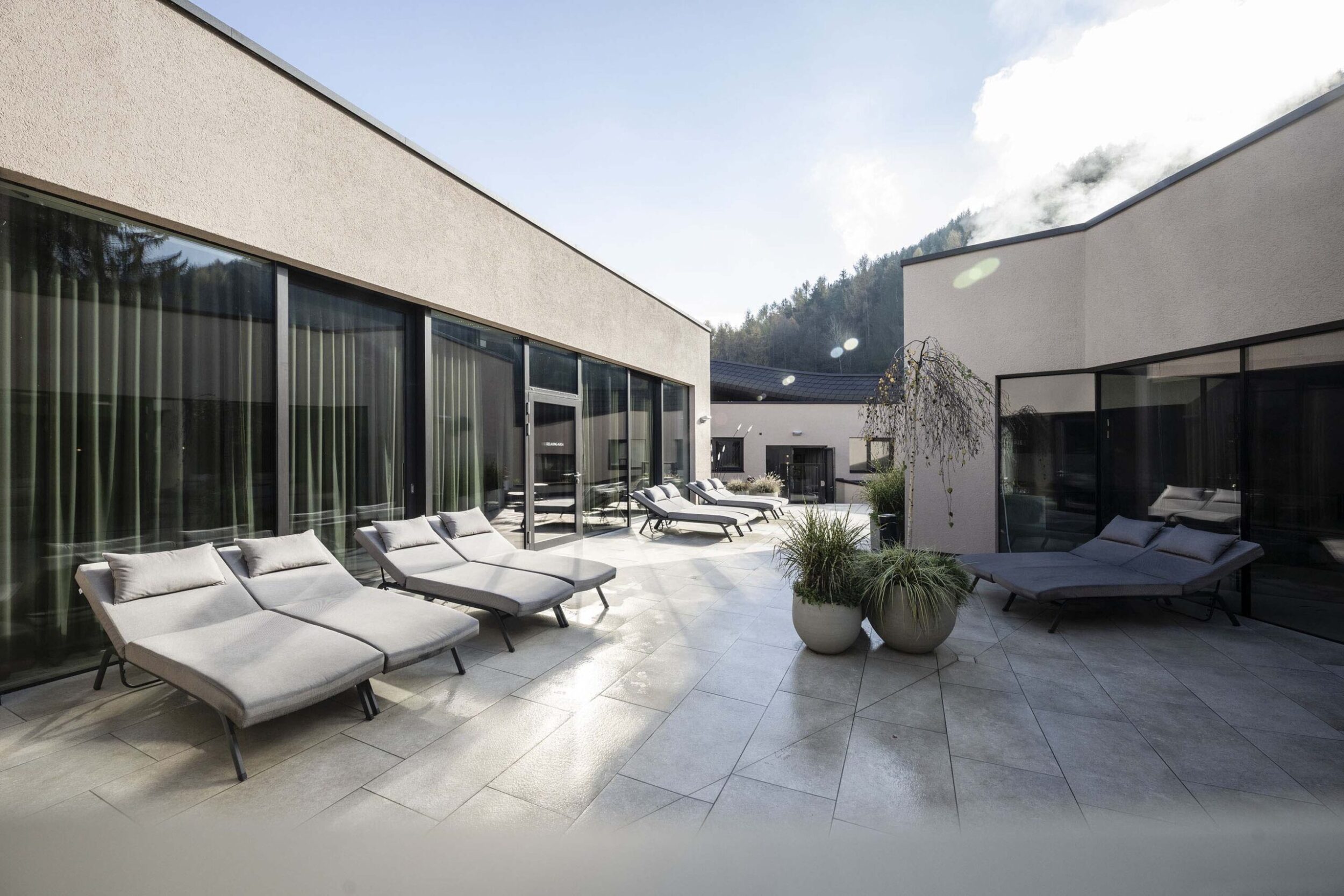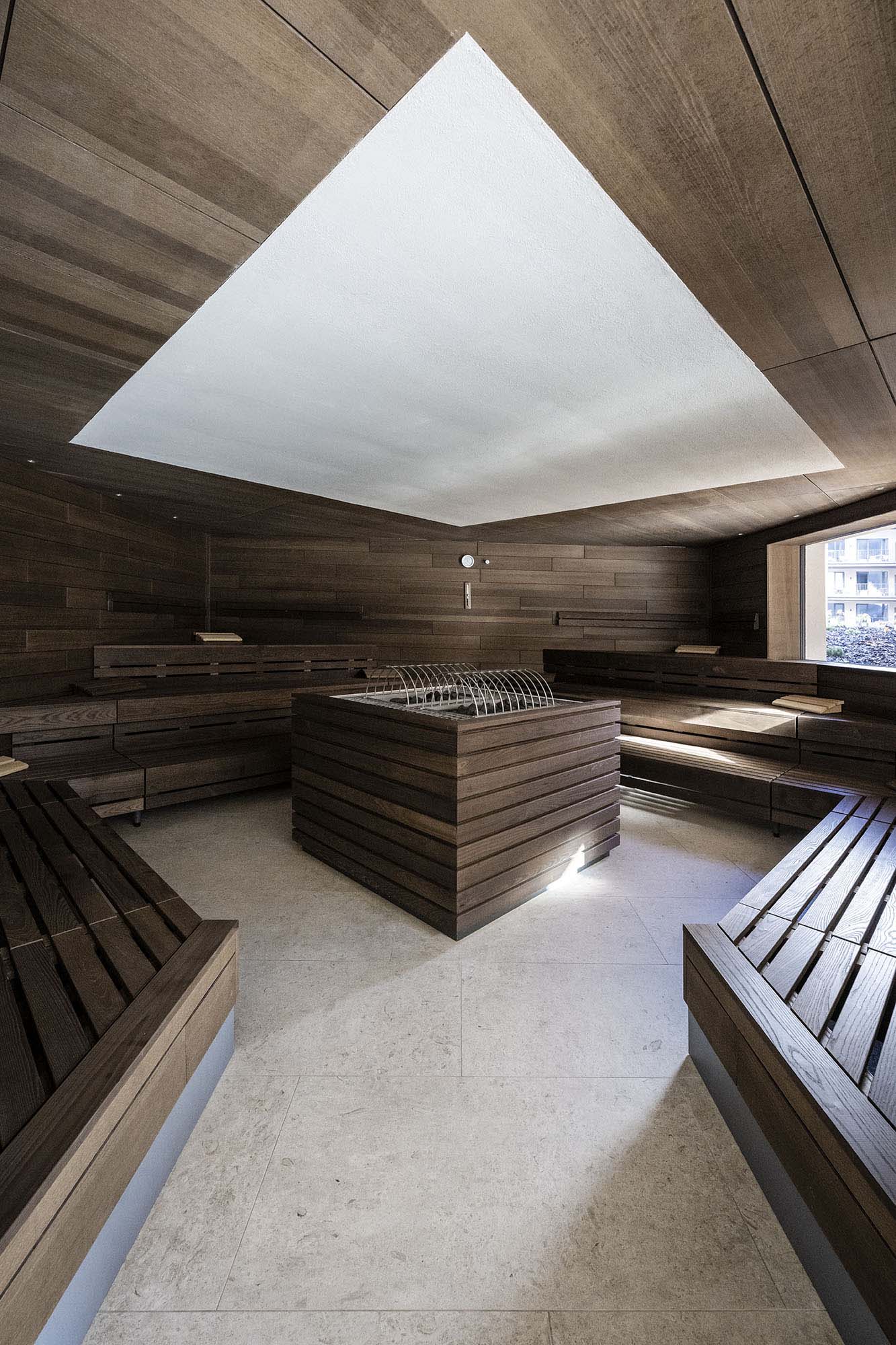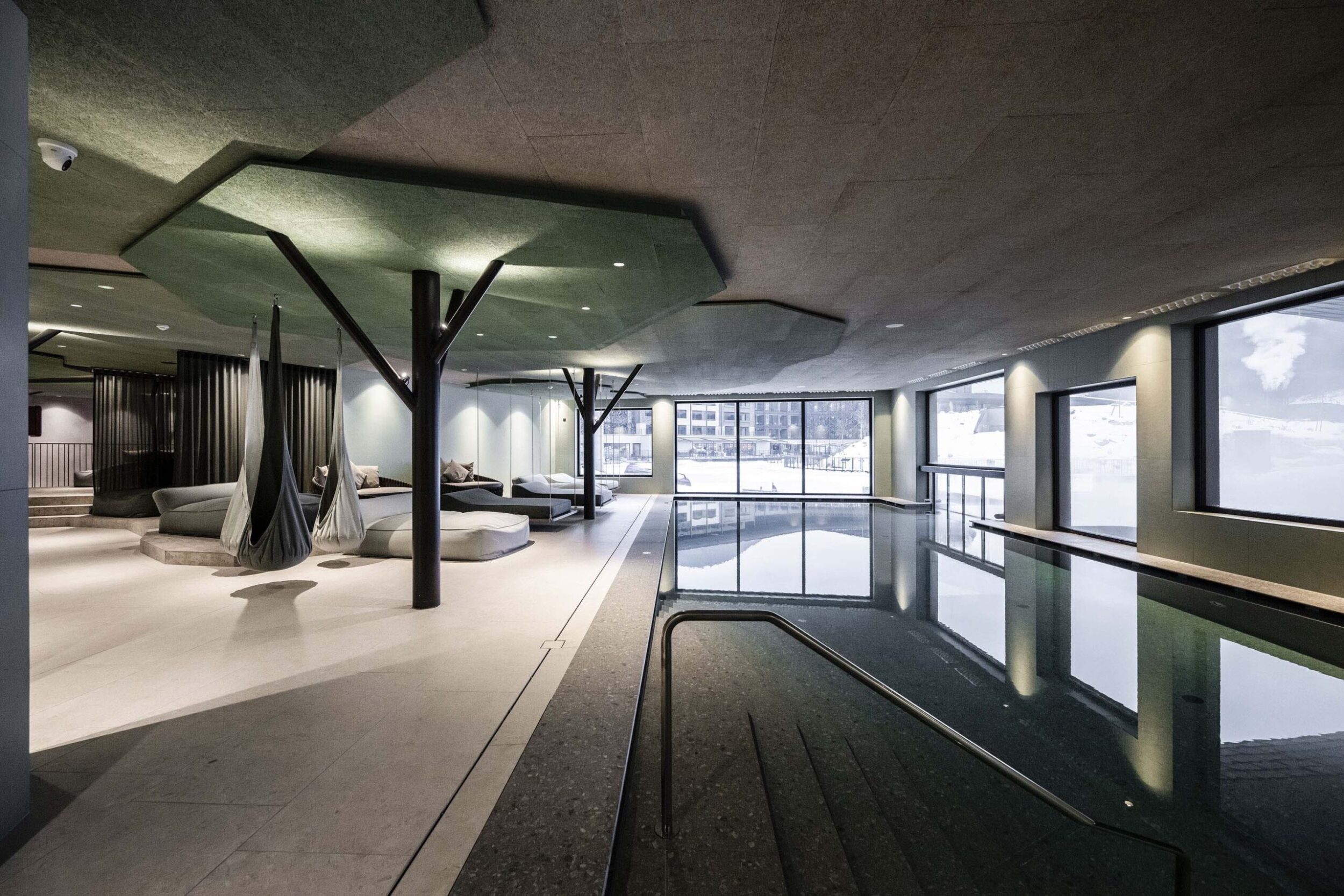 The zone around the large heated pool which extends outdoors – making this area particularly attractive in the winter months – is finished with natural Realstone_Navigli, a stone-effect stoneware (30×60 cm) with a high-tech surface featuring a very pleasant texture combined with impeccably anti-slip properties, while its outdoor area is defined by the warm, neutral shade of the Realstone_Jerusalem XT20 Noce variant in 50×100 cm size and 20 mm thickness. Also outdoors, the communal relaxation areas are paved with the elegant, understated, frostproof Season porcelain stoneware.