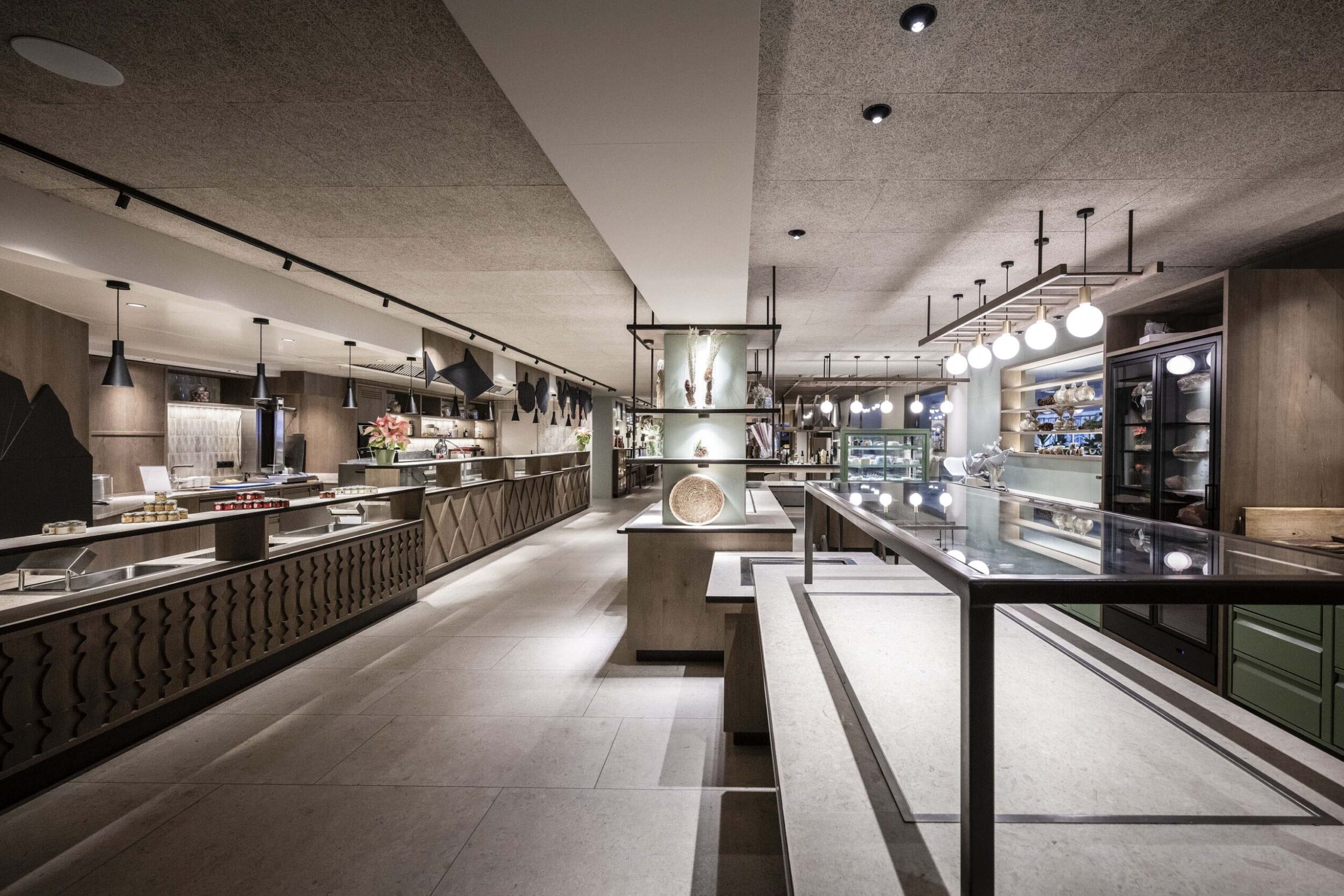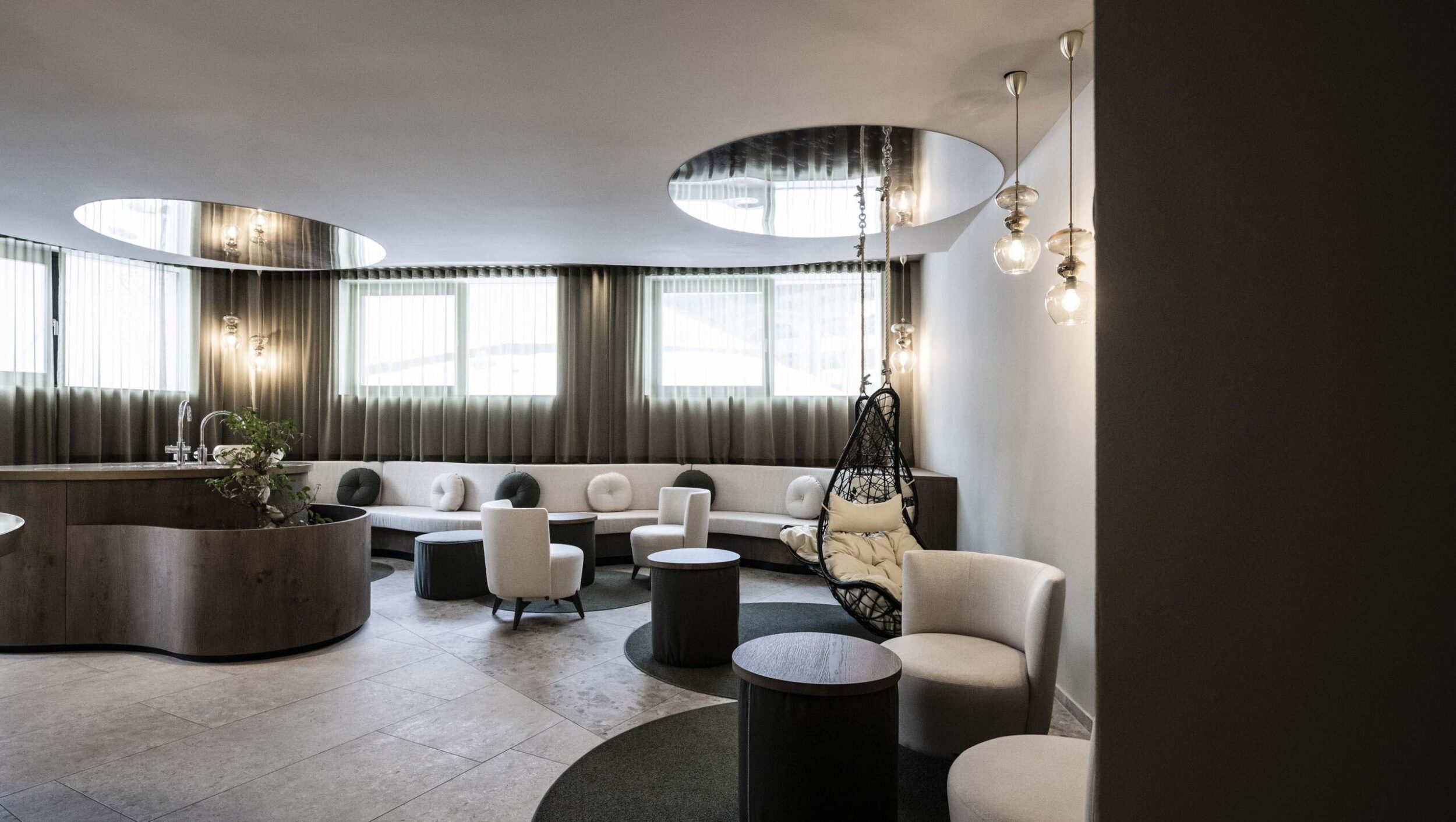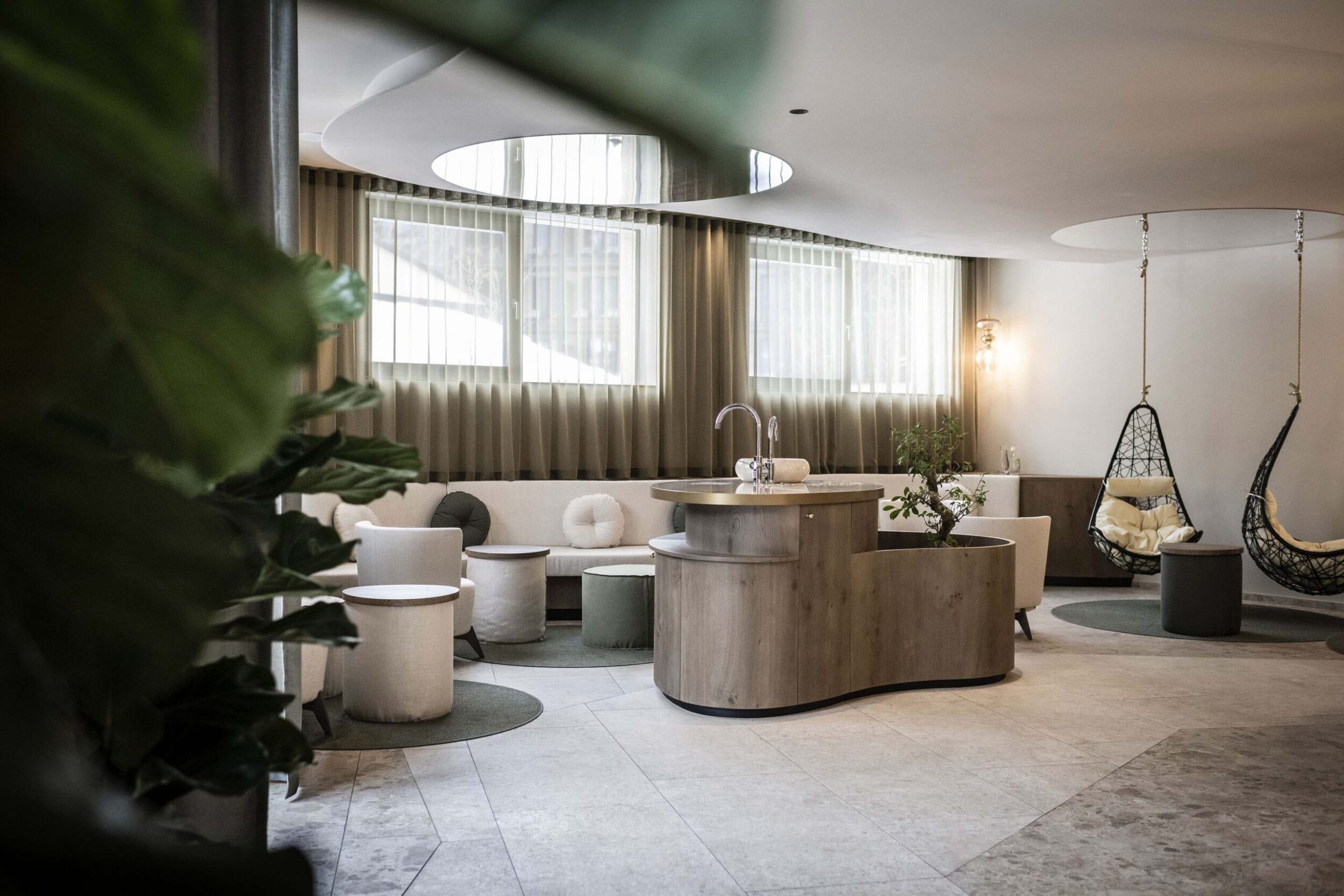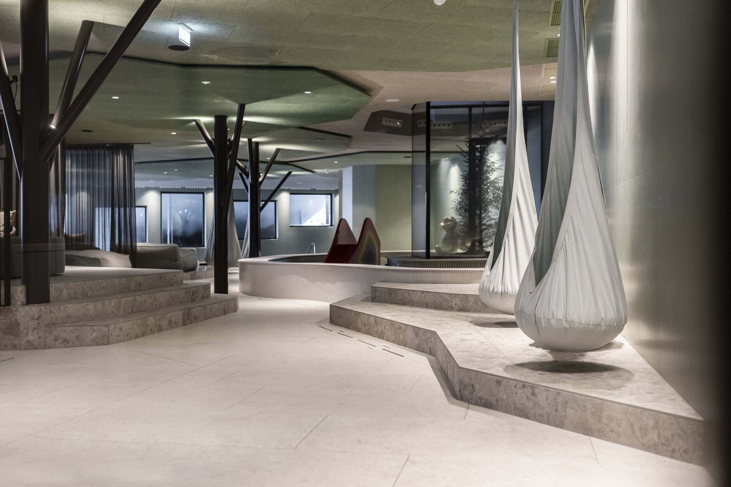 Given this resort’s high degree of attention to its guests’ needs, it of course includes a large, unusual Spa, designed with pillars/trees that evoke the idea of woodland and nest-like seats that hang from the ceiling, with obvious references to the surrounding natural environment. Here the Ragno materials’ antibacterial and anti-slip properties and durability are fundamental. The Eterna stone-effect series is widely used in the many texture variants (Arena, Mix Beige, Mix Gris) with continuity between indoors and outdoors.